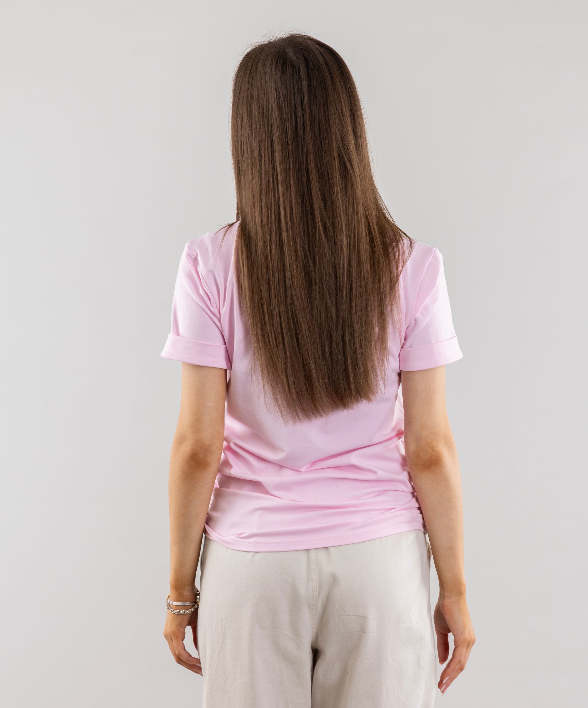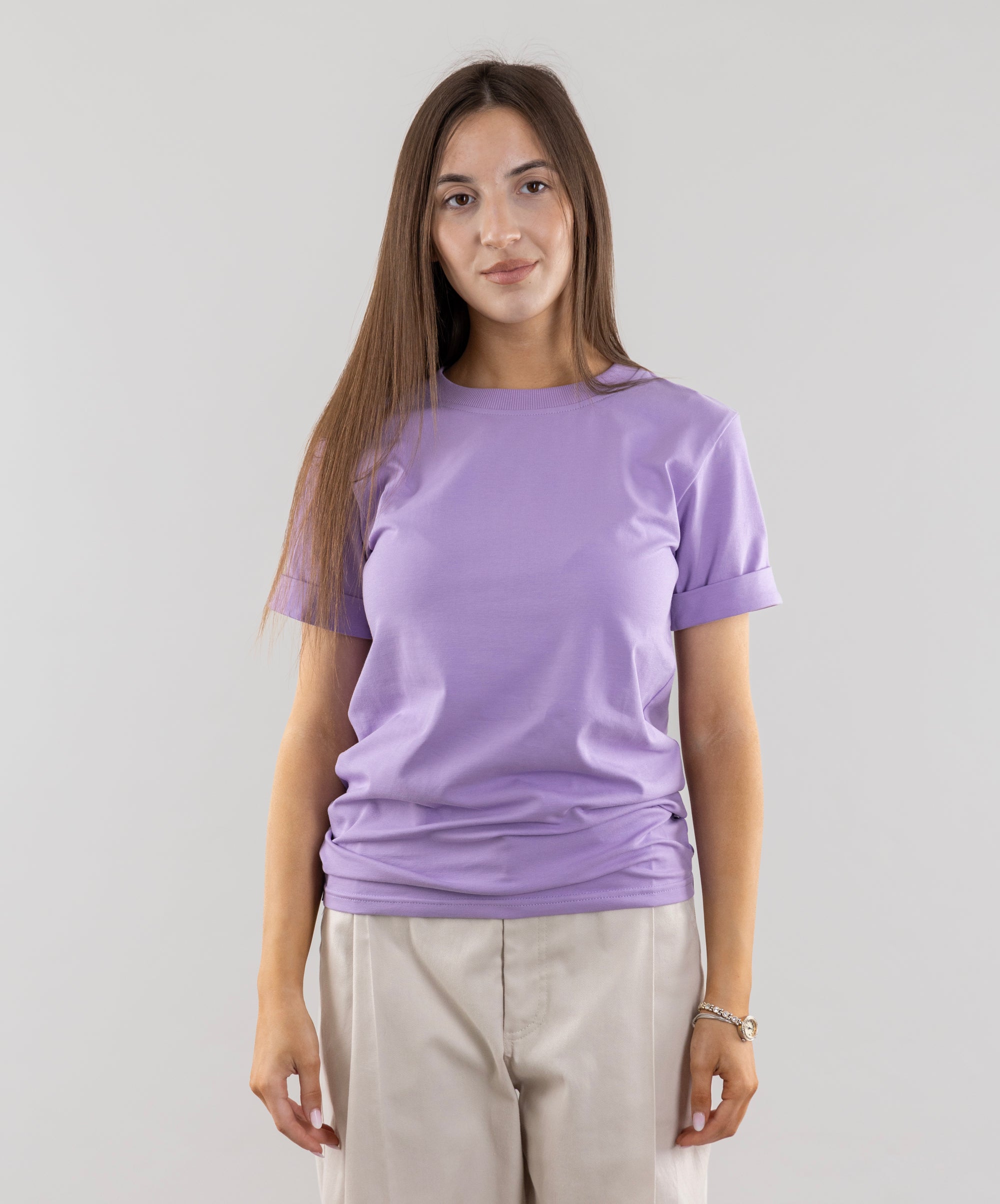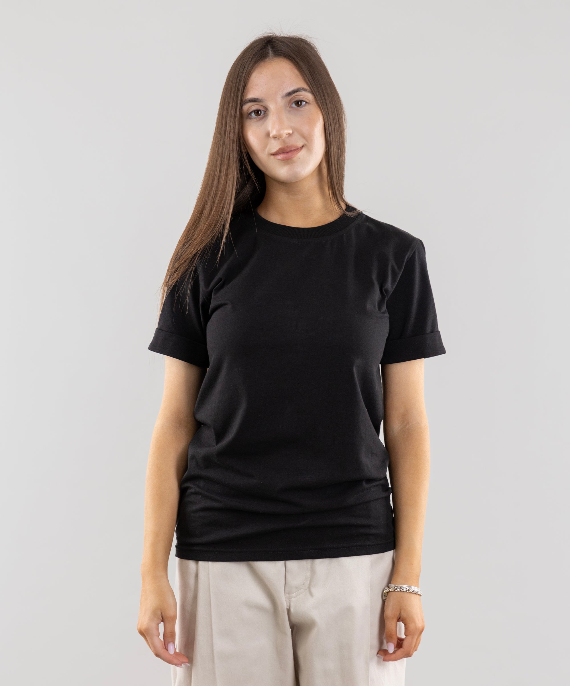 Basic T-shirt with cuffs on the sleeves is a classic for your wardrobe. Everything in this model is very restrained and clear: a strict and classic style, impeccable tailoring, high-quality and durable fabric, and a basic set of colors.