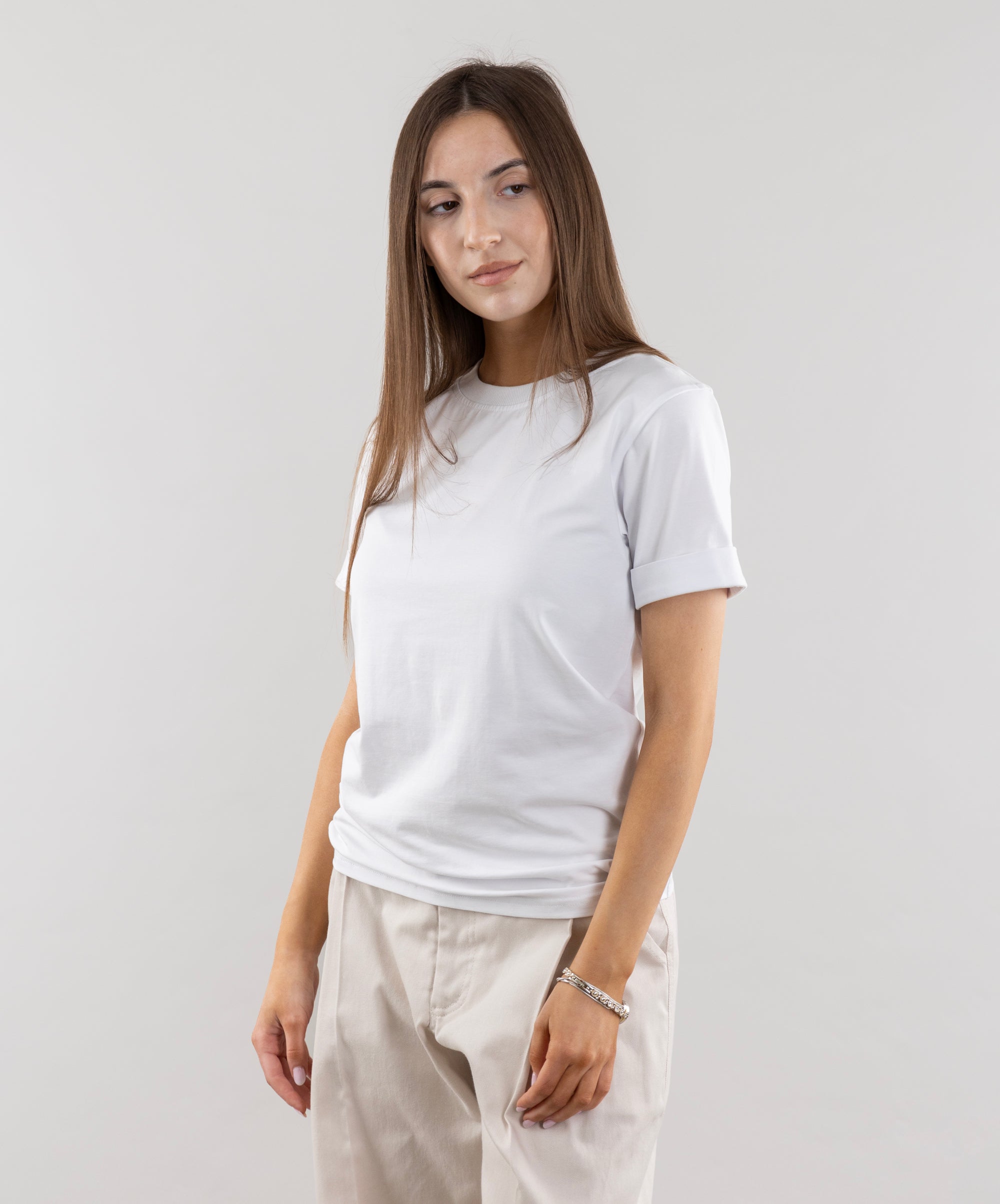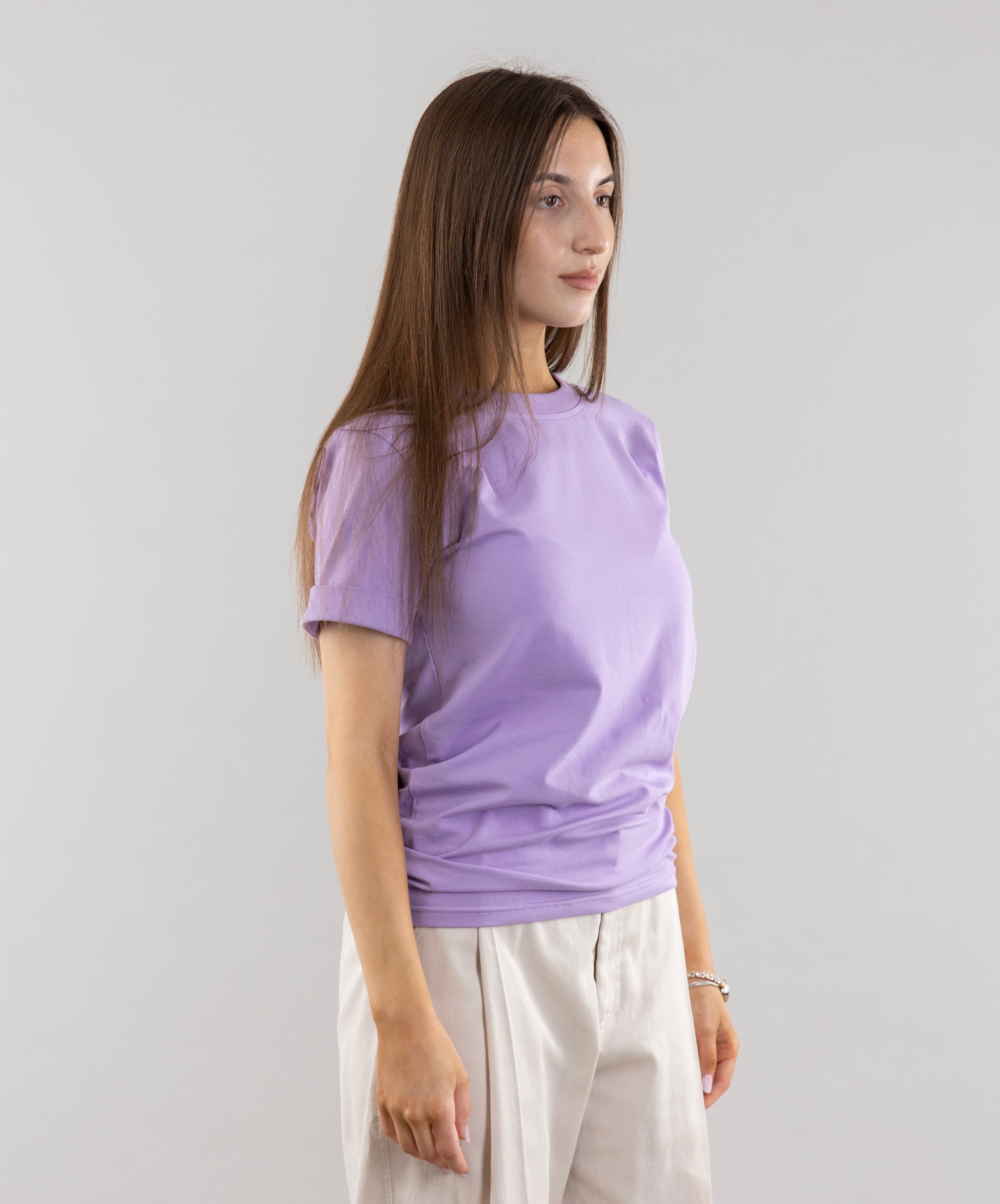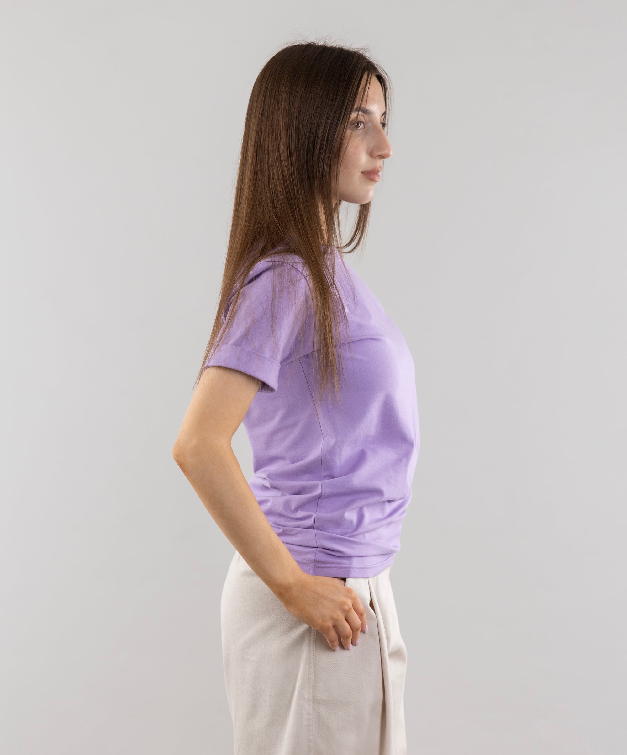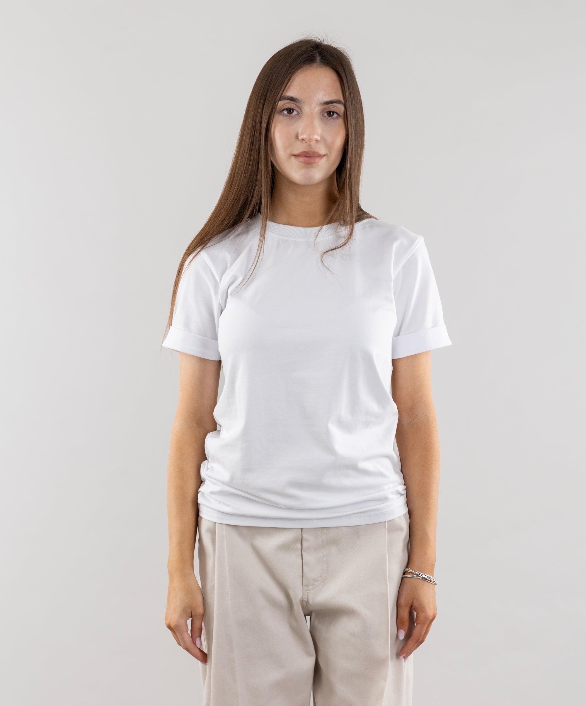 Basic T-shirt with cuffs on the sleeves is a classic for your wardrobe. Everything in this model is very restrained and clear: a strict and classic style, impeccable tailoring, high-quality and durable fabric, and a basic set of colors.