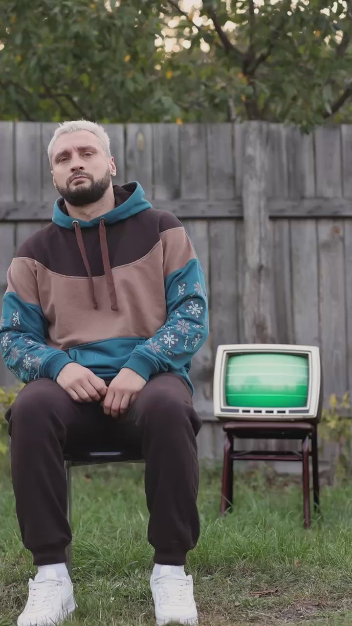We have long dreamed of creating a hoodie with embroidery, so meet the “Dnipro” model. This unlined hoodie combines three colors, has large embroidery on the sleeves, and a kangaroo pocket.