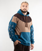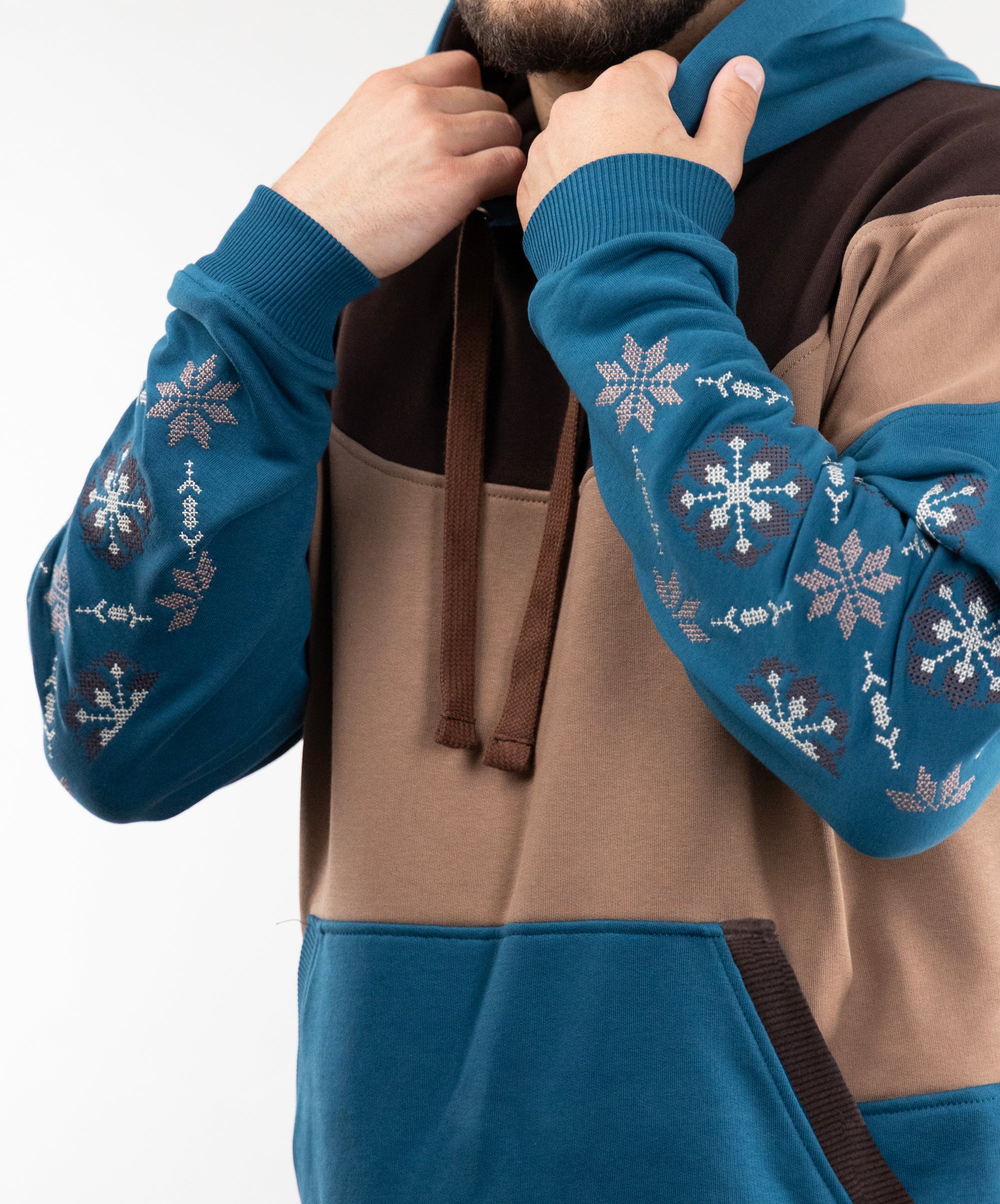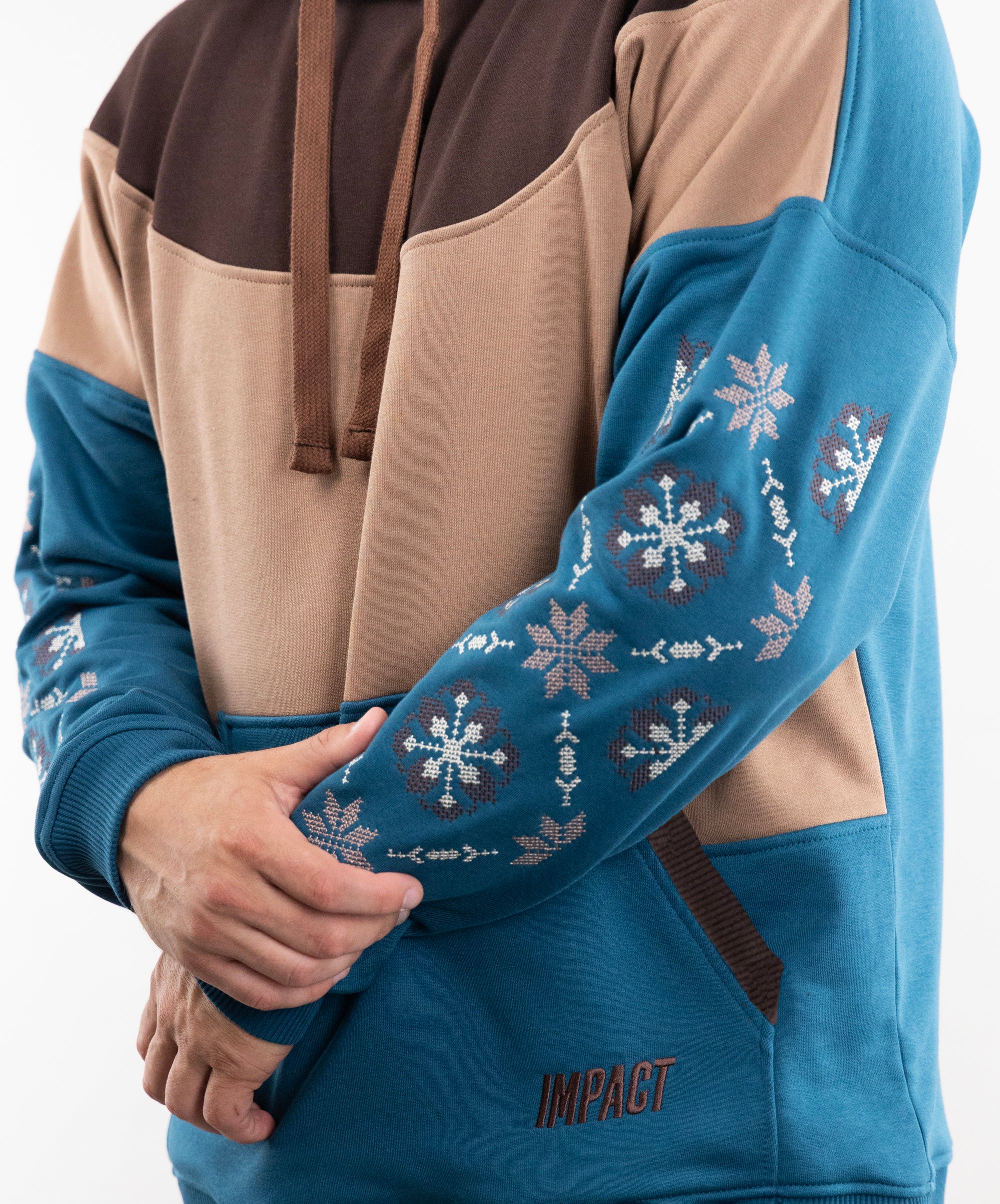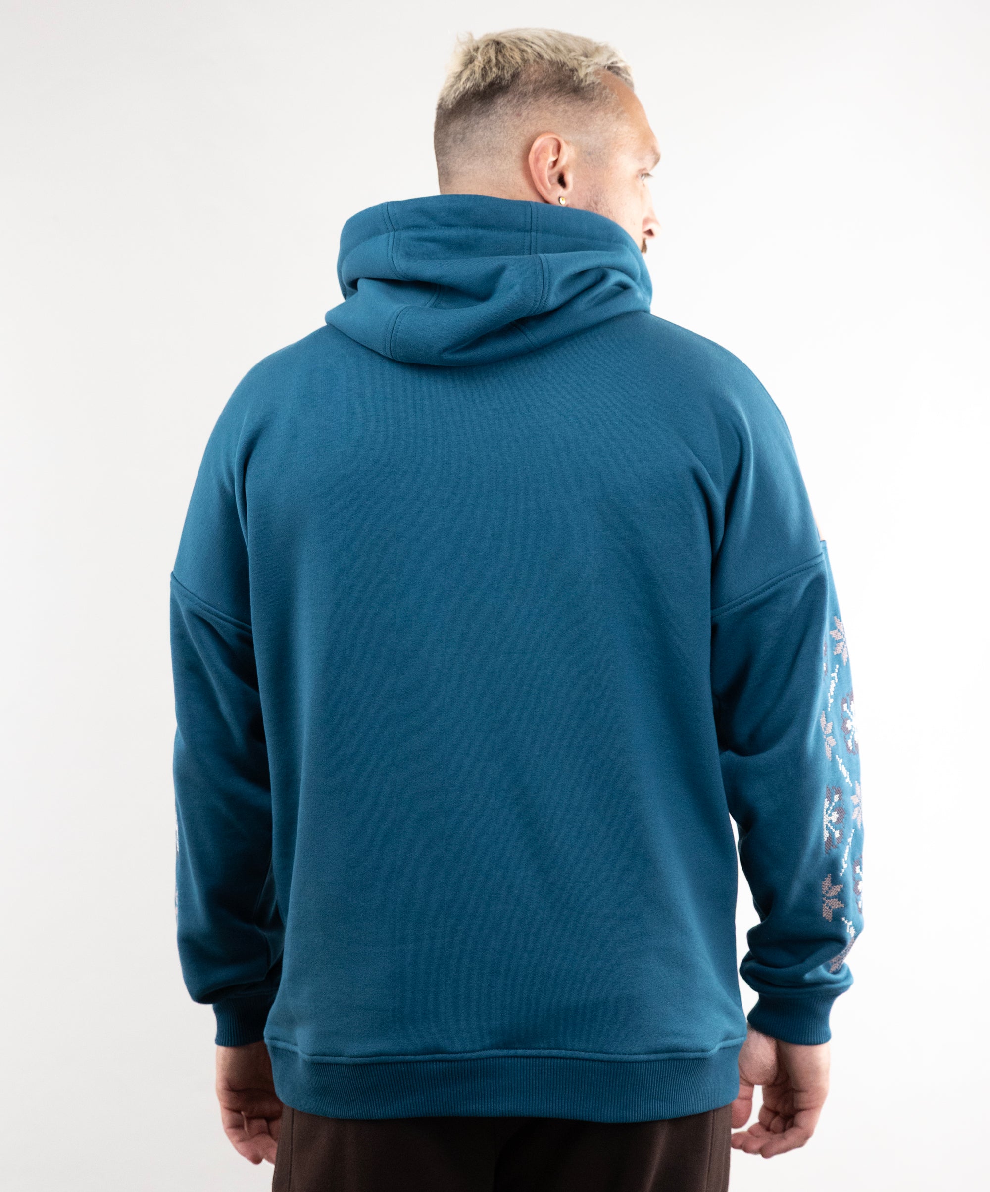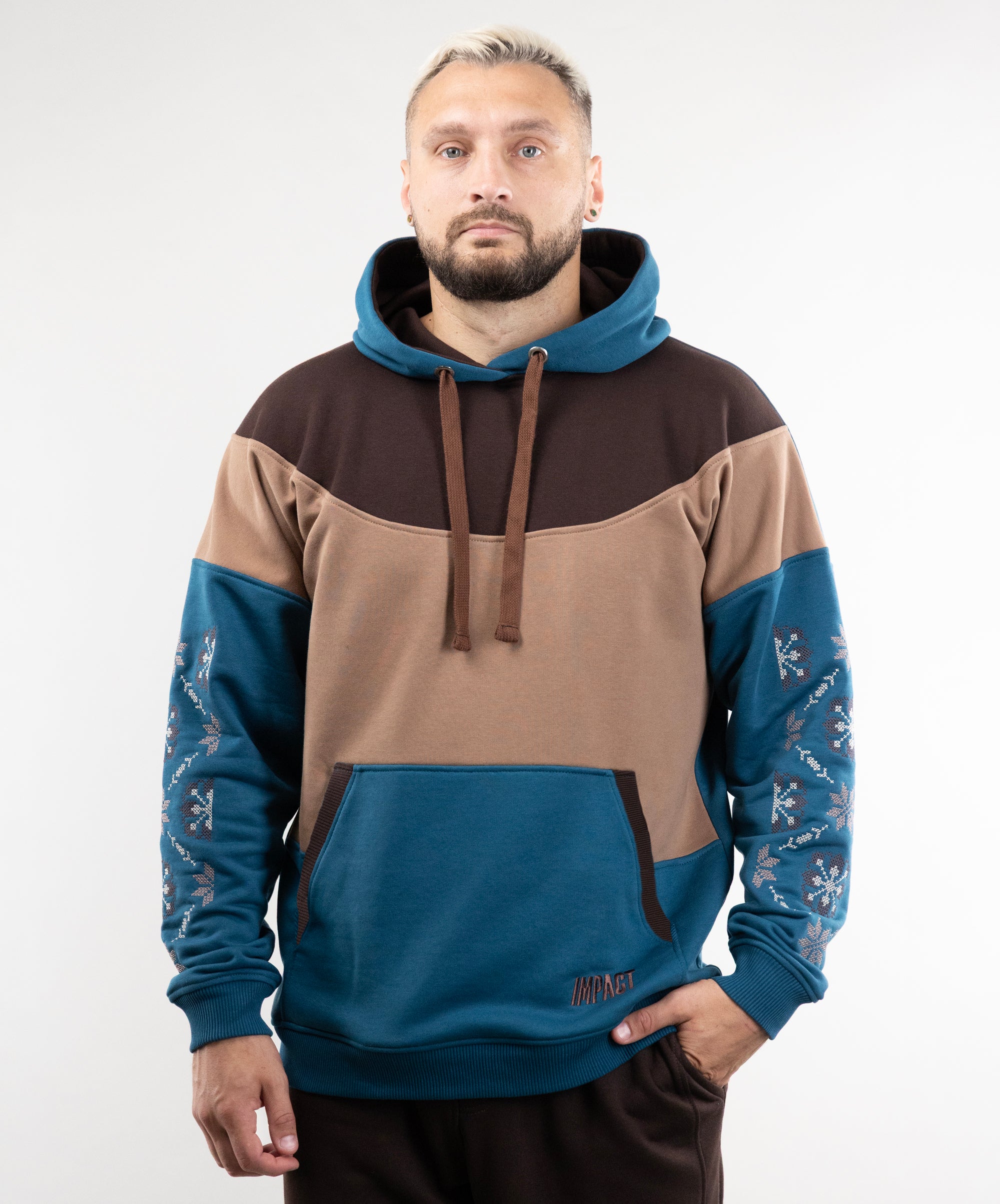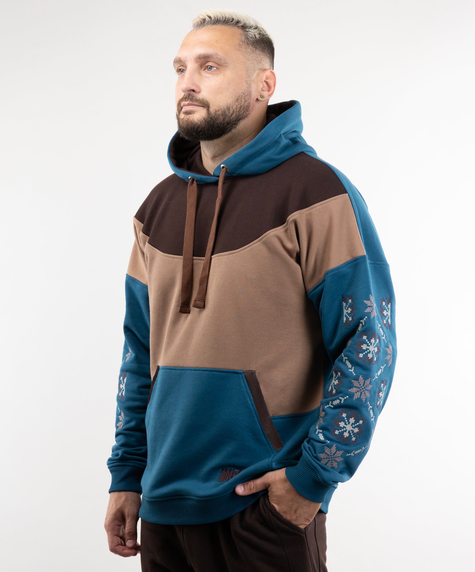 We have long dreamed of creating a hoodie with embroidery, so meet the “Dnipro” model. This unlined hoodie combines three colors, has large embroidery on the sleeves, and a kangaroo pocket.