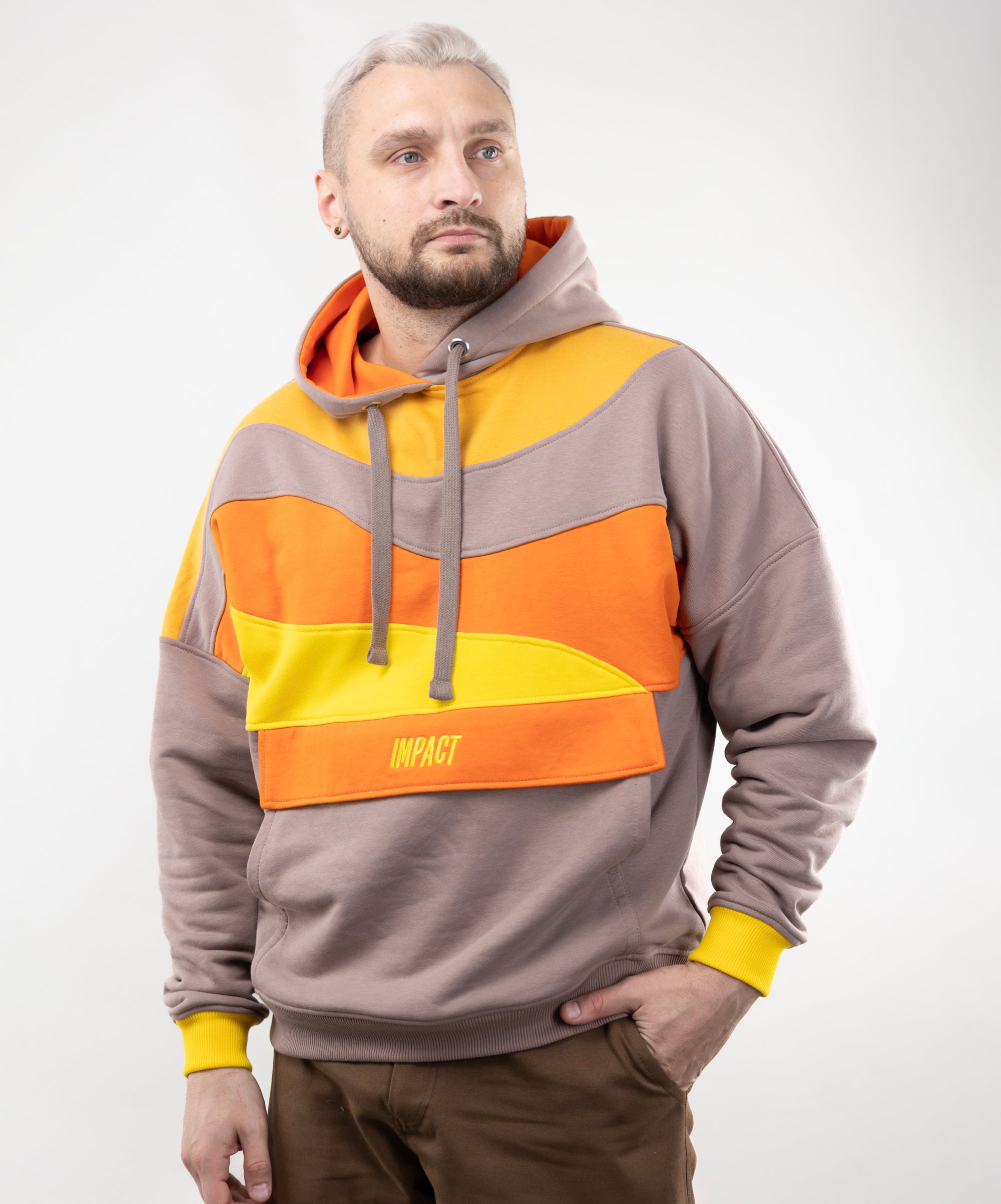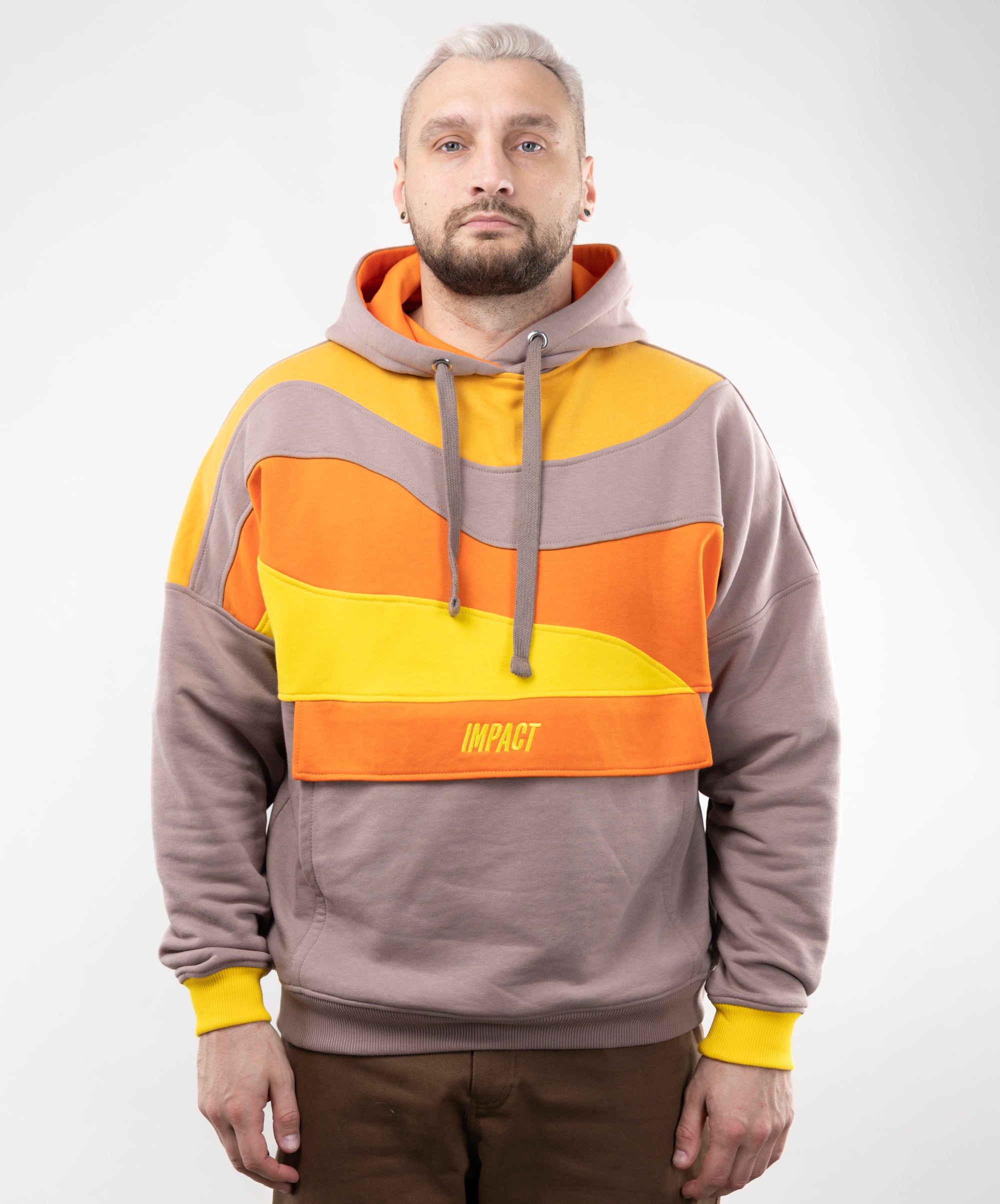 Bright and unusual - this is our new Hoodie "Fanta". There is a wavy pattern on the chest made from a combination of fabrics, a kind of patchwork.