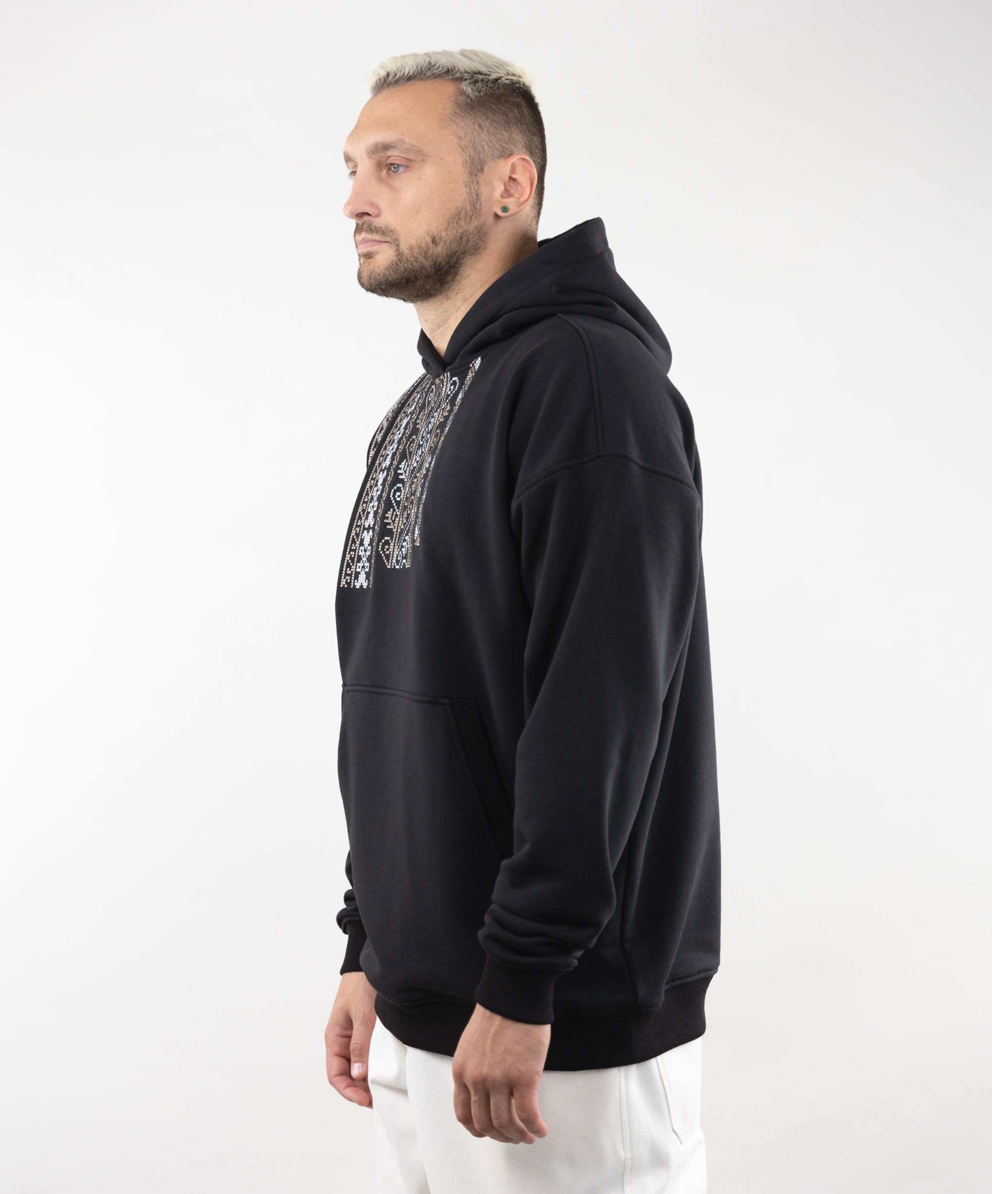 Meet the Hoodie Vyshyvanka, a perfect mix of tradition and everyday comfort. It is inspired by Ukrainian embroidery and features a unique black-and-white pattern on the front. This hoodie is durable, soft, and comfortable made from three-thread fleece without a warm underlay. Plus, it doesn't peel, so it stays looking great.