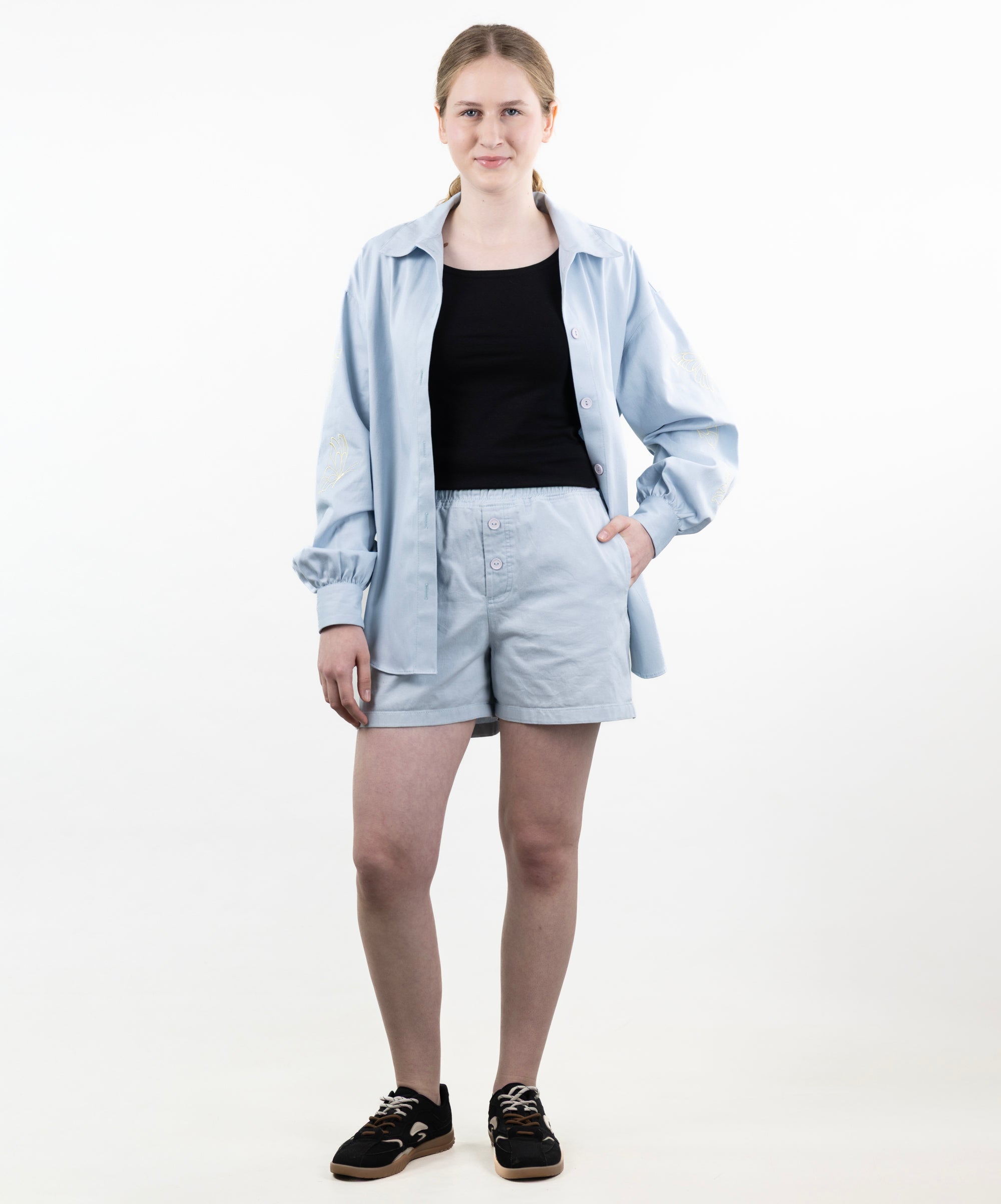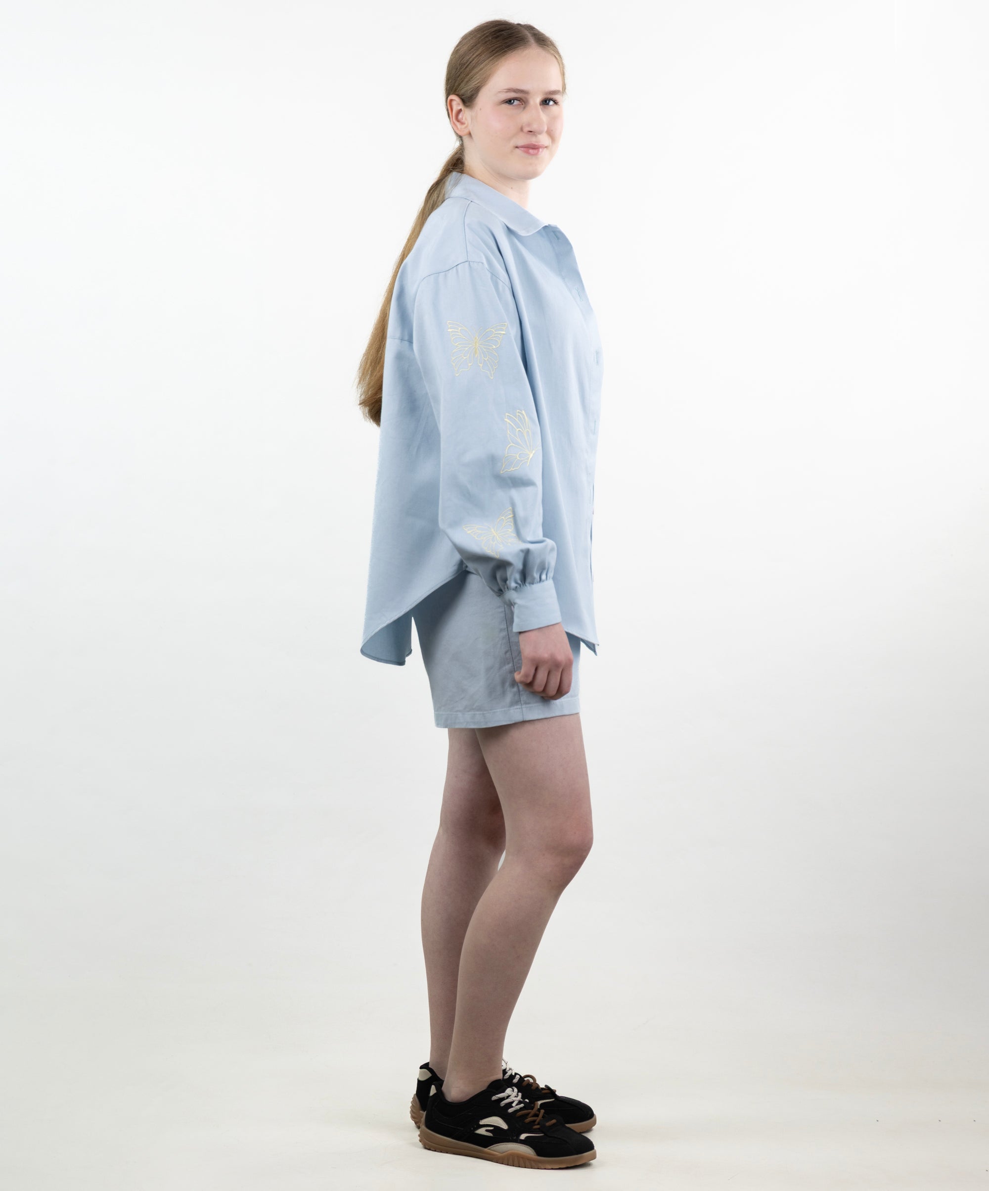This shirt that immediately attracts attention with its delicacy and elegance. It is made of lightweight 100% cotton, which is pleasant to the body and ideal for warm weather. The restrained blue color combined with butterfly embroidery on the sleeves creates a sophisticated but expressive look.