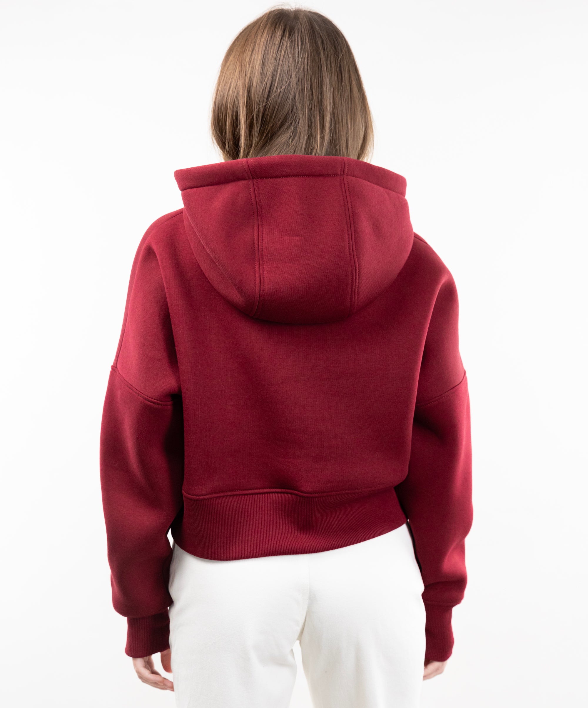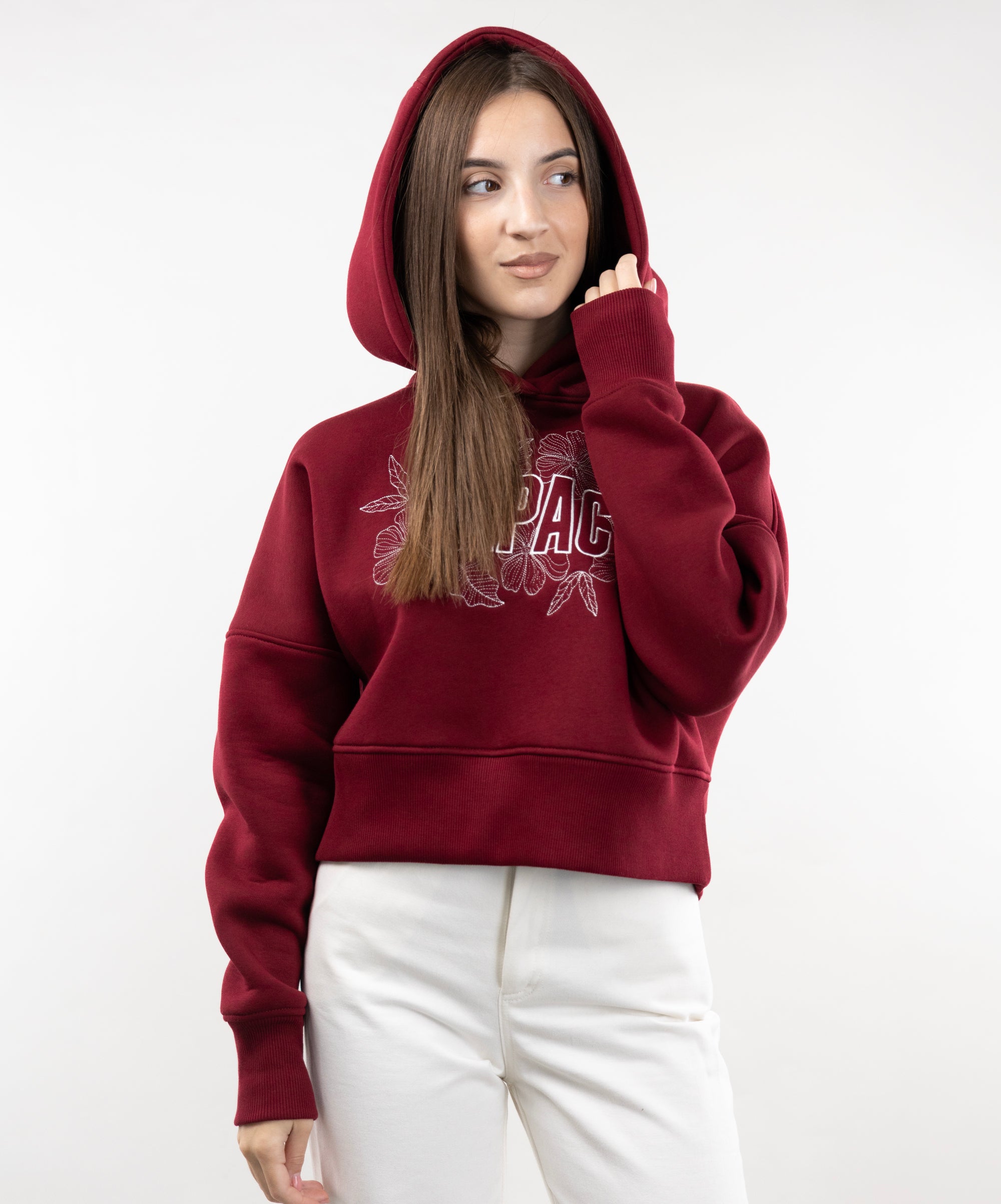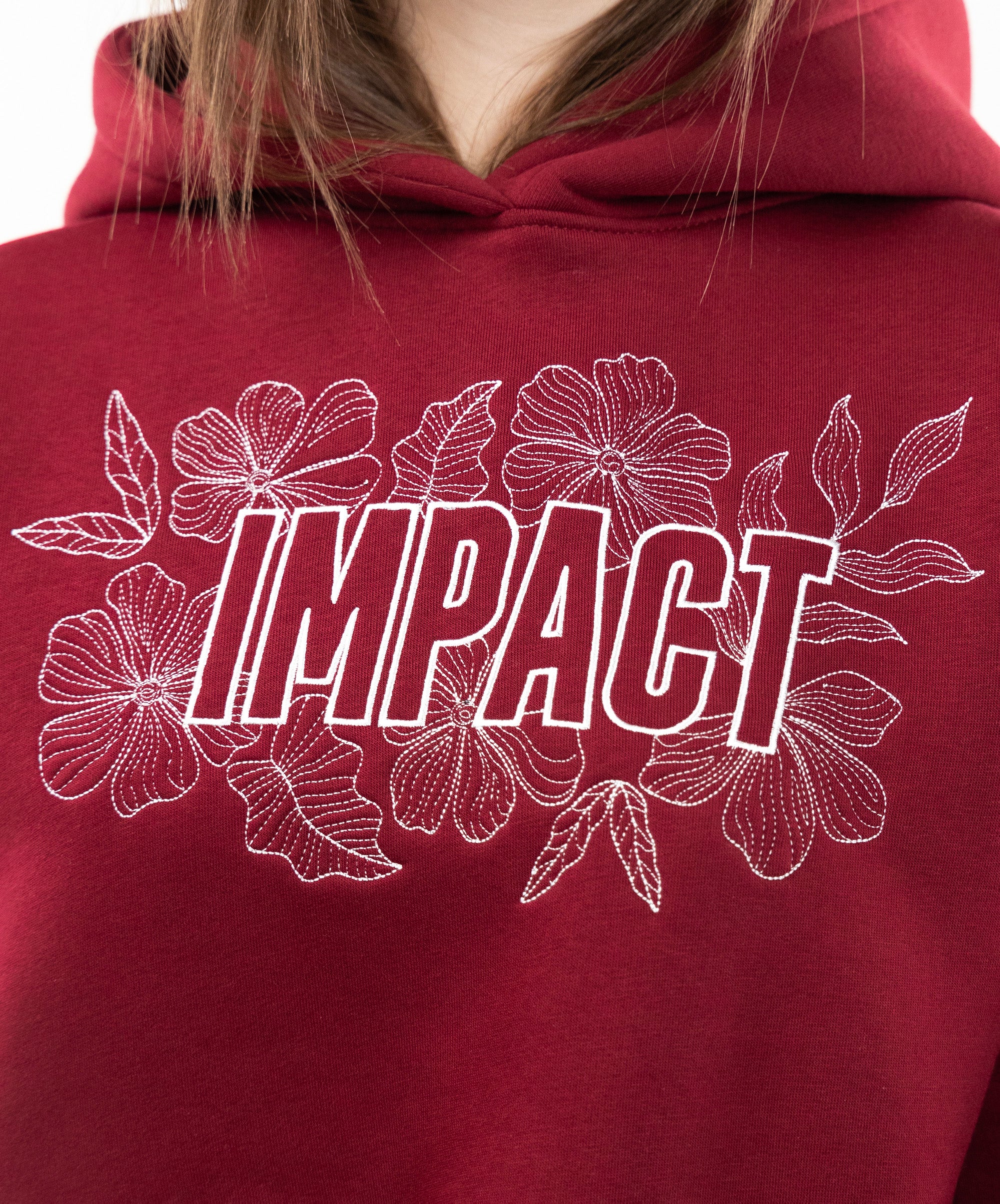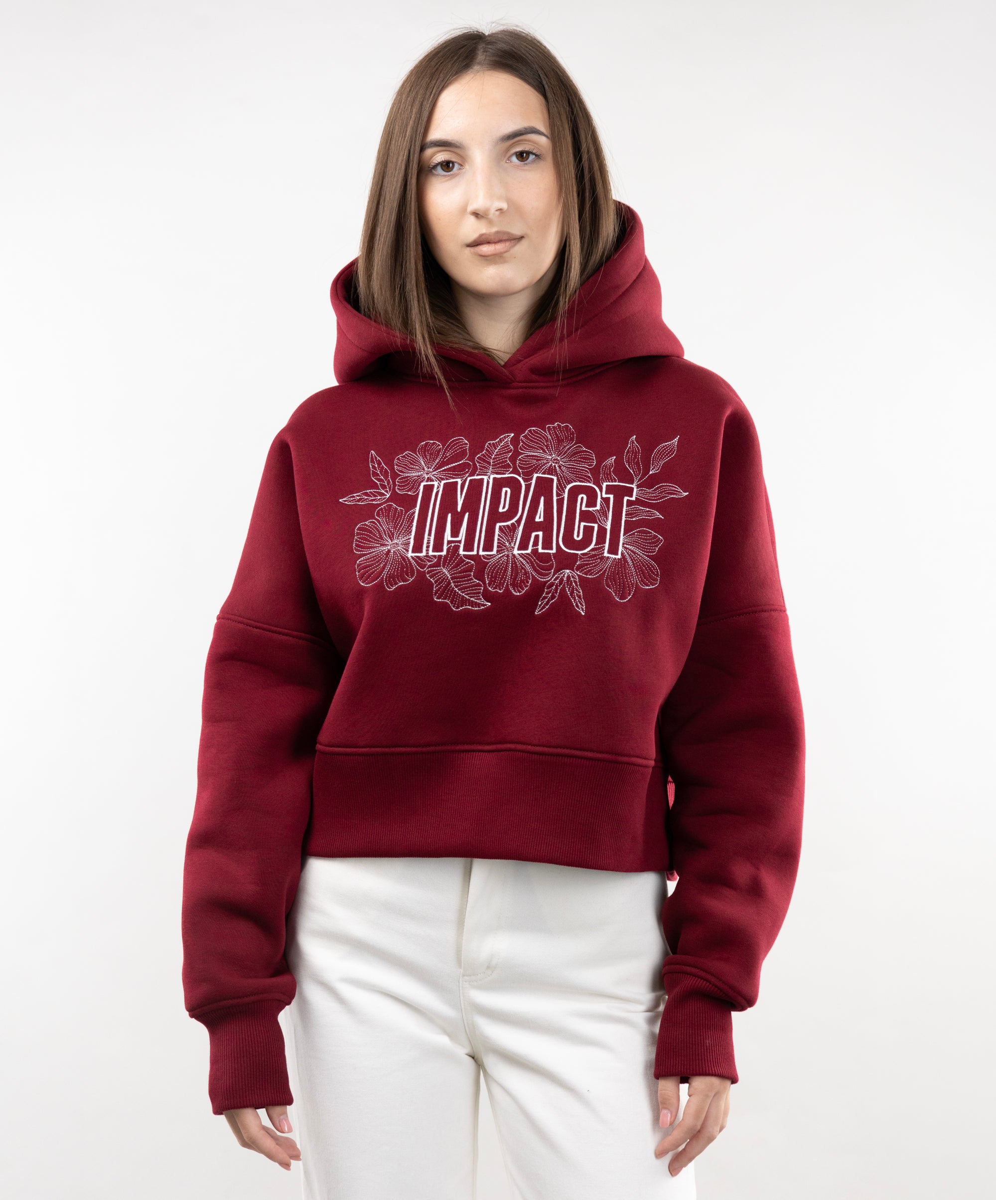 Warm crop hoodie with pile on the back. Warm, soft fabric for the cold season. Hoodie style: loose silhouette, dropped shoulder, crop length. The chest is embroidered with the Impact logo. The most trendy color of the fall season!
