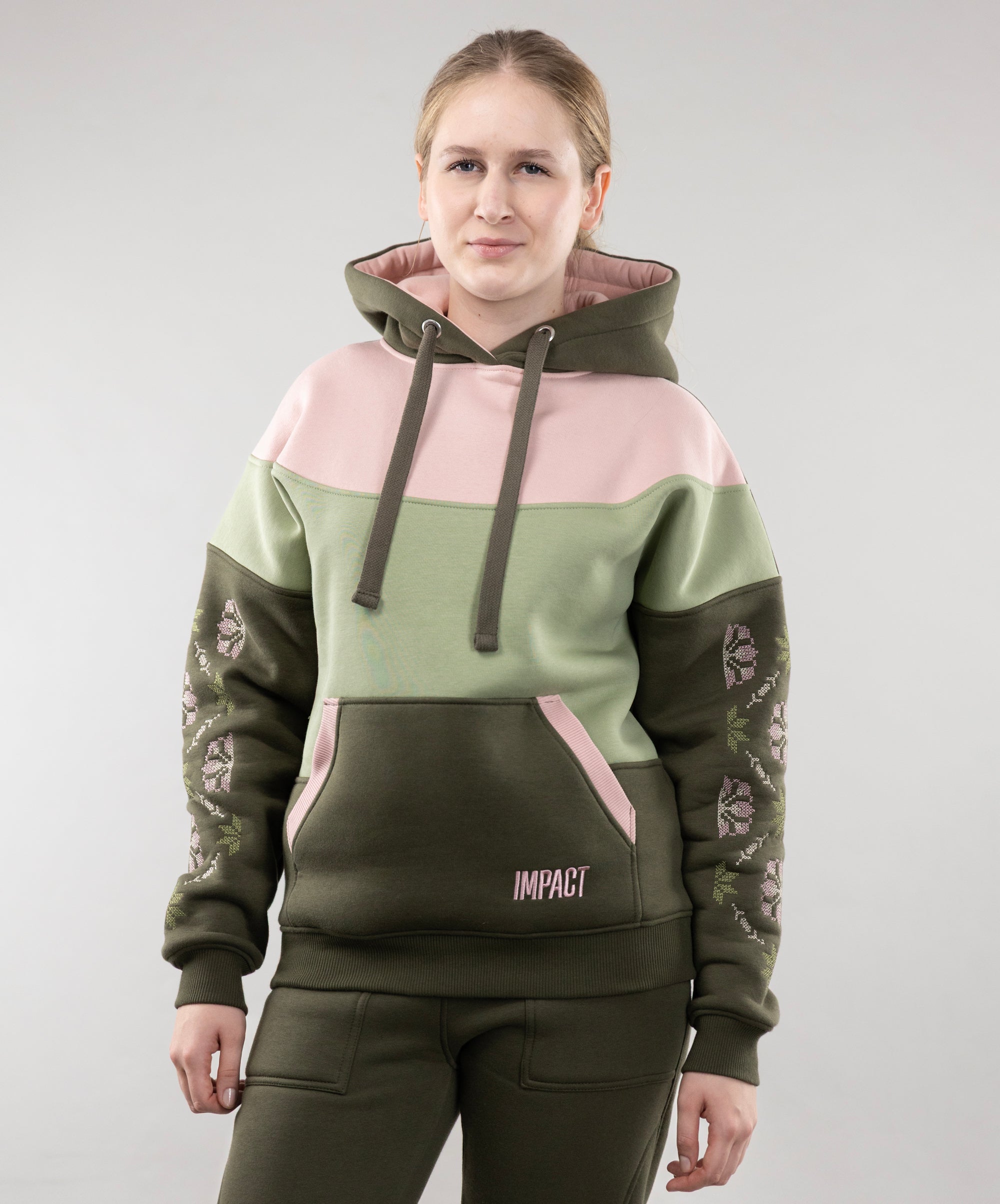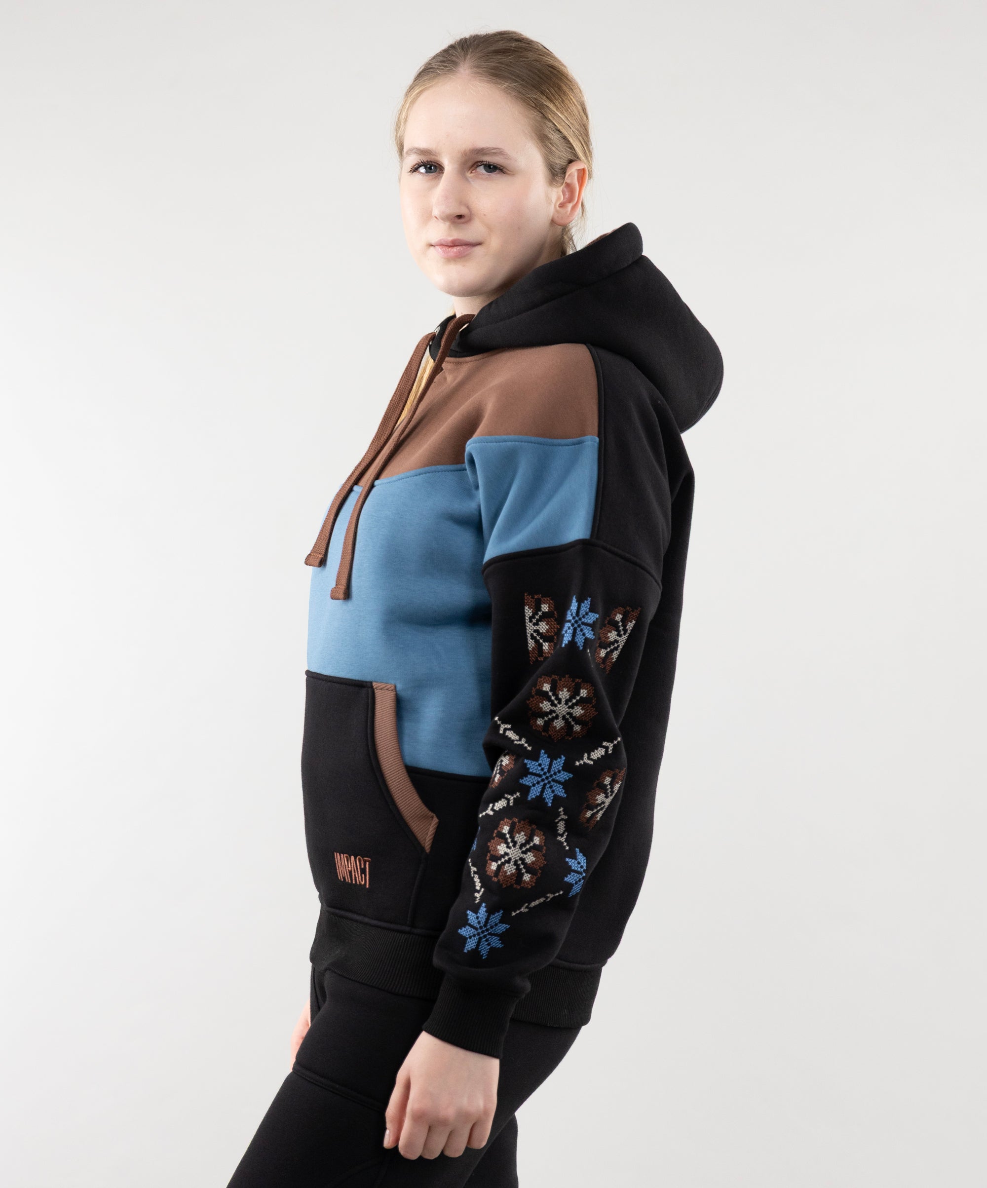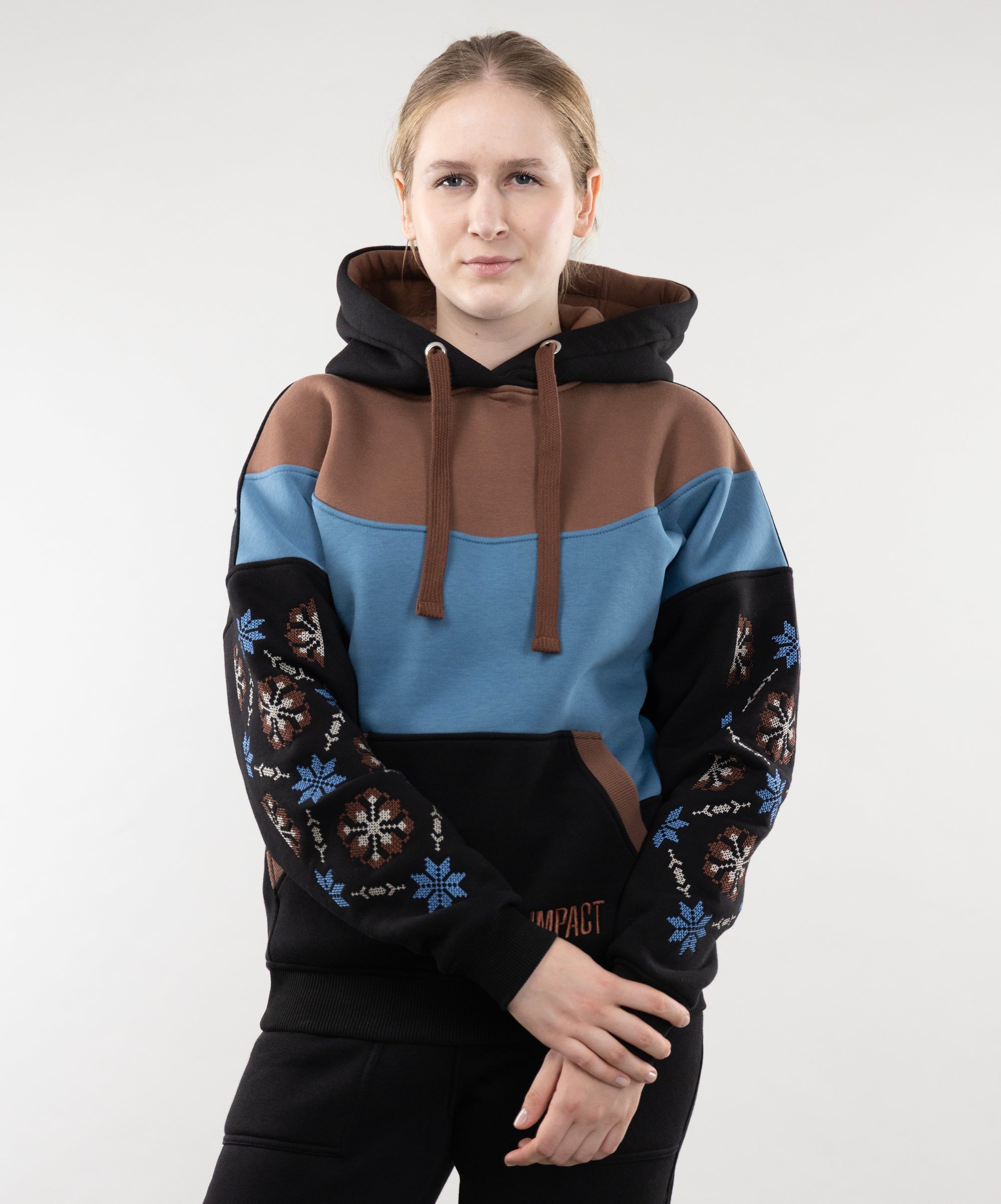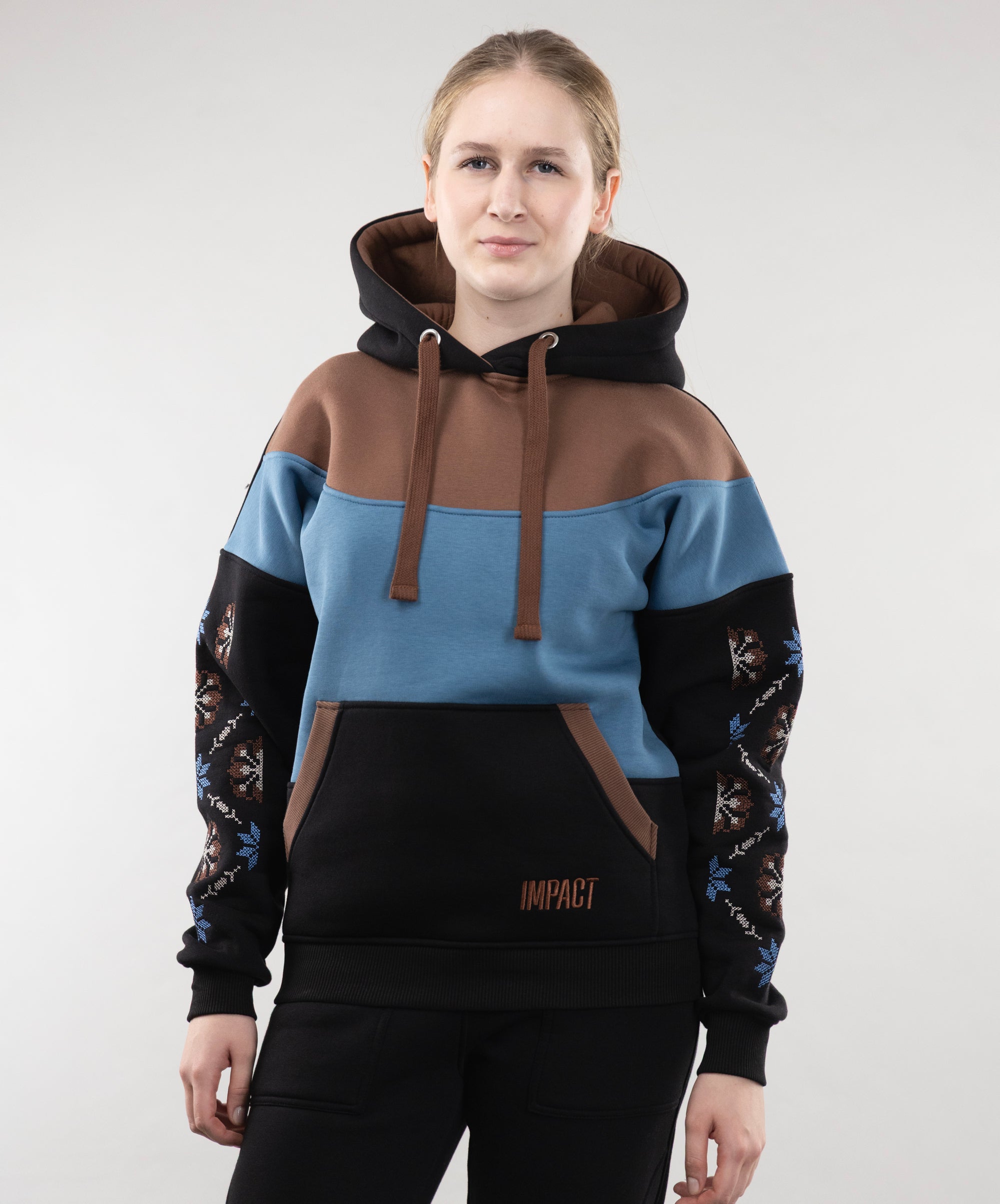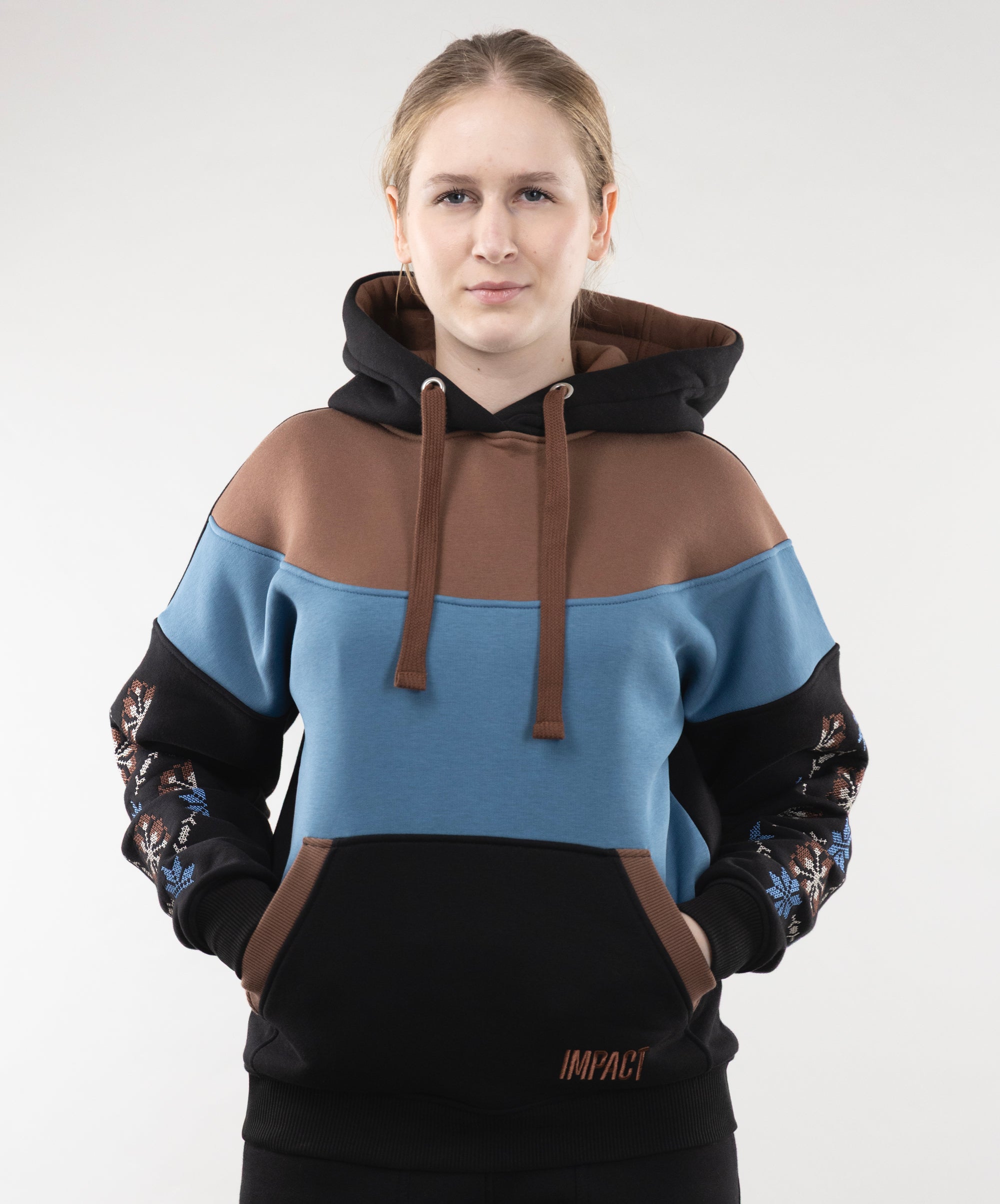 We have long dreamed of creating a hoodie with embroidery, so meet the “Dnipro” model. This hoodie combines three colors, has large embroidery on the sleeves, and a kangaroo pocket.