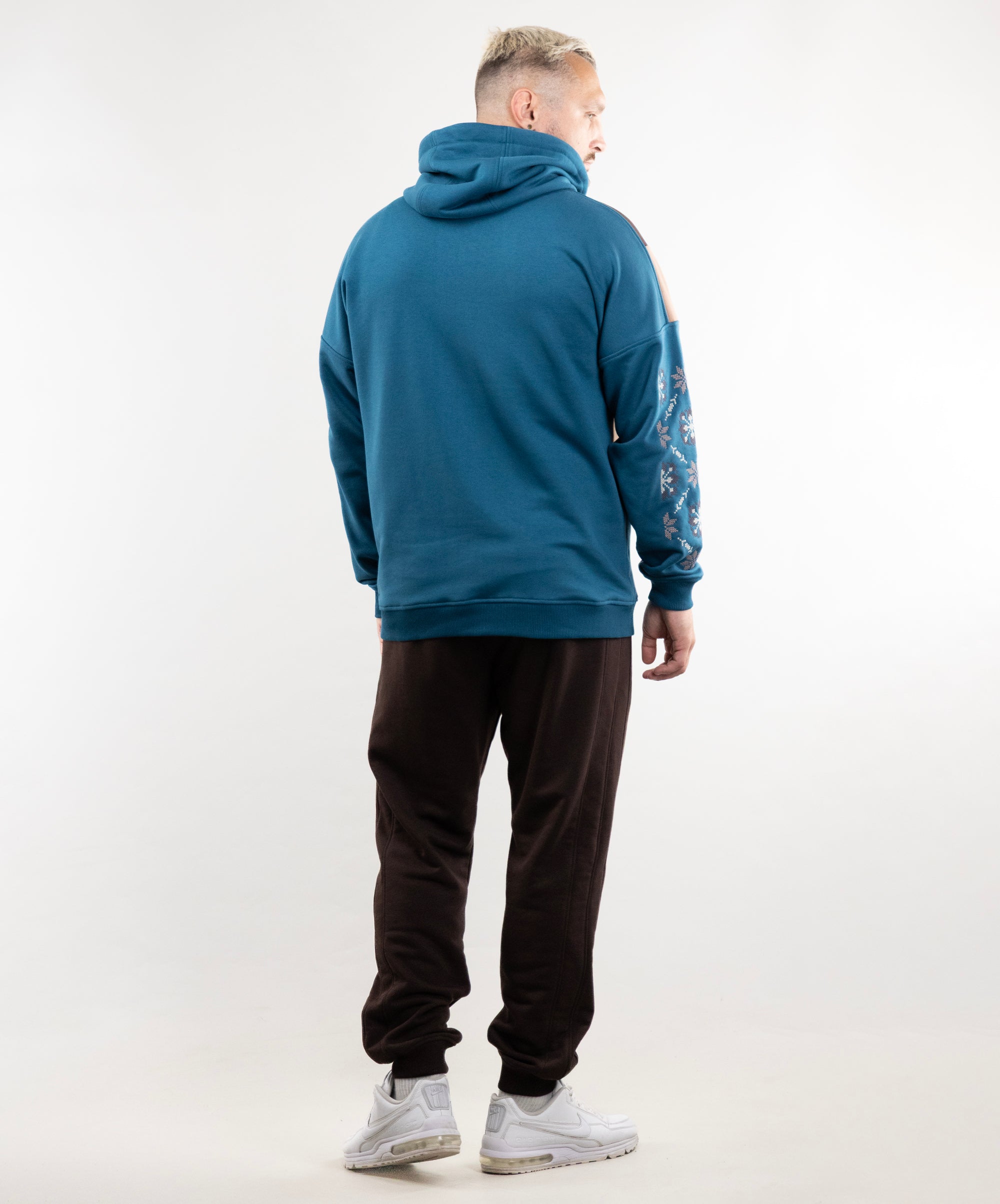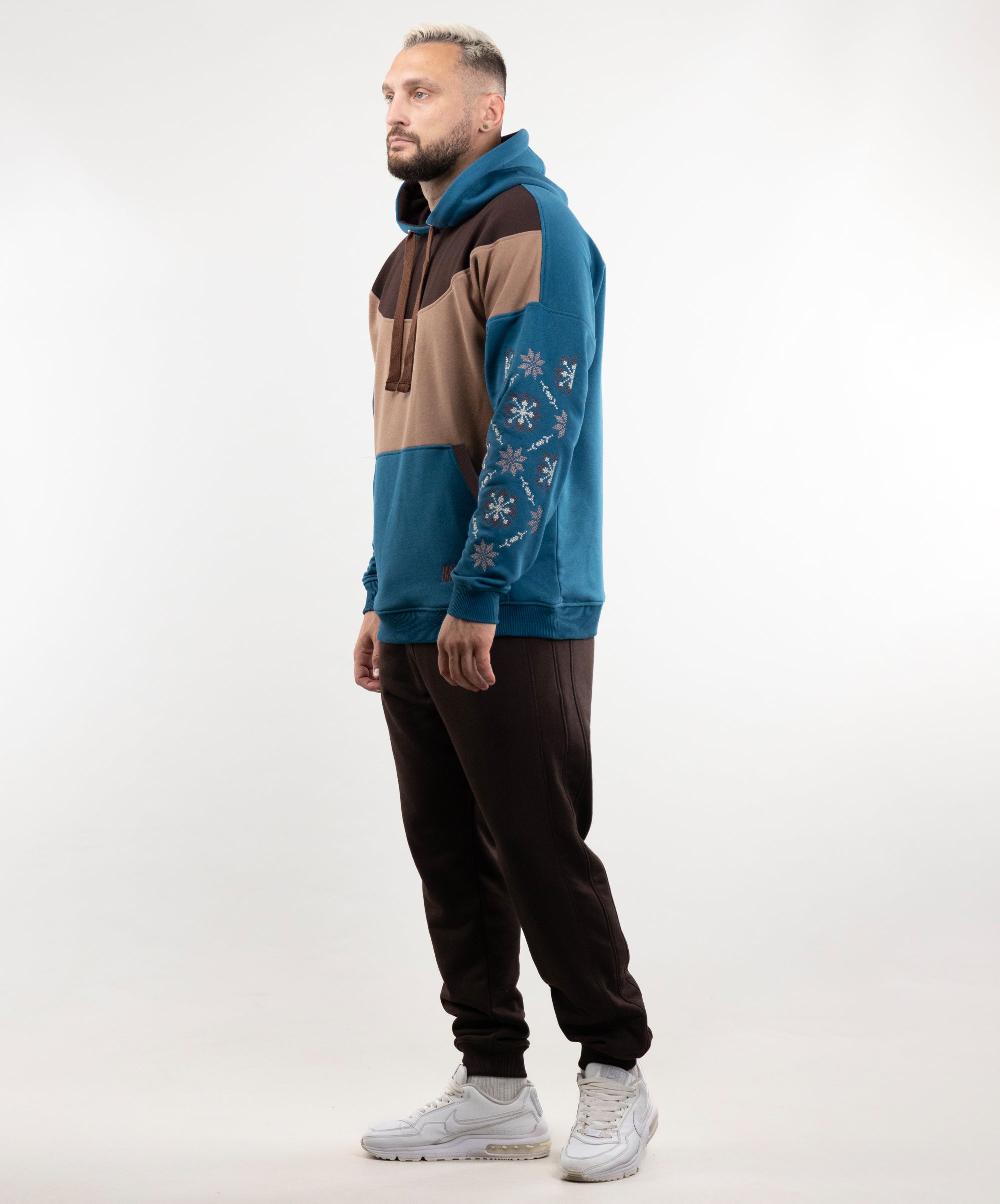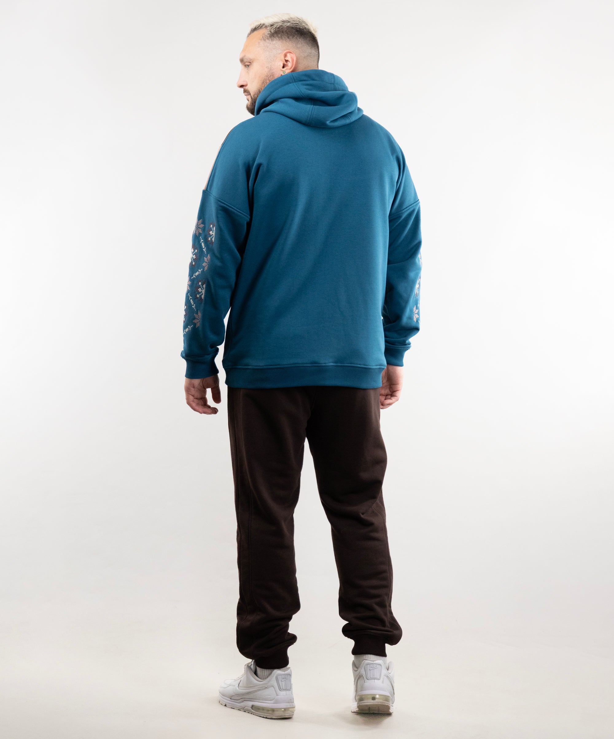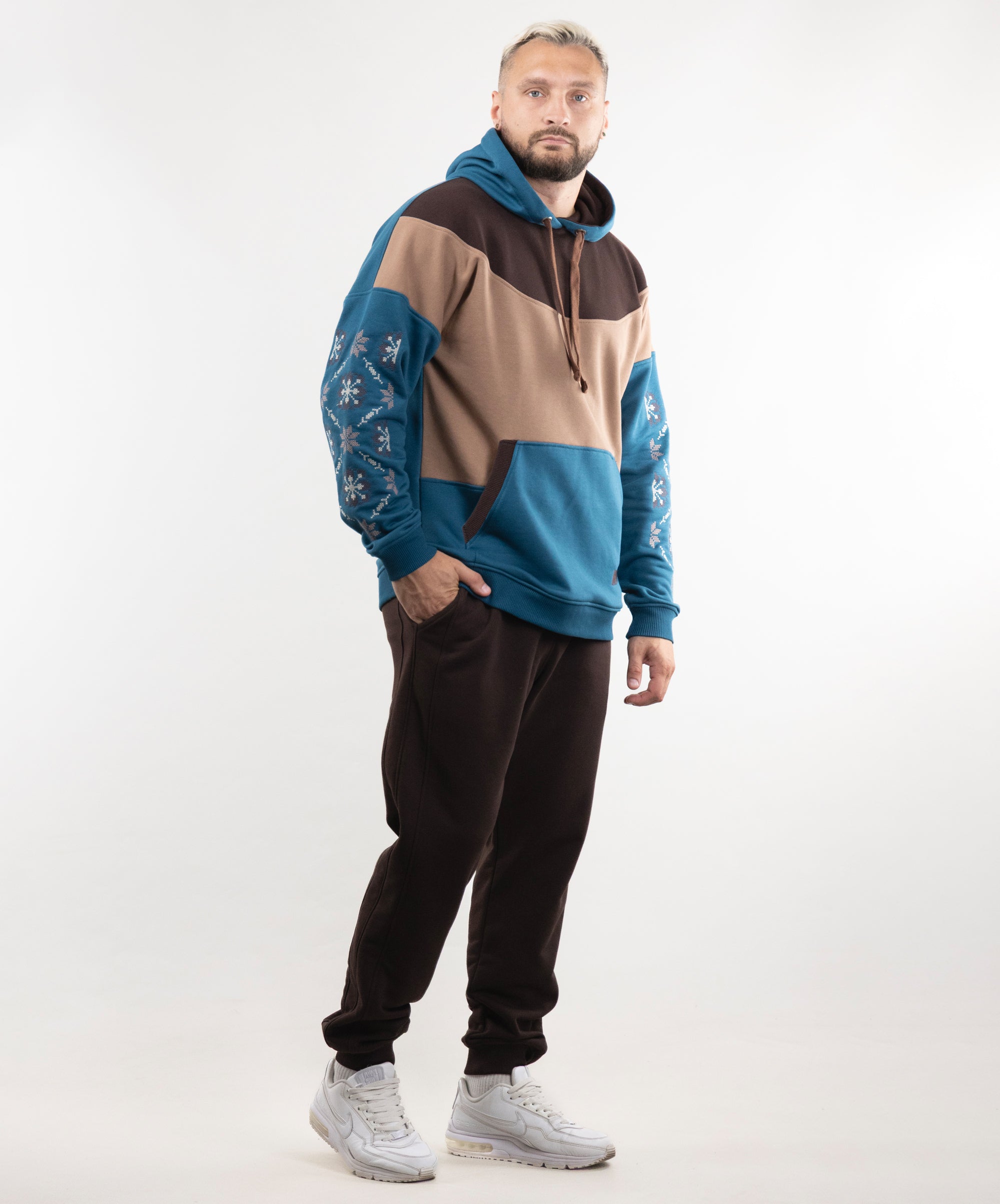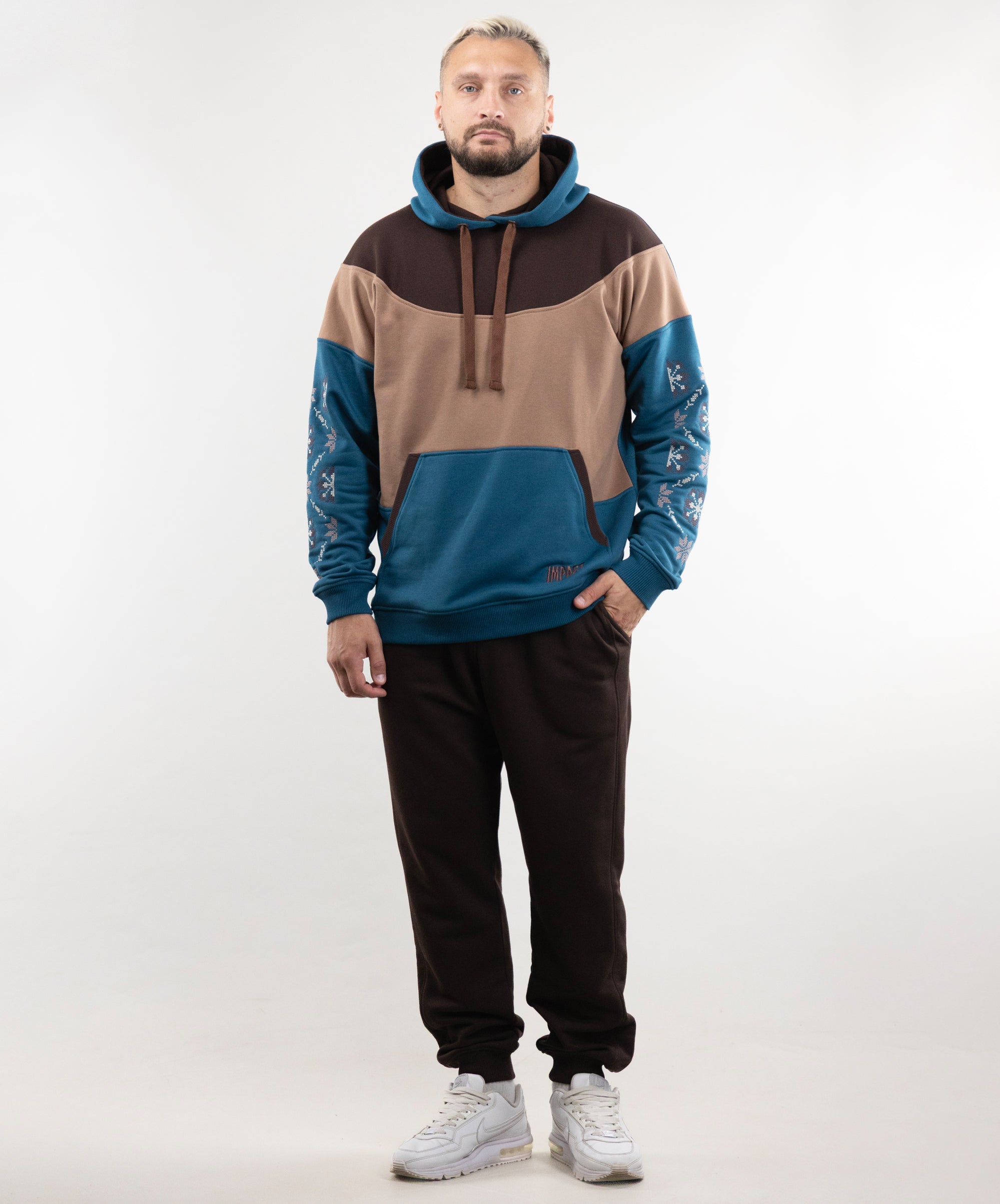We have long dreamed of creating a hoodie with embroidery, so meet the “Dnipro” model. This unlined hoodie combines three colors, has large embroidery on the sleeves, and a kangaroo pocket.