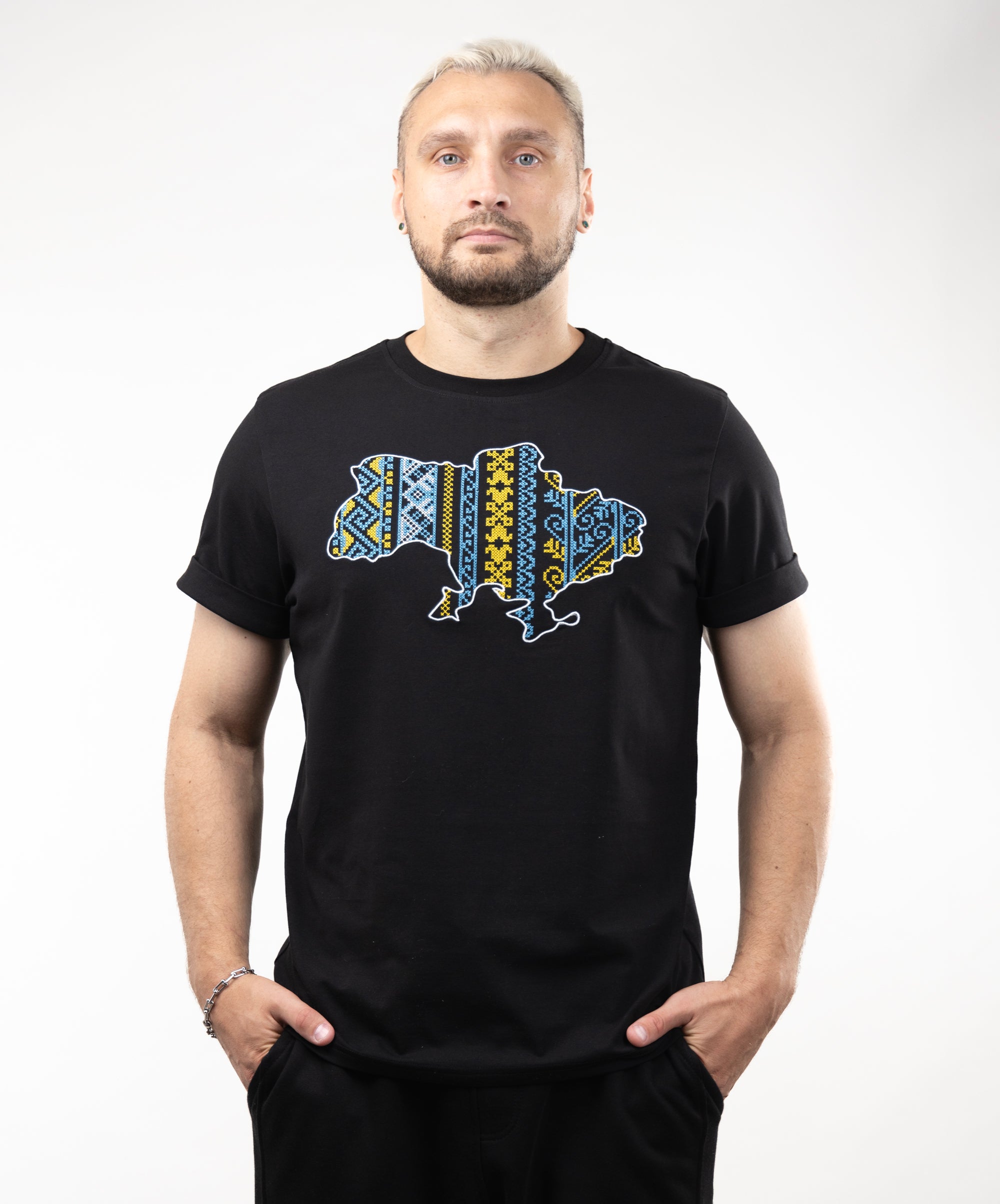 Patriotic T-shirt with an embroidered map of Ukraine. Everything in this model is very restrained and clear: a strict and classic style, impeccable tailoring, high-quality and durable fabric. The embroidery is made in the colours of the Ukrainian national symbols.