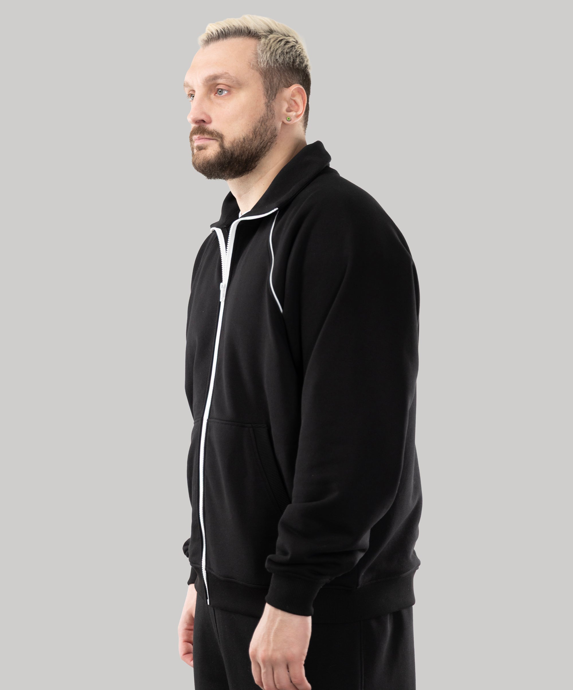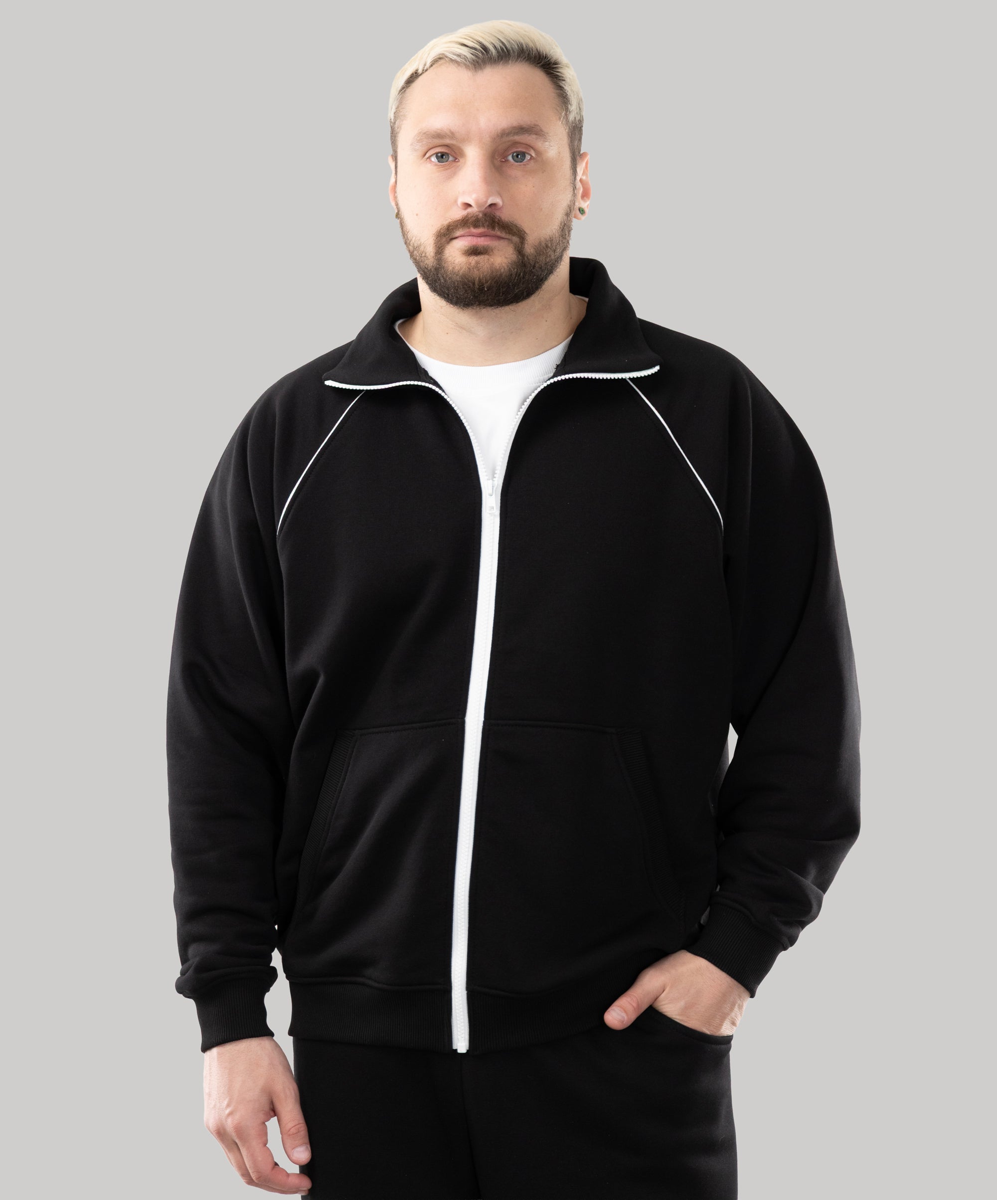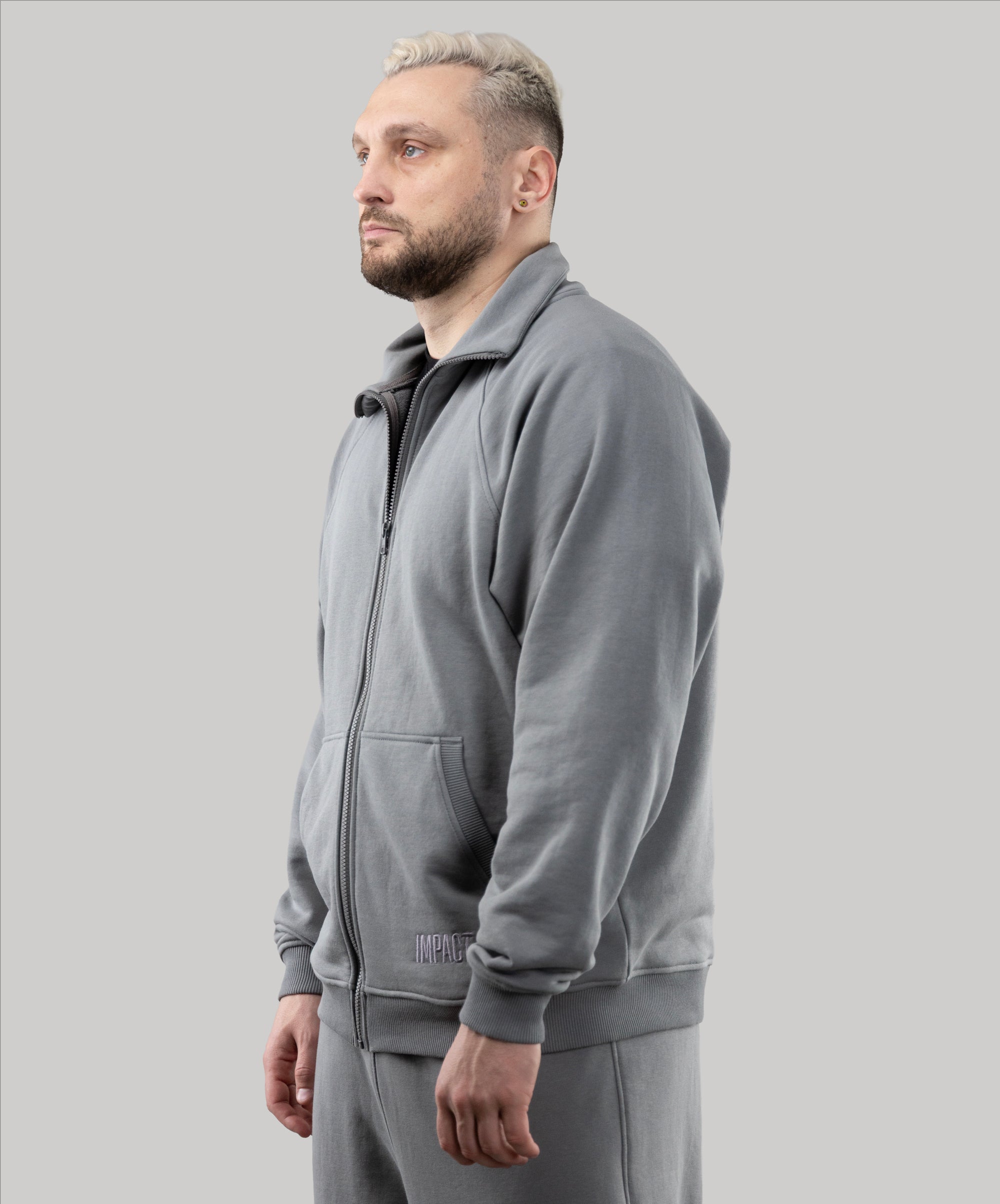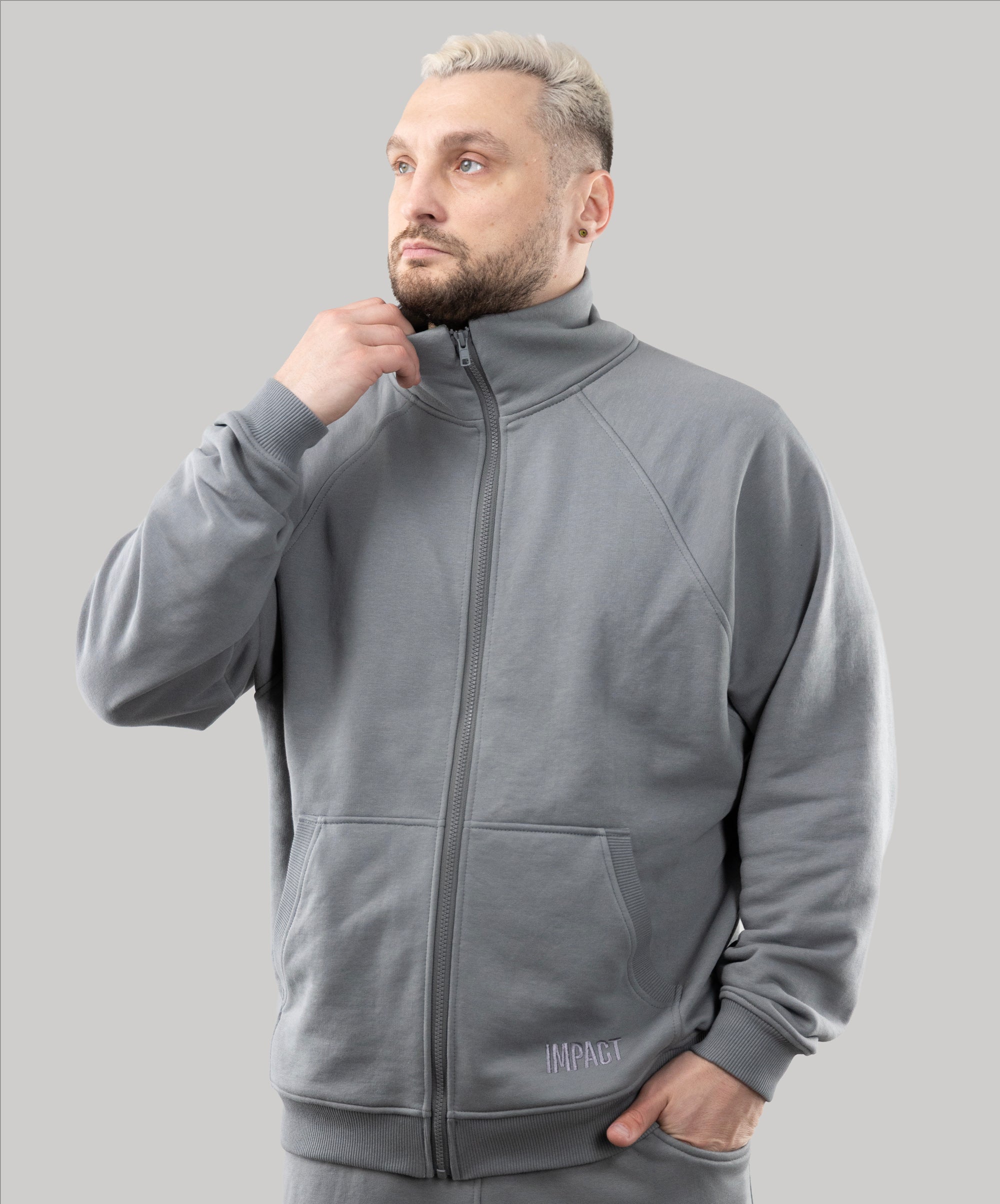 This is a model, suitable for men. Zip Sweatshirt "Vibe" goes well with sports pants, cotton joggers, and cropped pants from "Impact".
