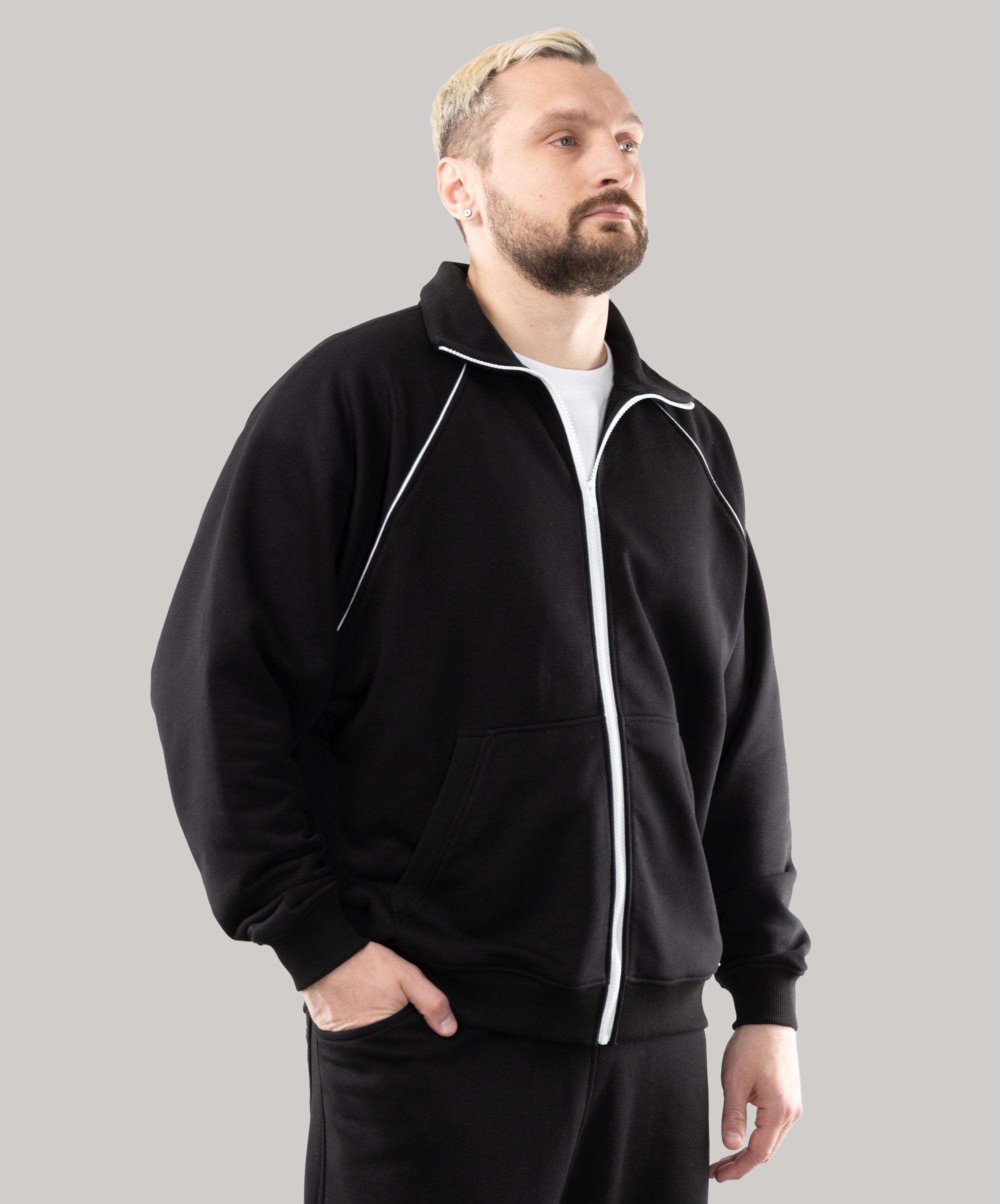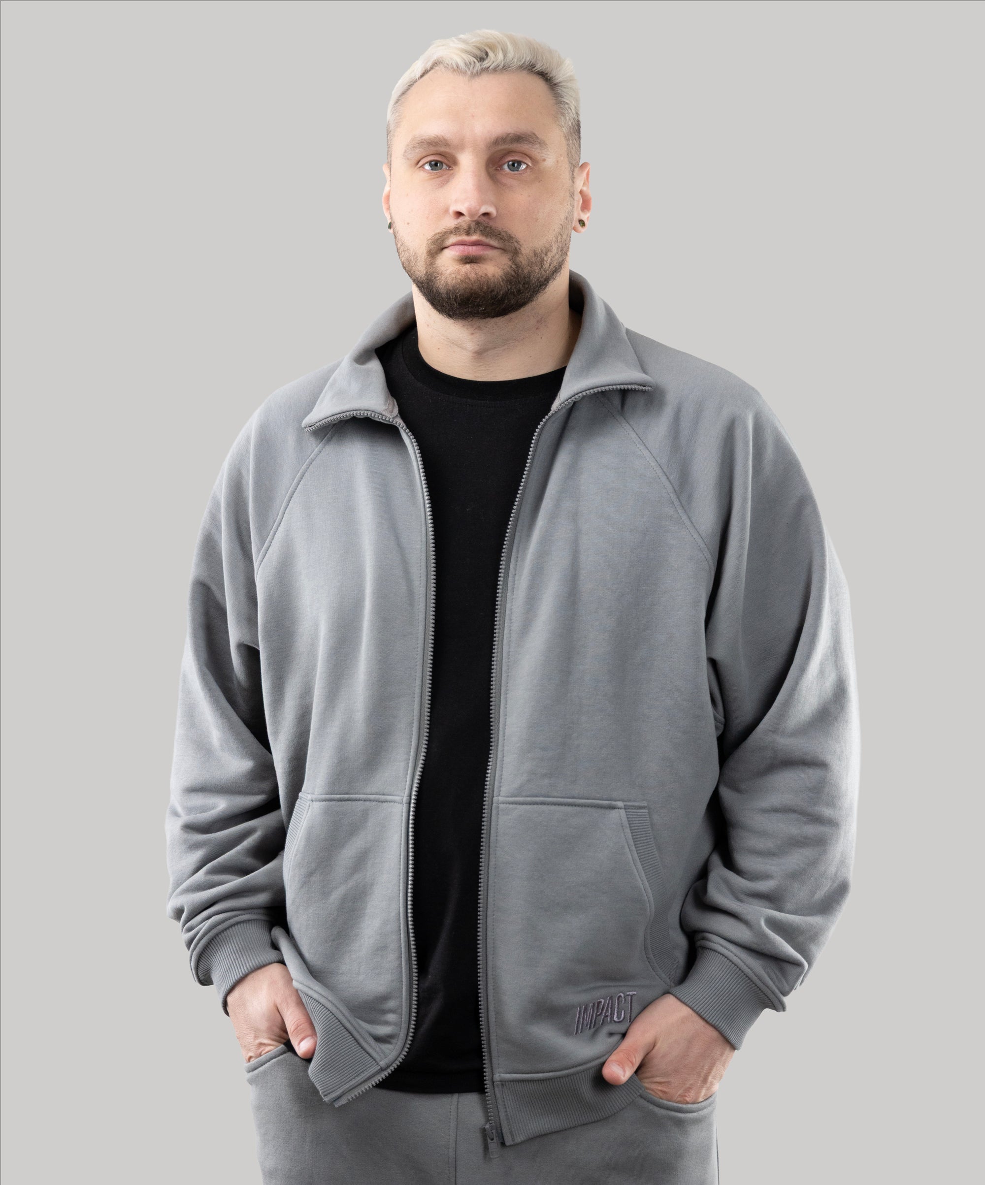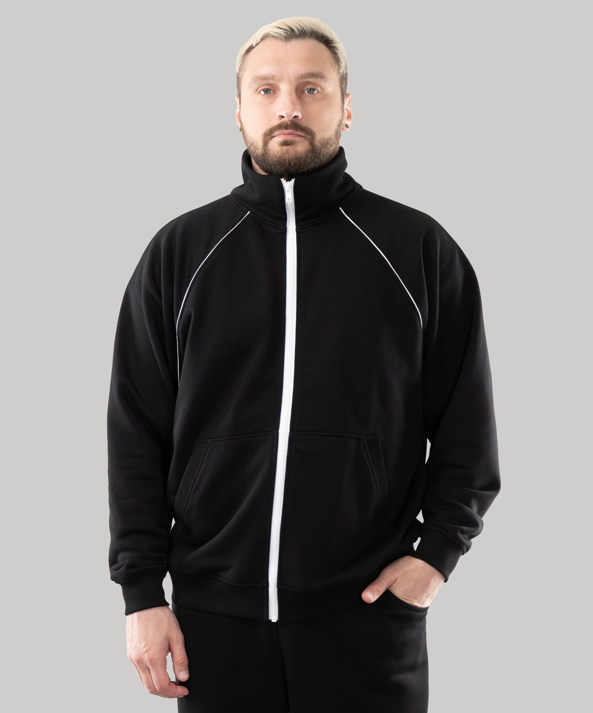 This is a model, suitable for men. Zip Sweatshirt "Vibe" goes well with sports pants, cotton joggers, and cropped pants from "Impact".