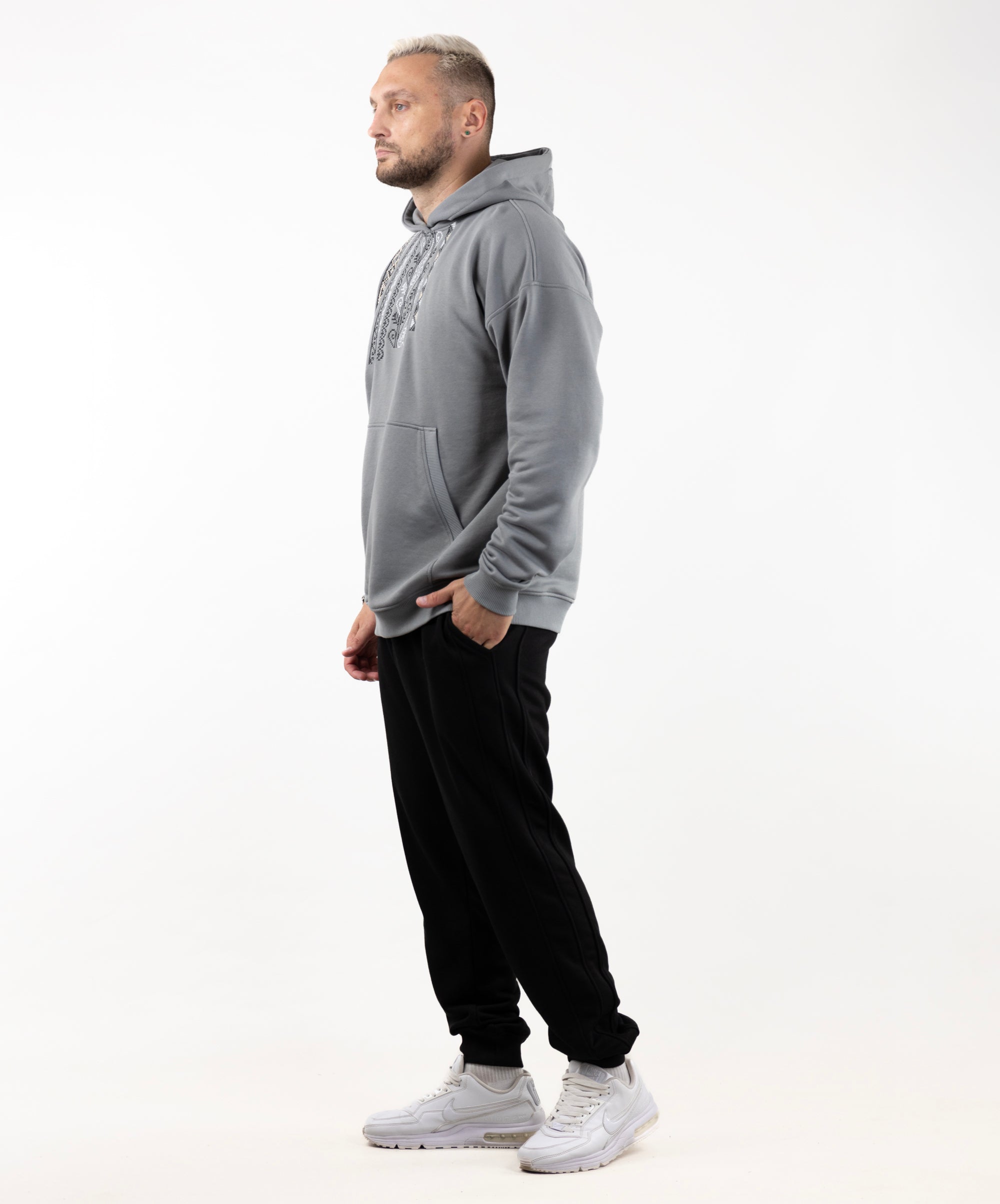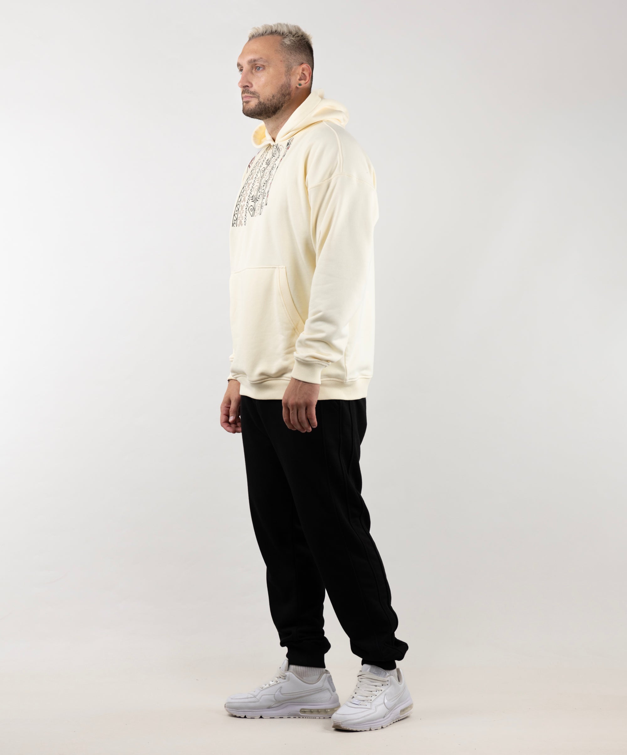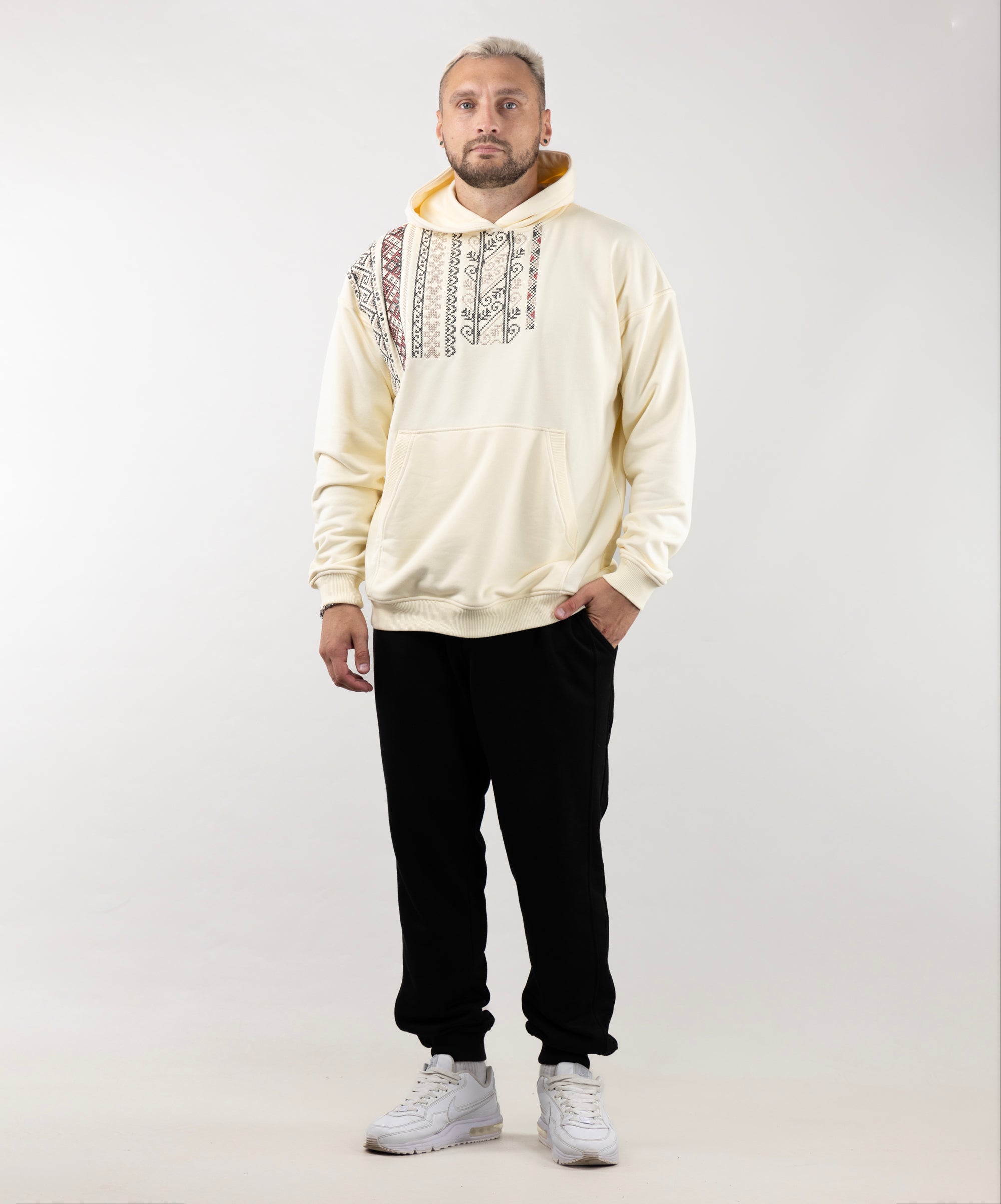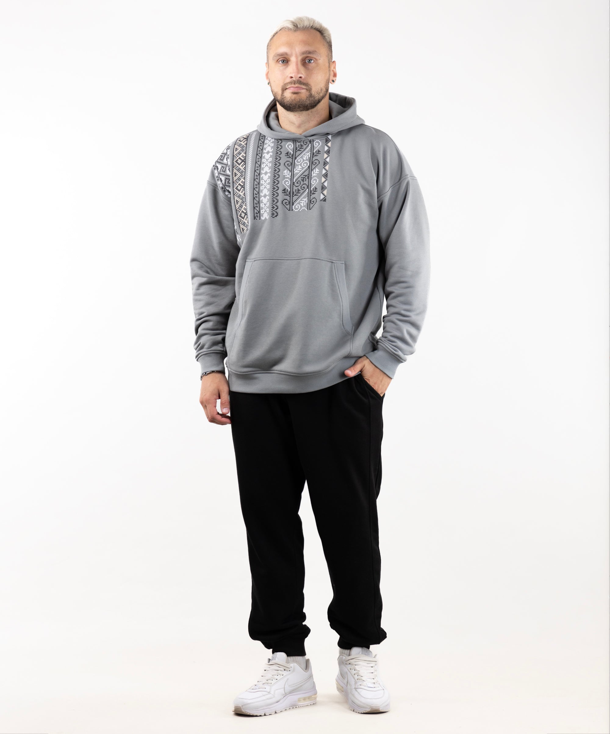 Meet the Hoodie Vyshyvanka, a perfect mix of tradition and everyday comfort. It is inspired by Ukrainian embroidery and features a unique black-and-white pattern on the front. This hoodie is durable, soft, and comfortable made from three-thread fleece without a warm underlay. Plus, it doesn't peel, so it stays looking great.
