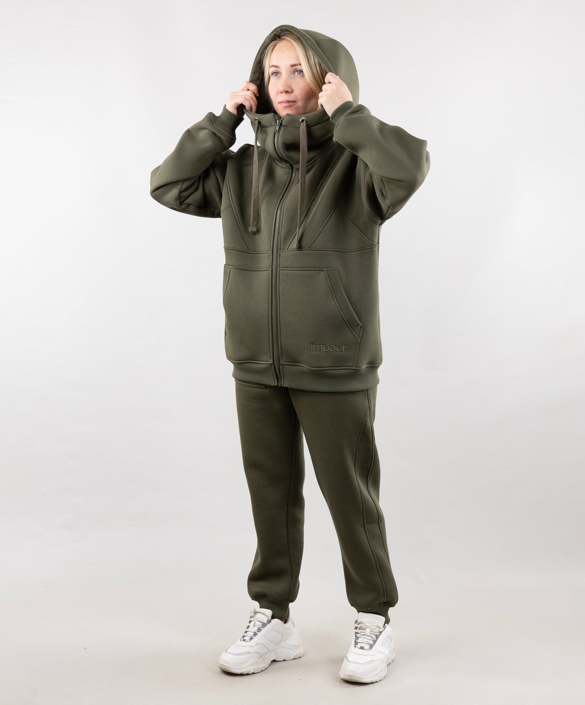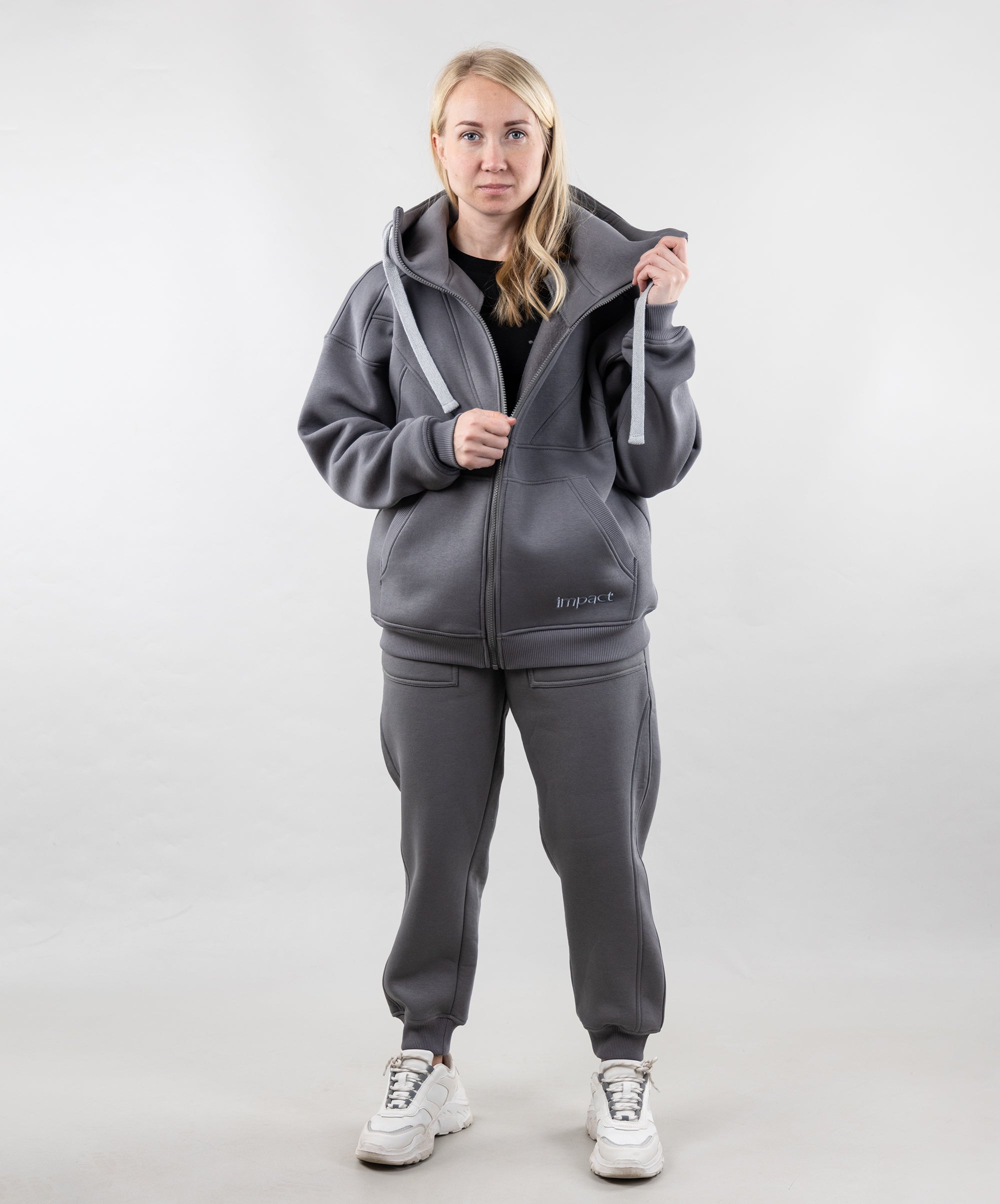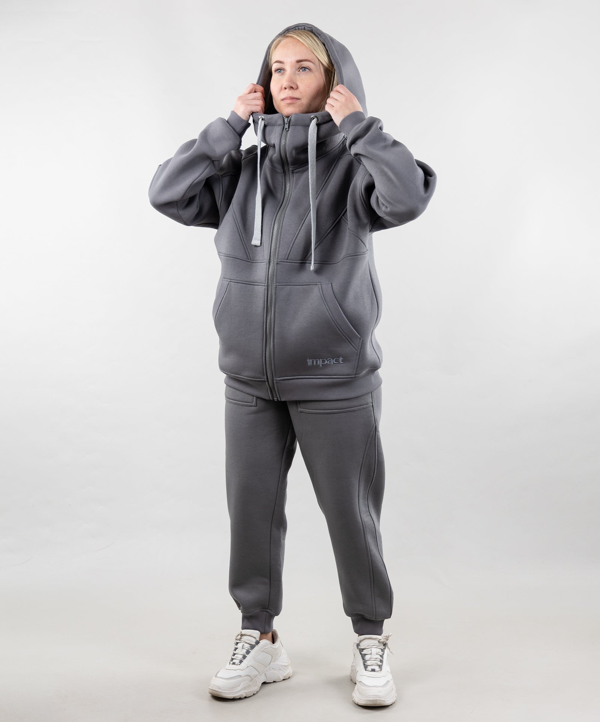 This is a unisex model, suitable for both women and men. "Introvert" zip-up hoodie goes well with sports pants, cotton joggers, and cropped pants from "Impact".