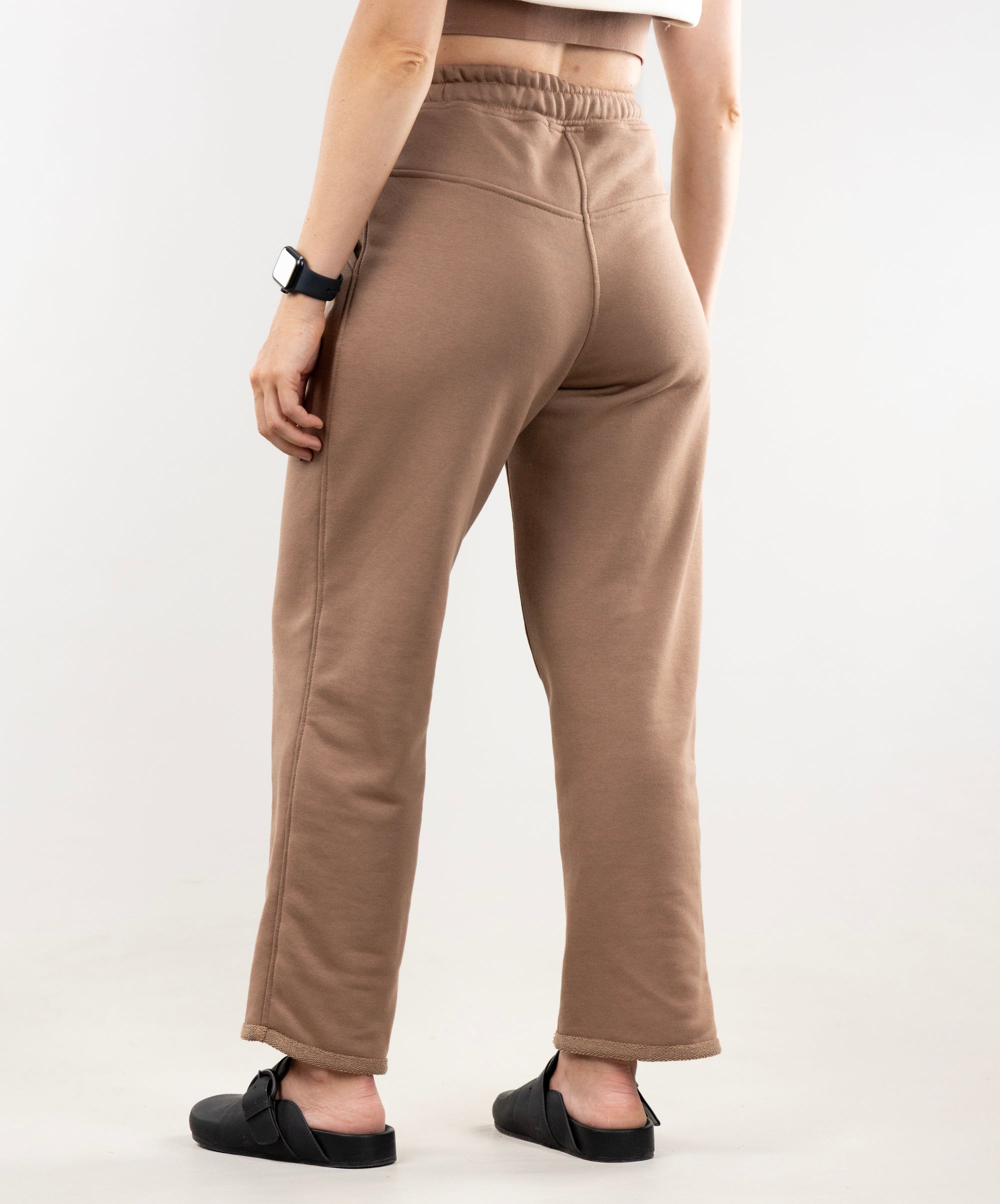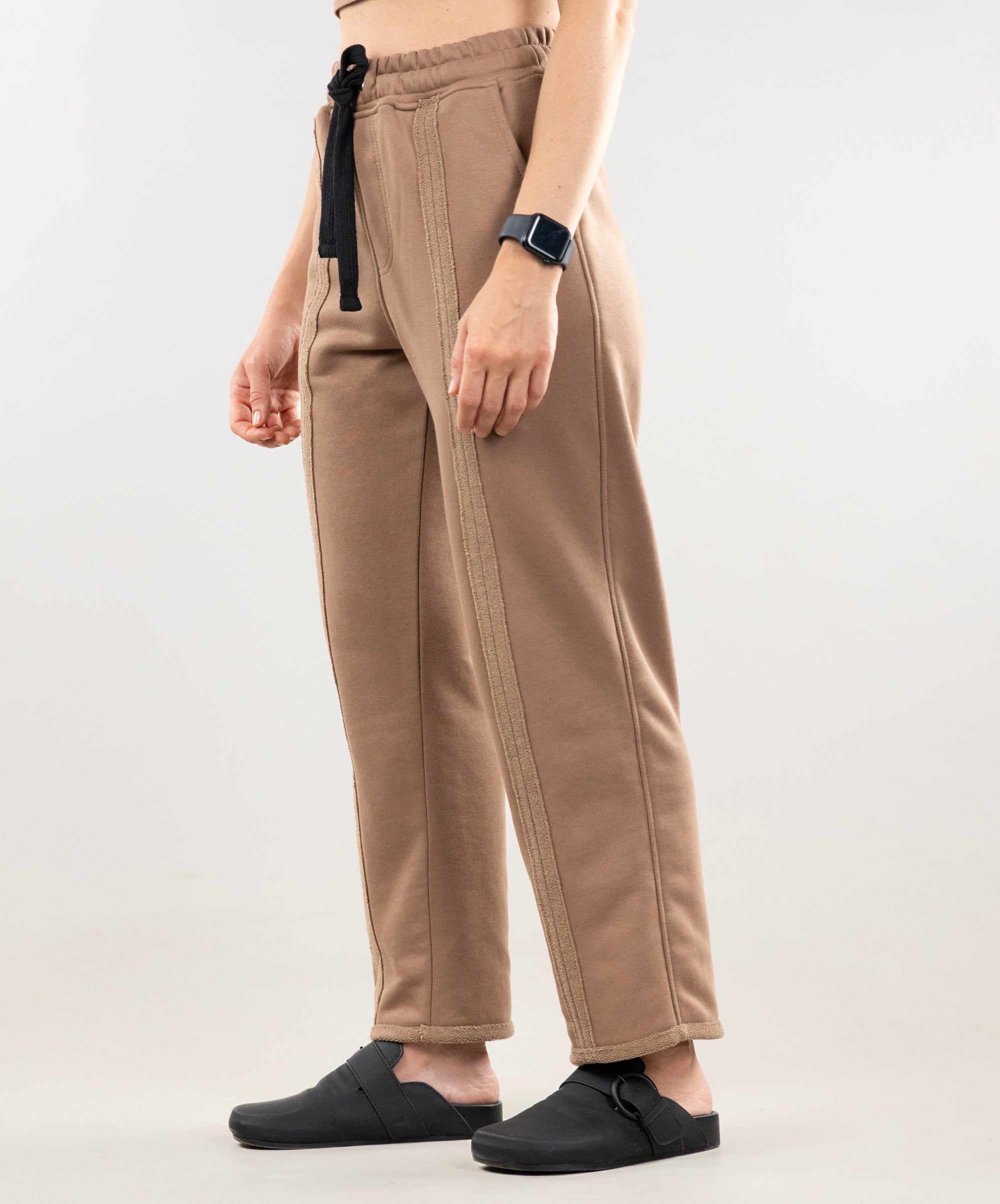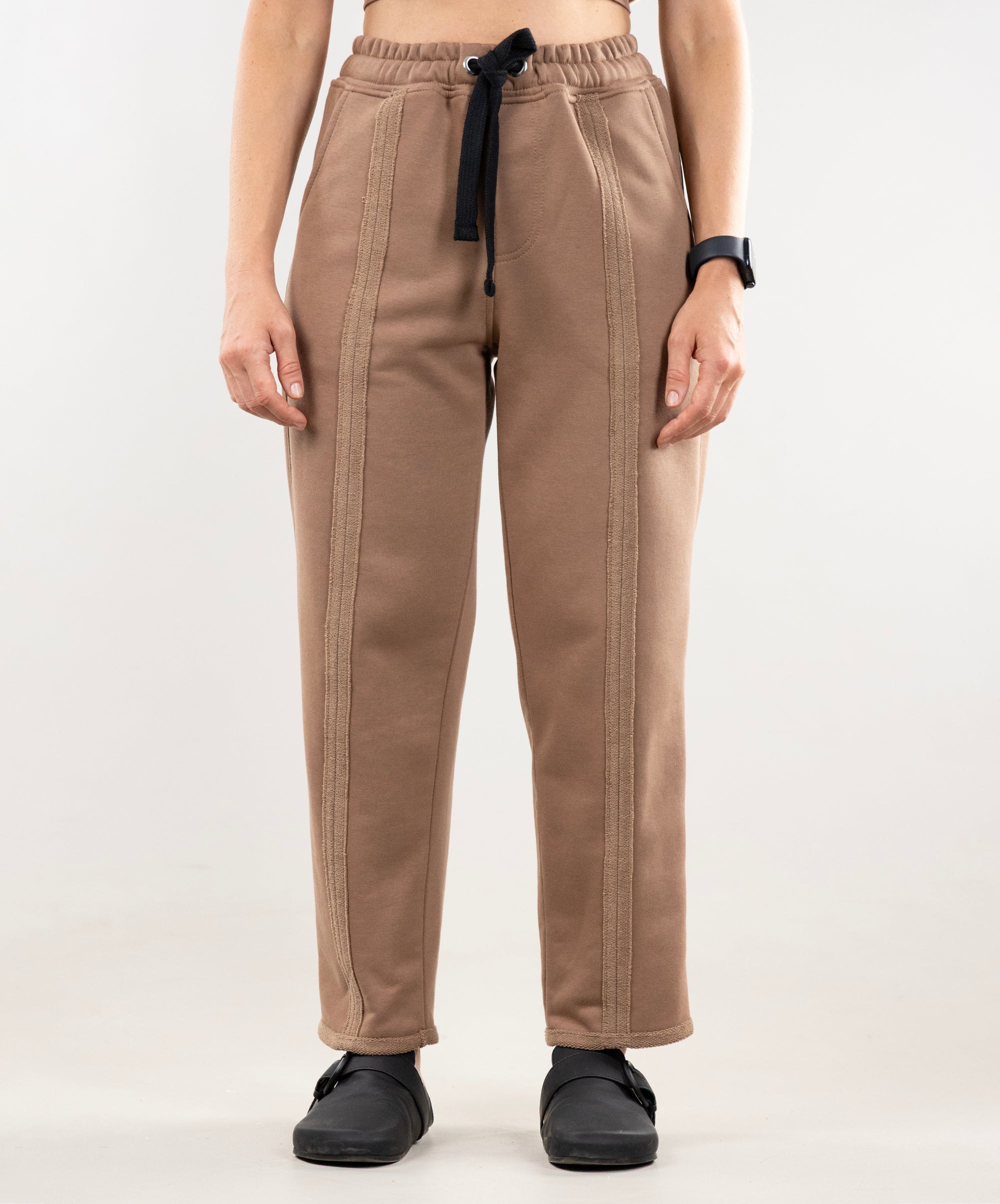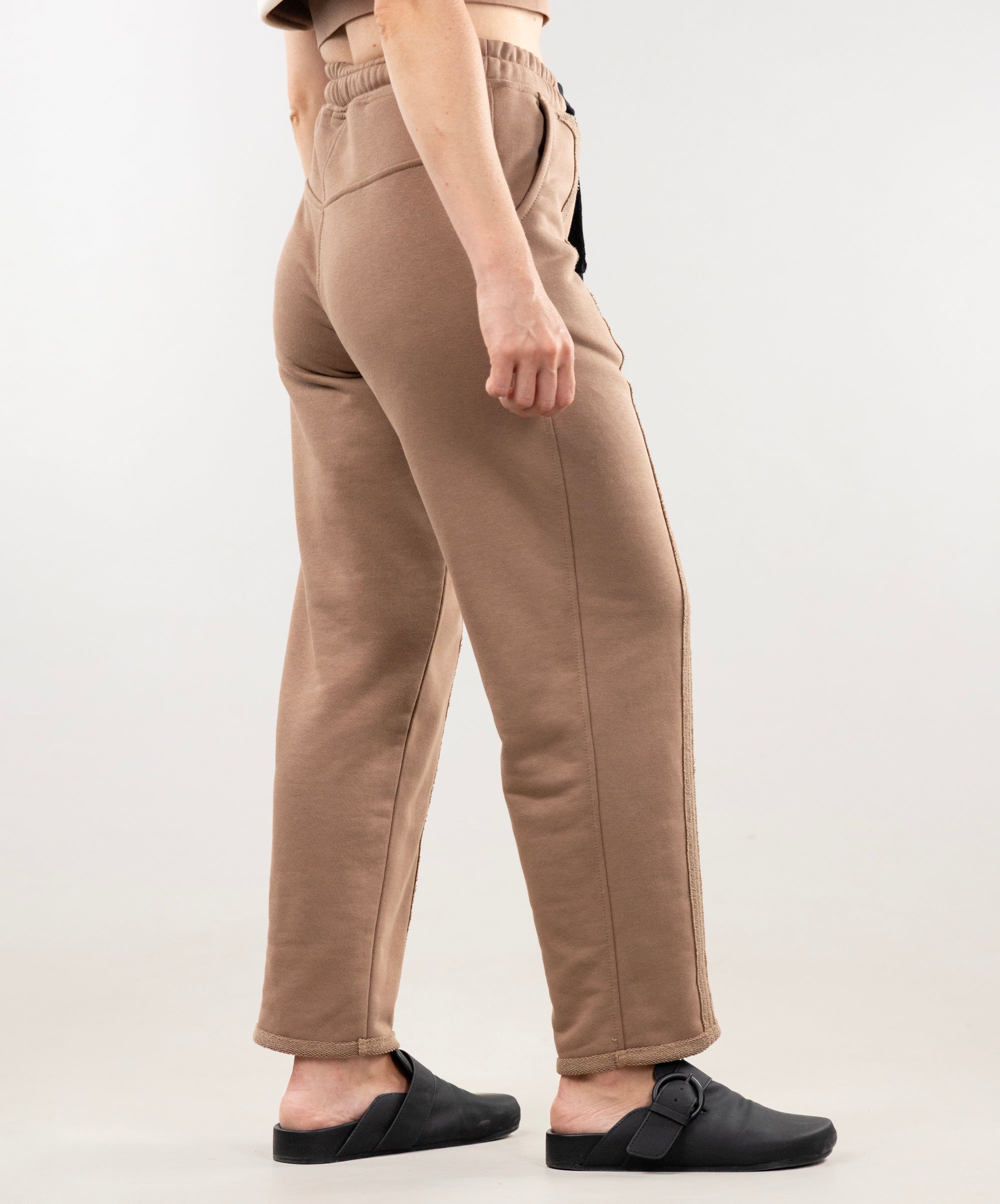 The pants have stitched darts in the front, so they look more like stylish casual pants than sportswear. We recommend pairing them with our Johnny T-shirt. This set is versatile: it's perfect for walks, work, and meetings in the city. Lightweight and comfortable, it's just right for the current weather 🍂