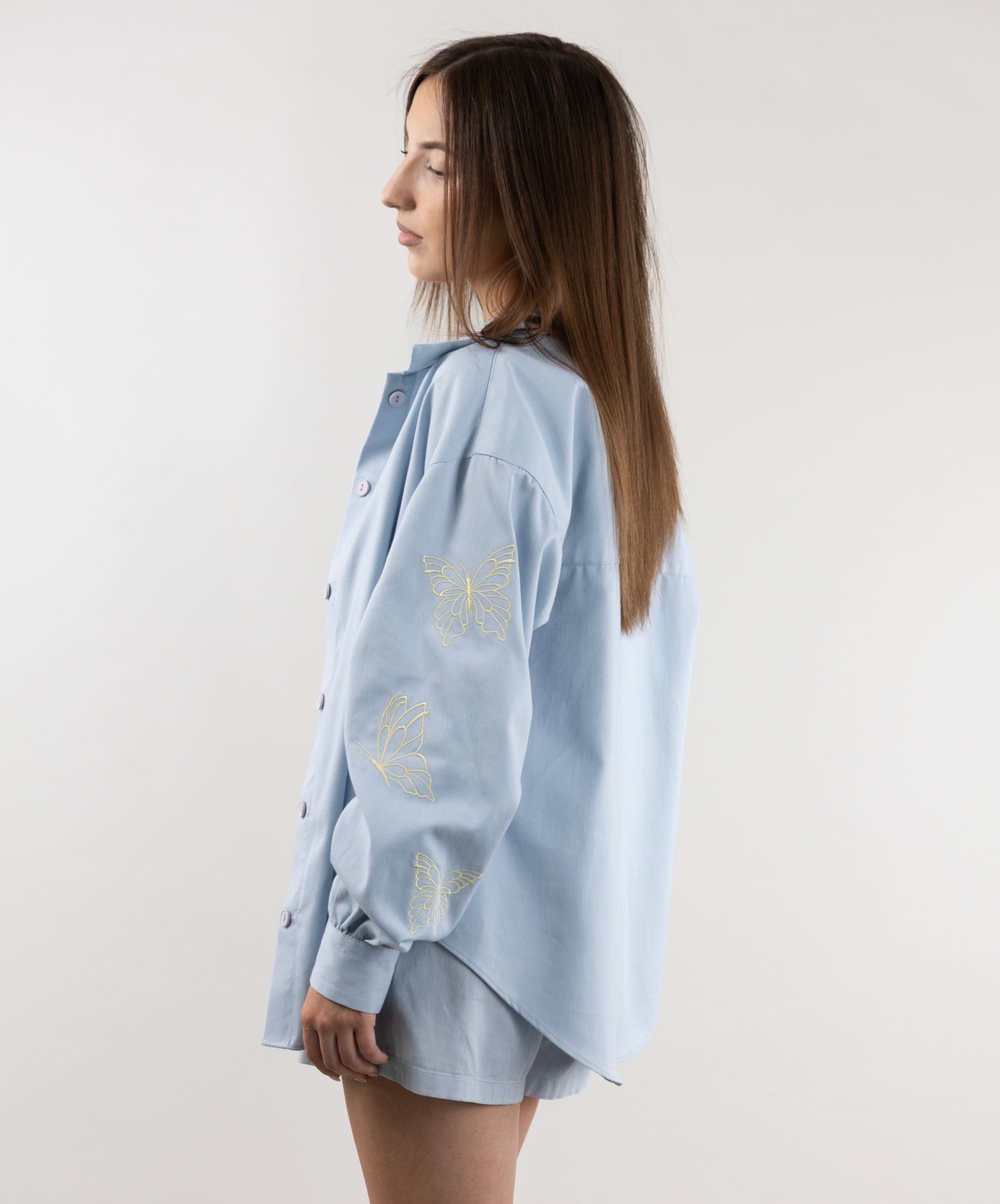 This shirt that immediately attracts attention with its delicacy and elegance. It is made of lightweight 100% cotton, which is pleasant to the body and ideal for warm weather. The restrained blue color combined with butterfly embroidery on the sleeves creates a sophisticated but expressive look.