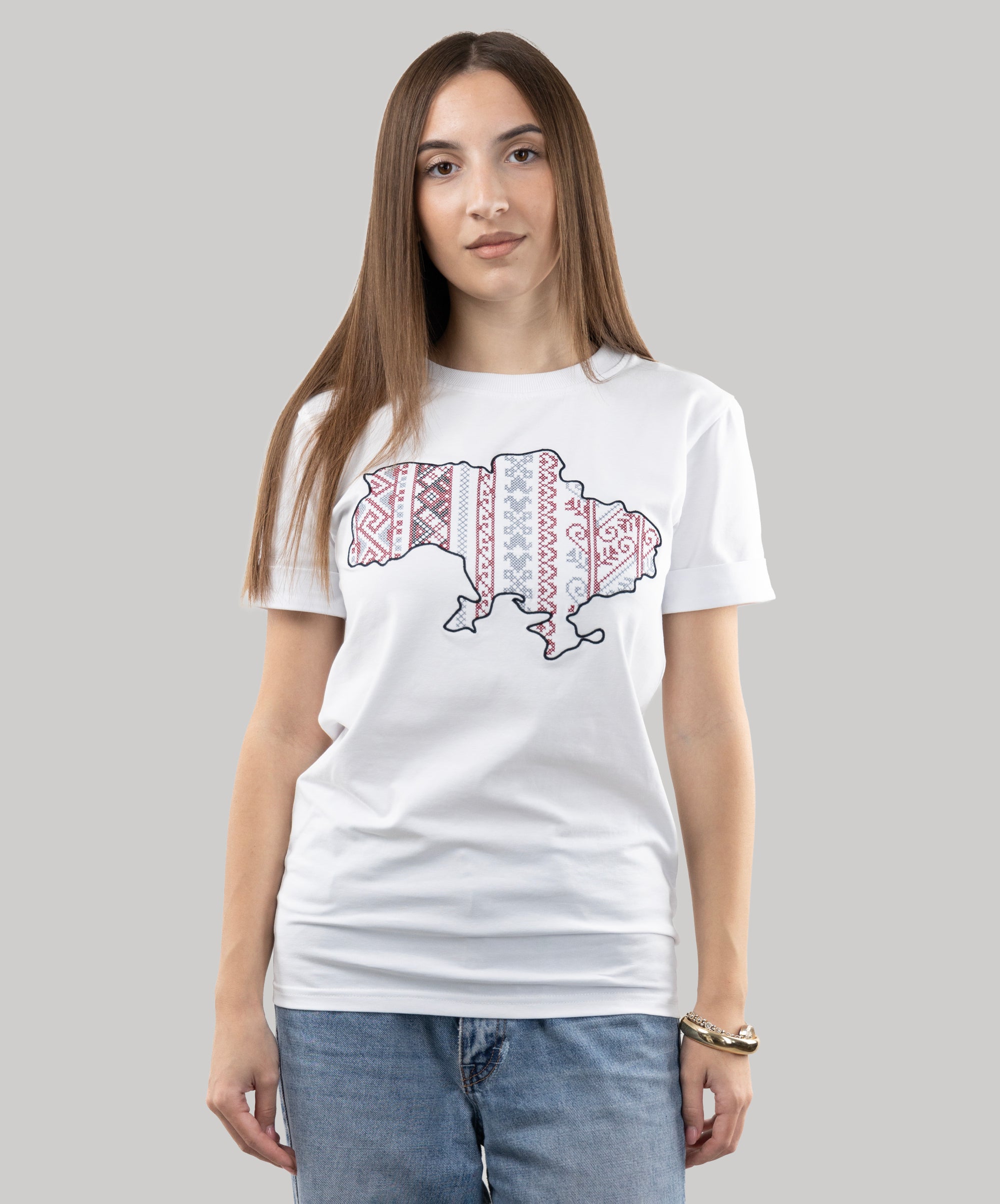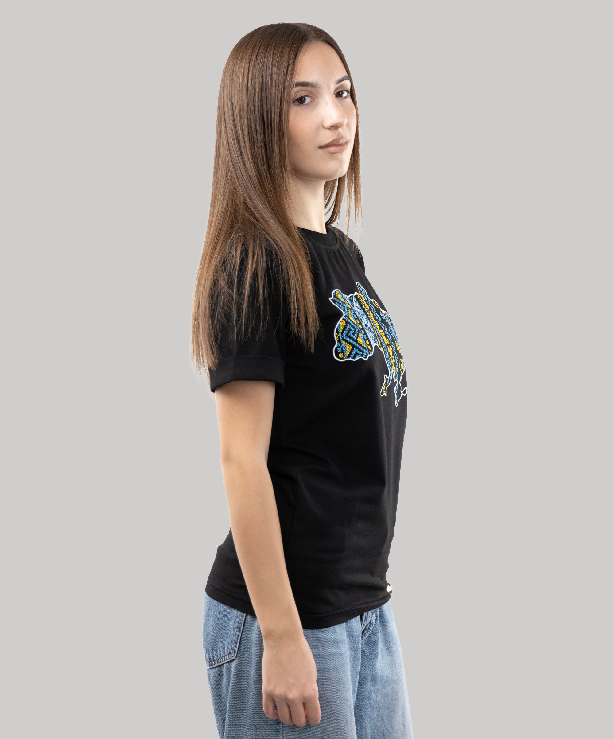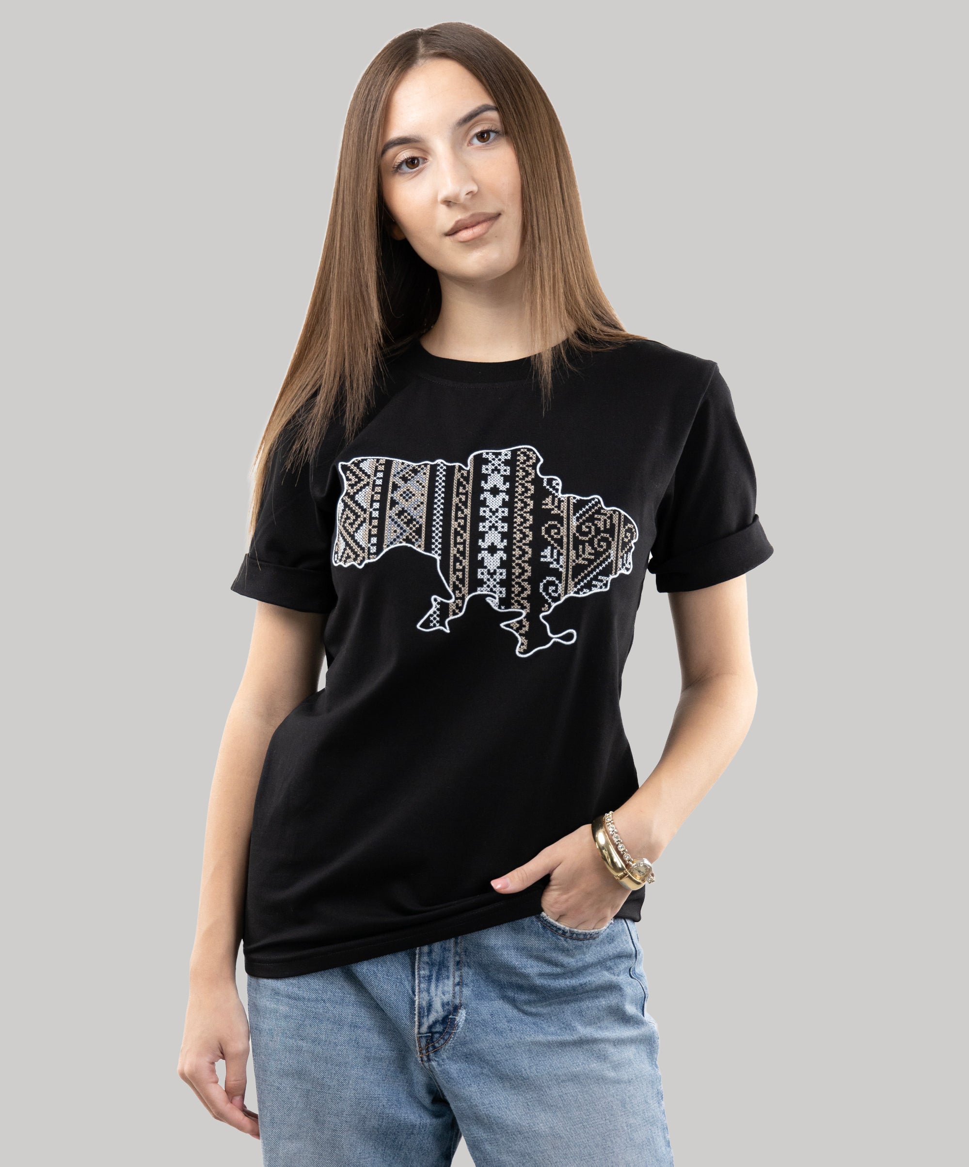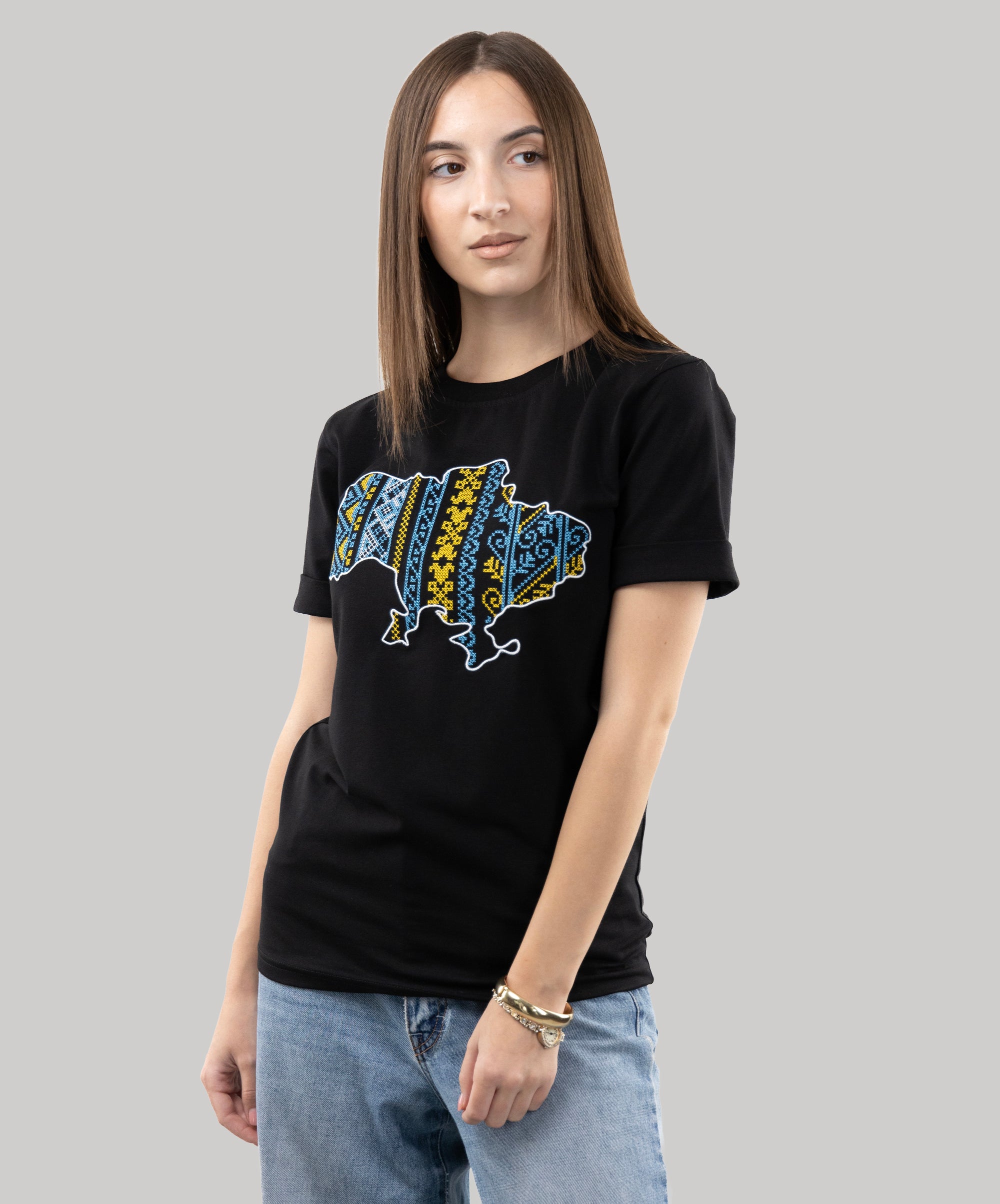 Patriotic T-shirt with an embroidered map of Ukraine. Everything in this model is very restrained and clear: a strict and classic style, impeccable tailoring, high-quality and durable fabric. The embroidery is made in the colours of the Ukrainian national symbols.