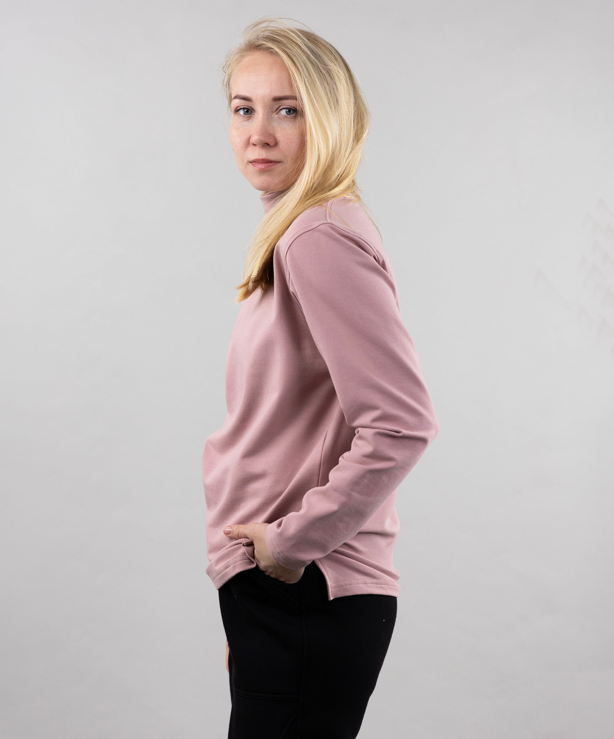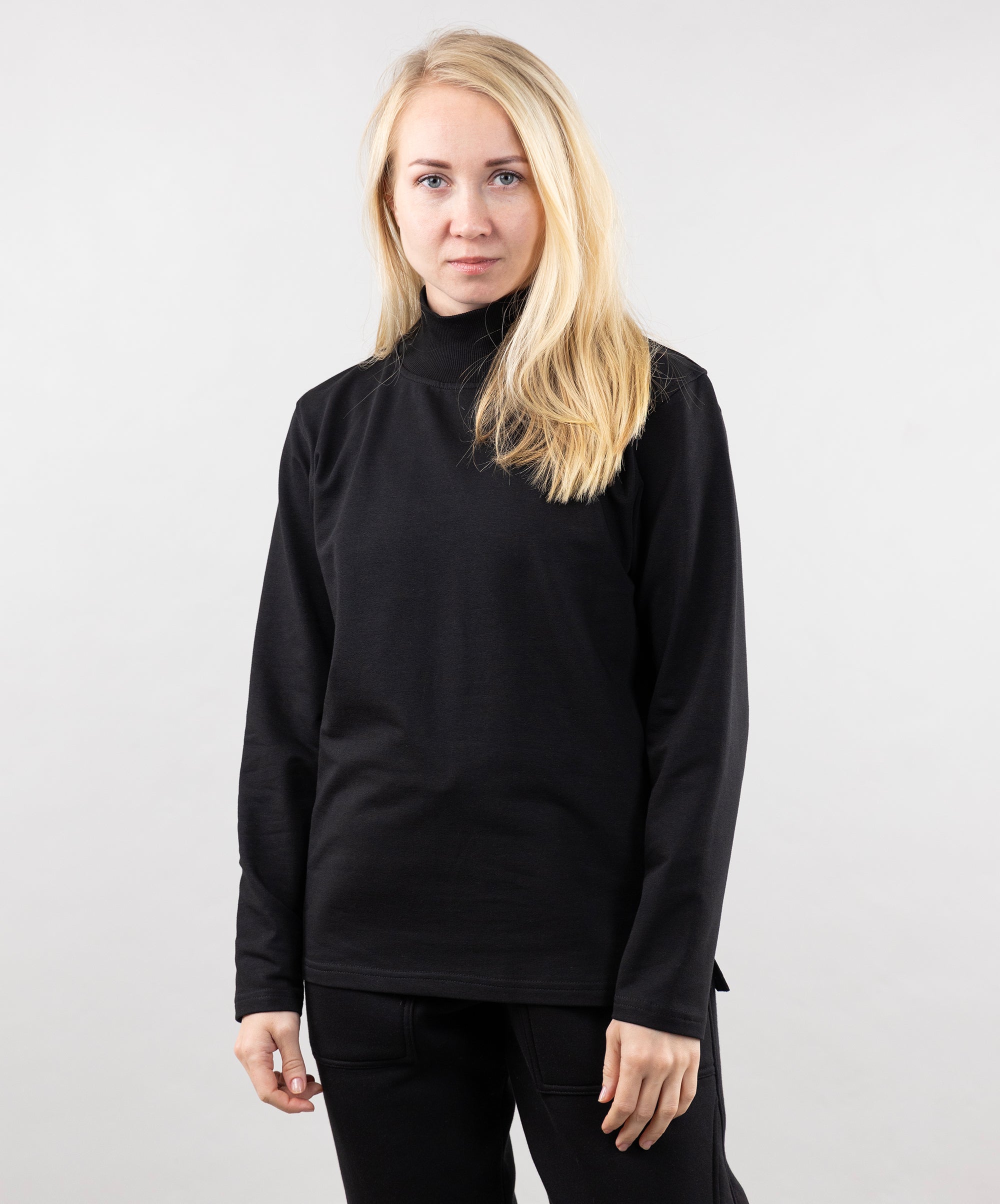 This is a unisex model, suitable for both women and men. The turtleneck goes well with sports pants, cotton joggers, and cropped pants from "Impact".