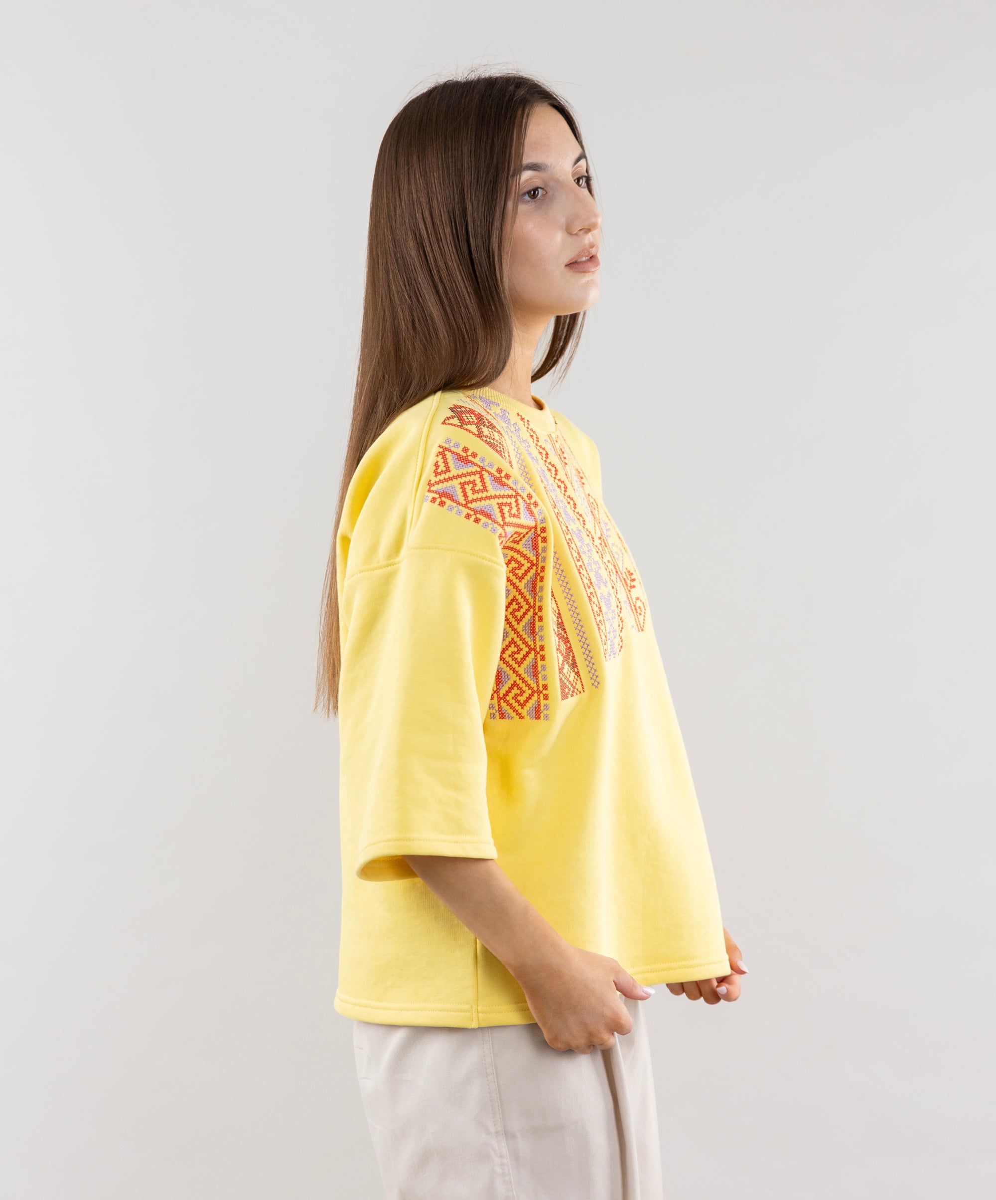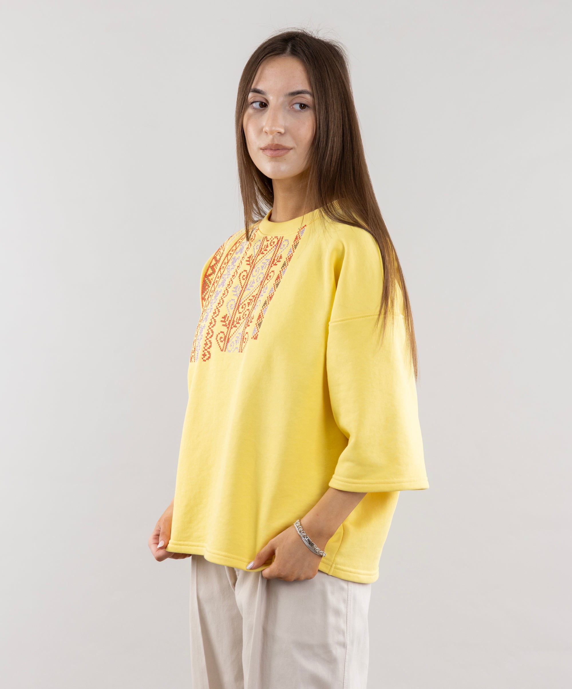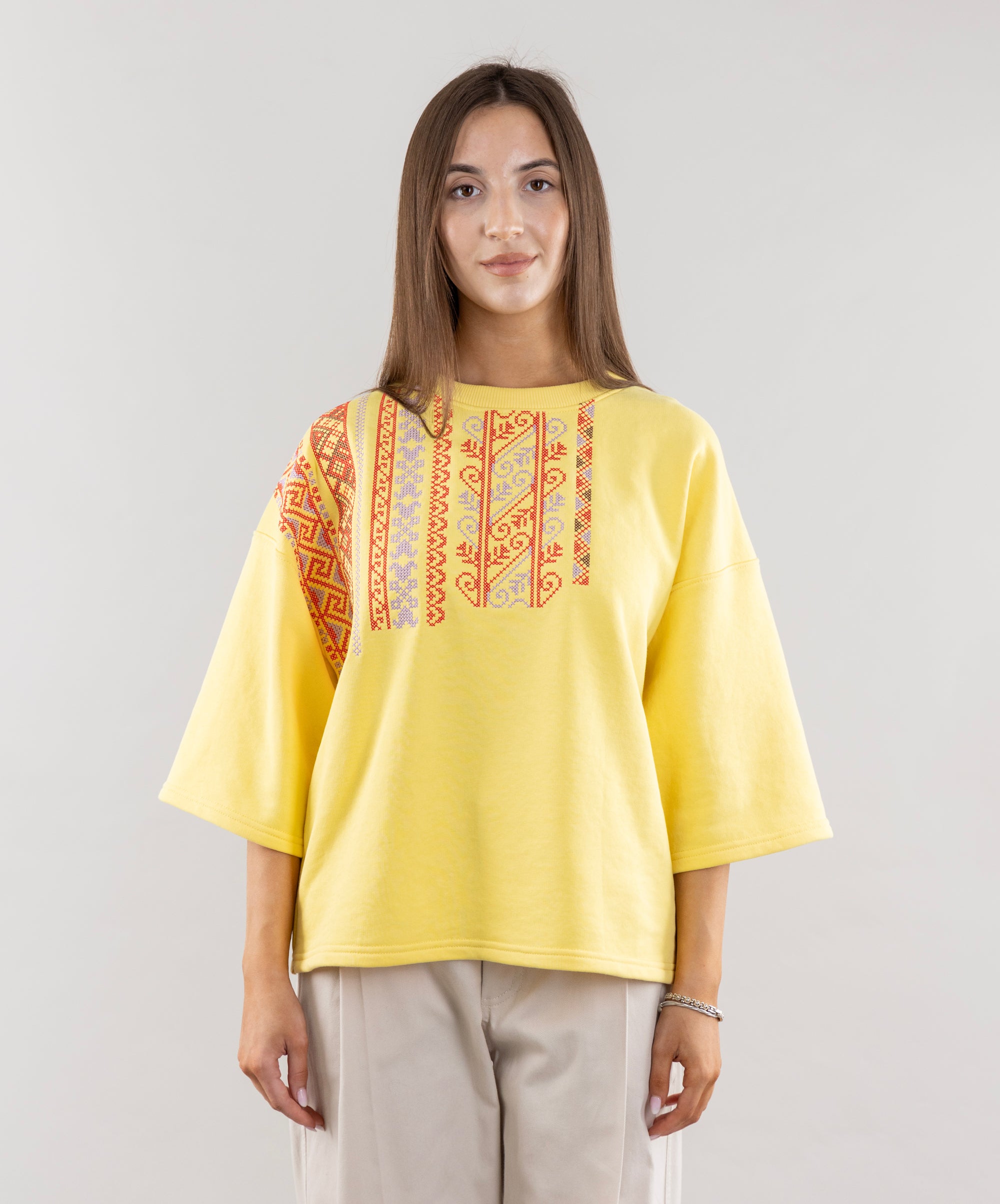 Meet the T-shirt that energizes you with the energy of a bright summer! Its lemon color shines like the sun, and ethnic embroidery adds personality to the look. The 3/4 sleeves are perfect for cool mornings or evenings. This T-shirt will be a great addition to pleated shorts, creating a relaxed and stylish look.