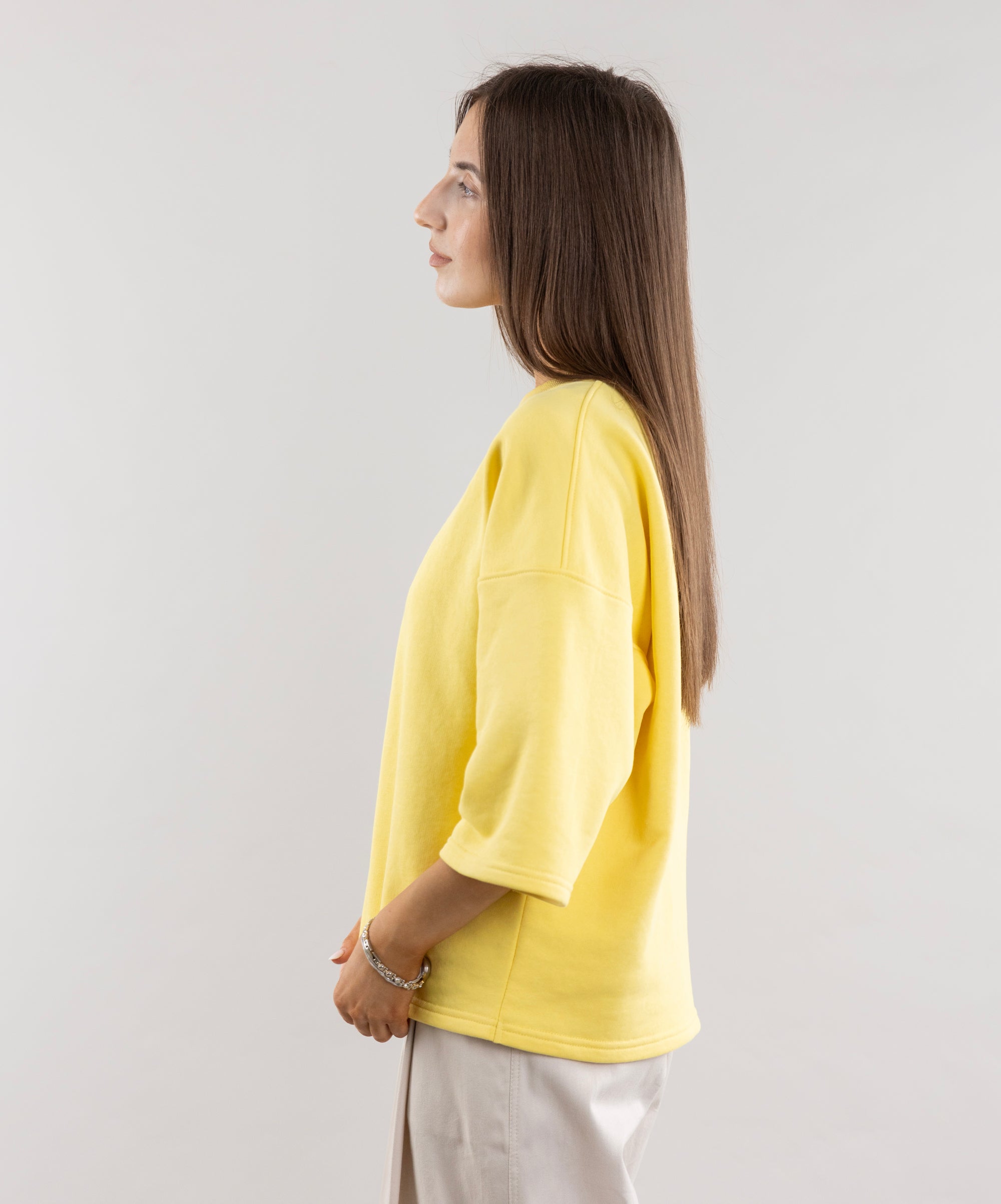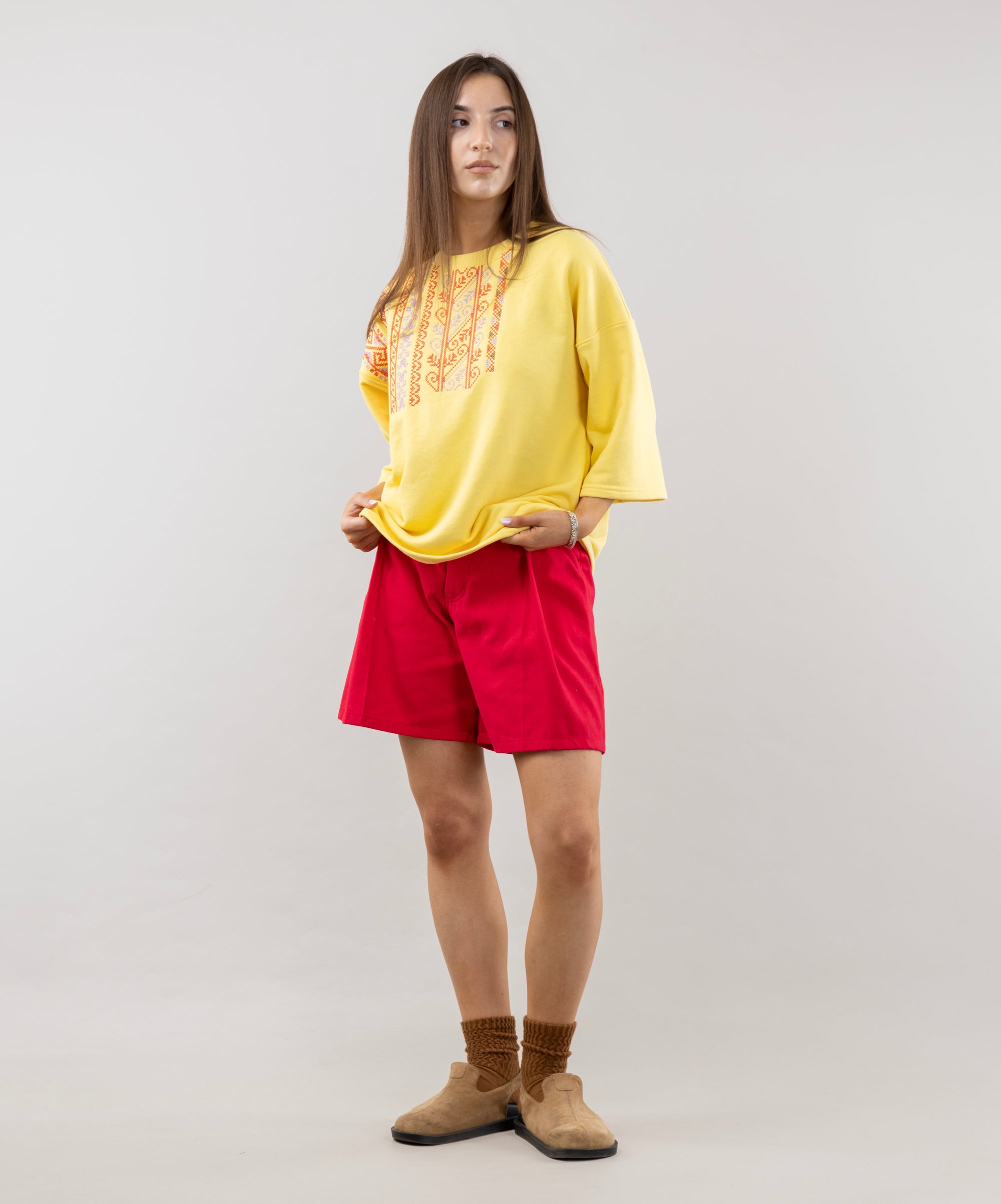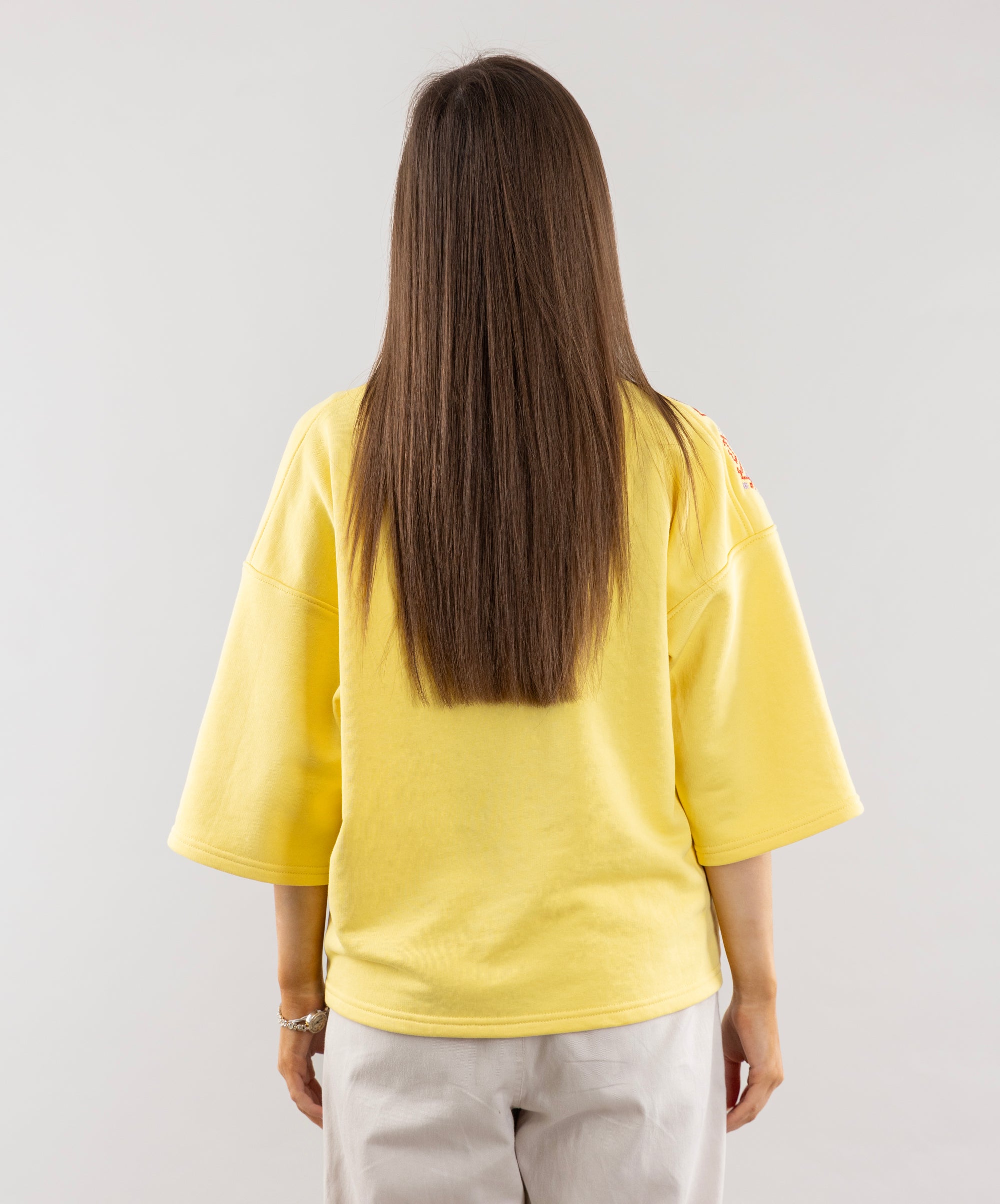 Meet the T-shirt that energizes you with the energy of a bright summer! Its lemon color shines like the sun, and ethnic embroidery adds personality to the look. The 3/4 sleeves are perfect for cool mornings or evenings. This T-shirt will be a great addition to pleated shorts, creating a relaxed and stylish look.