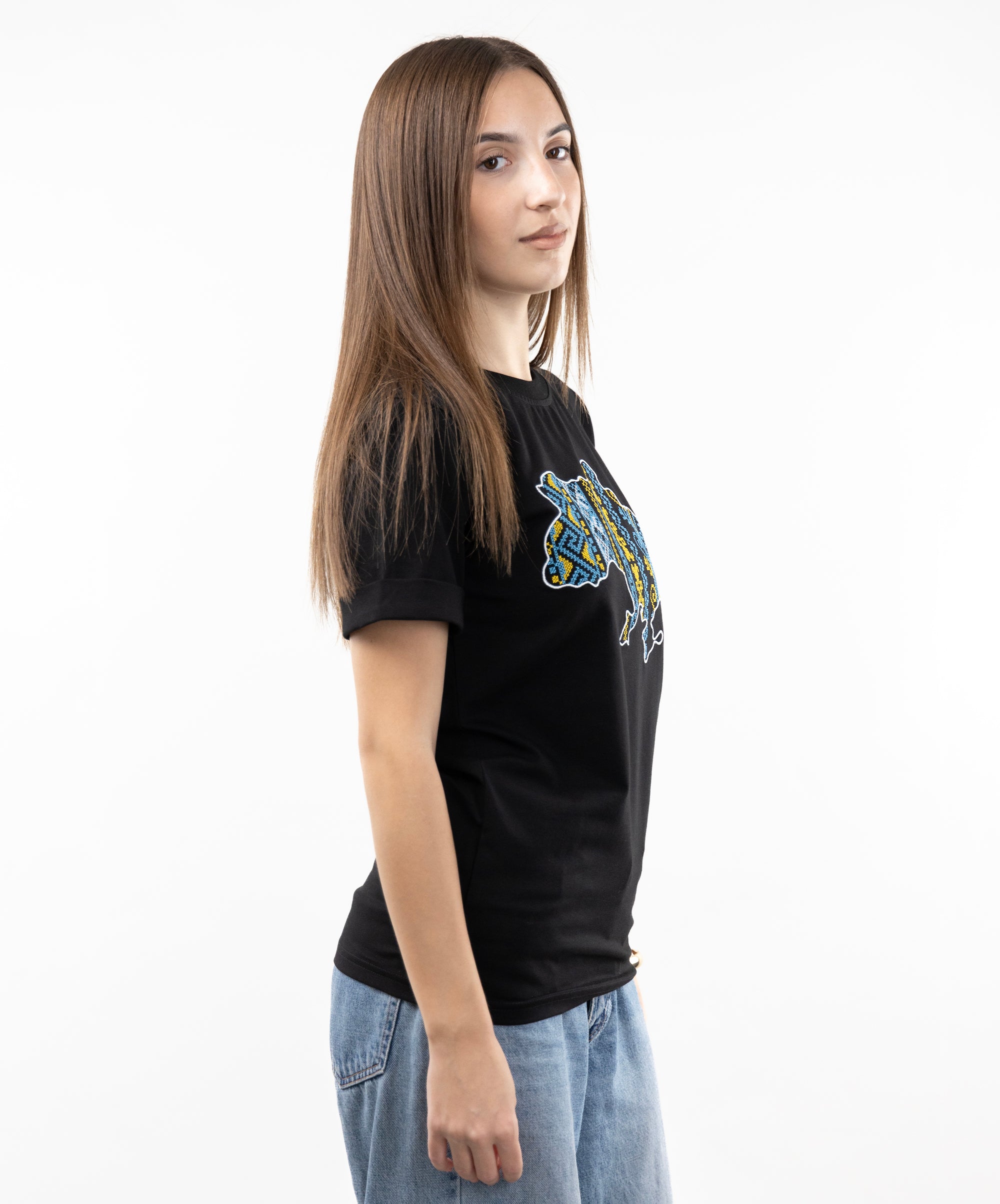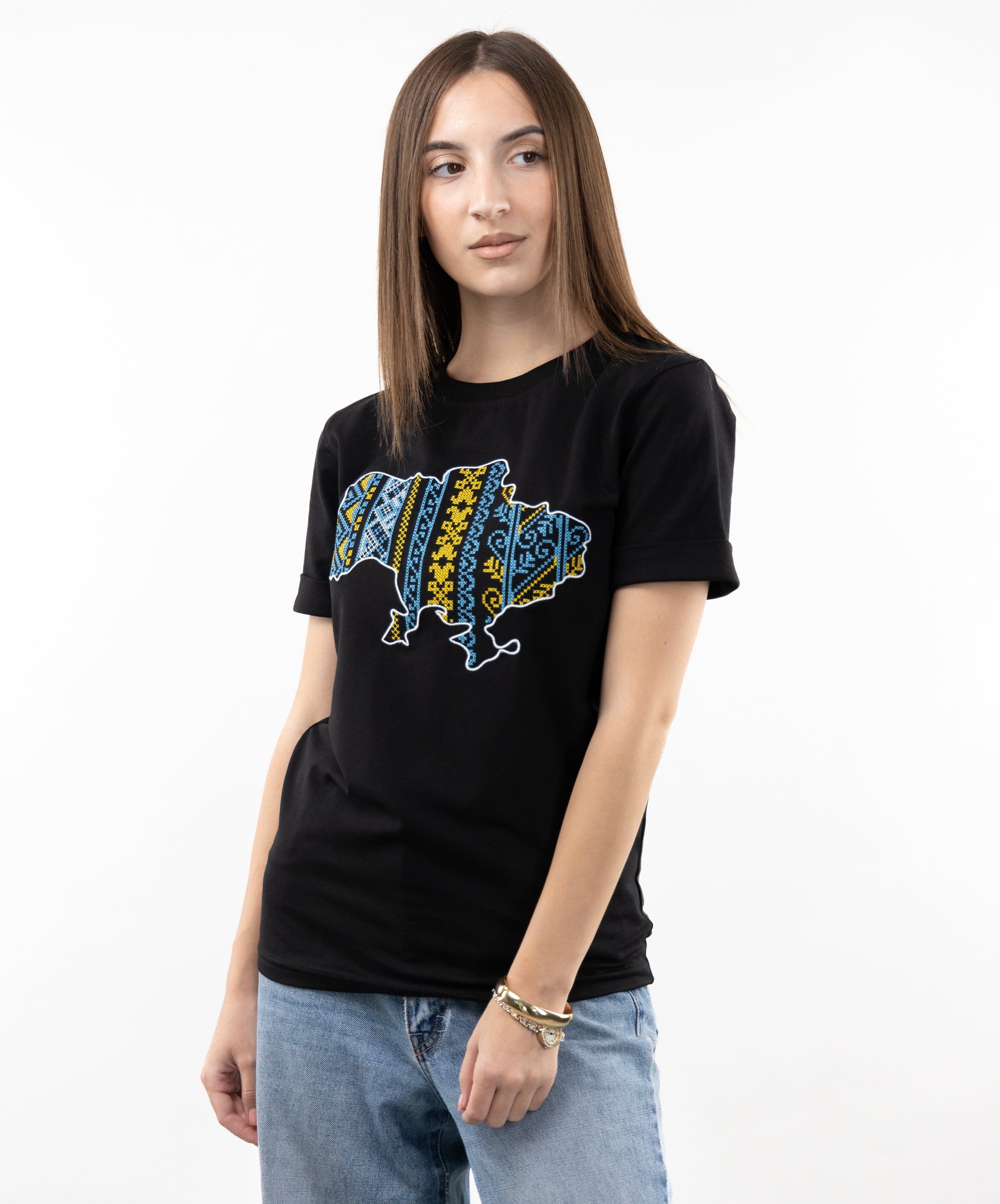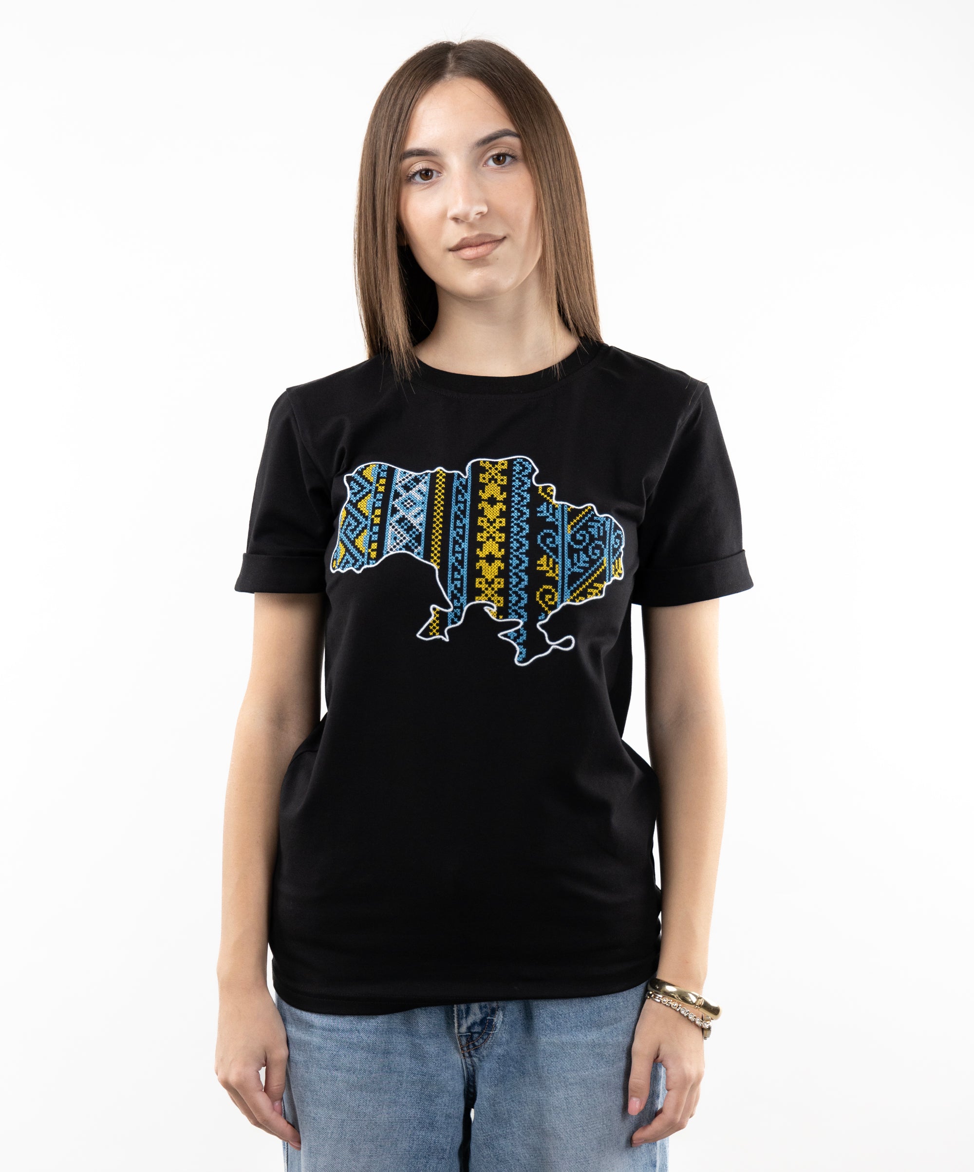 Patriotic T-shirt with an embroidered map of Ukraine. Everything in this model is very restrained and clear: a strict and classic style, impeccable tailoring, high-quality and durable fabric. The embroidery is made in the colours of the Ukrainian national symbols.