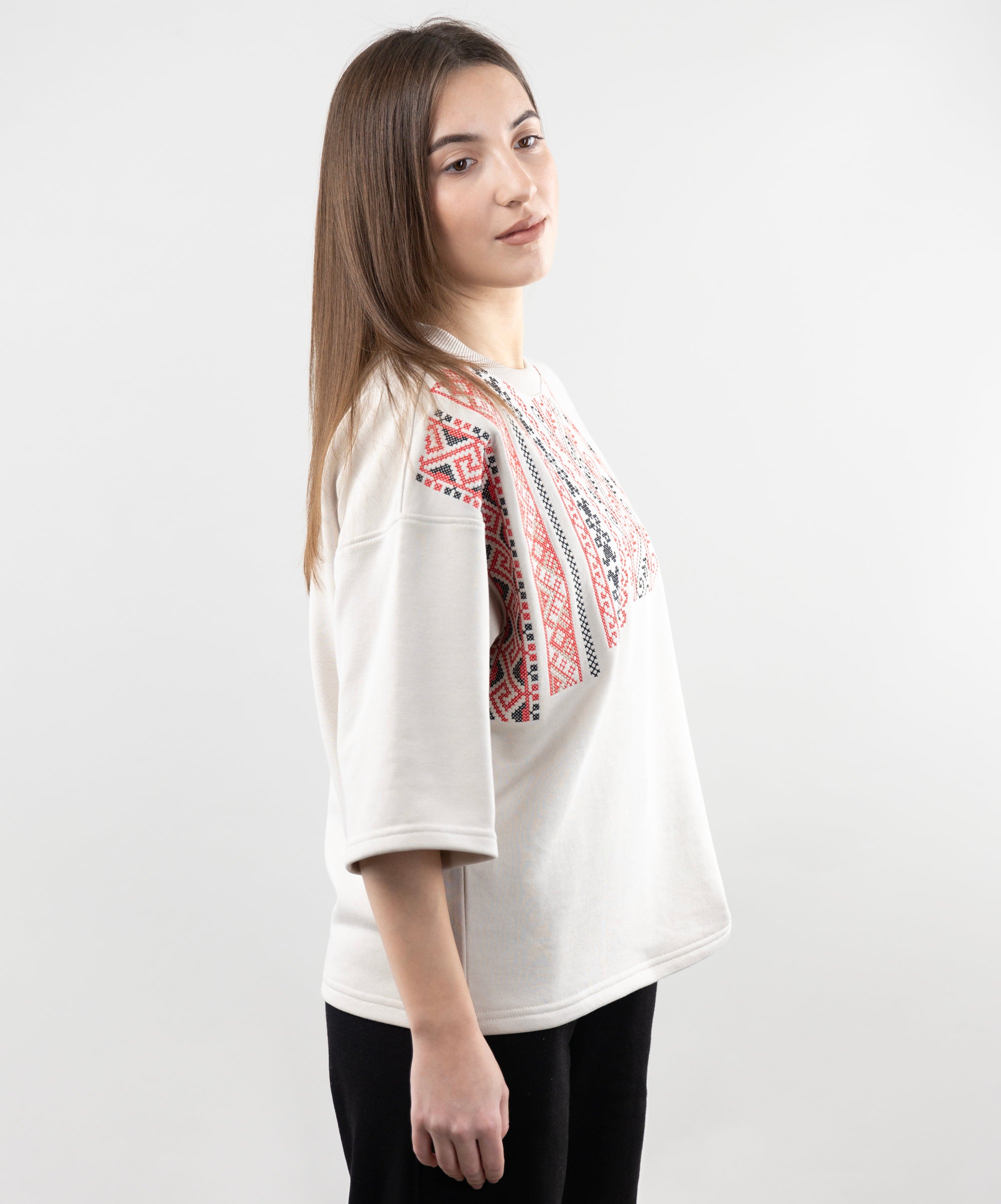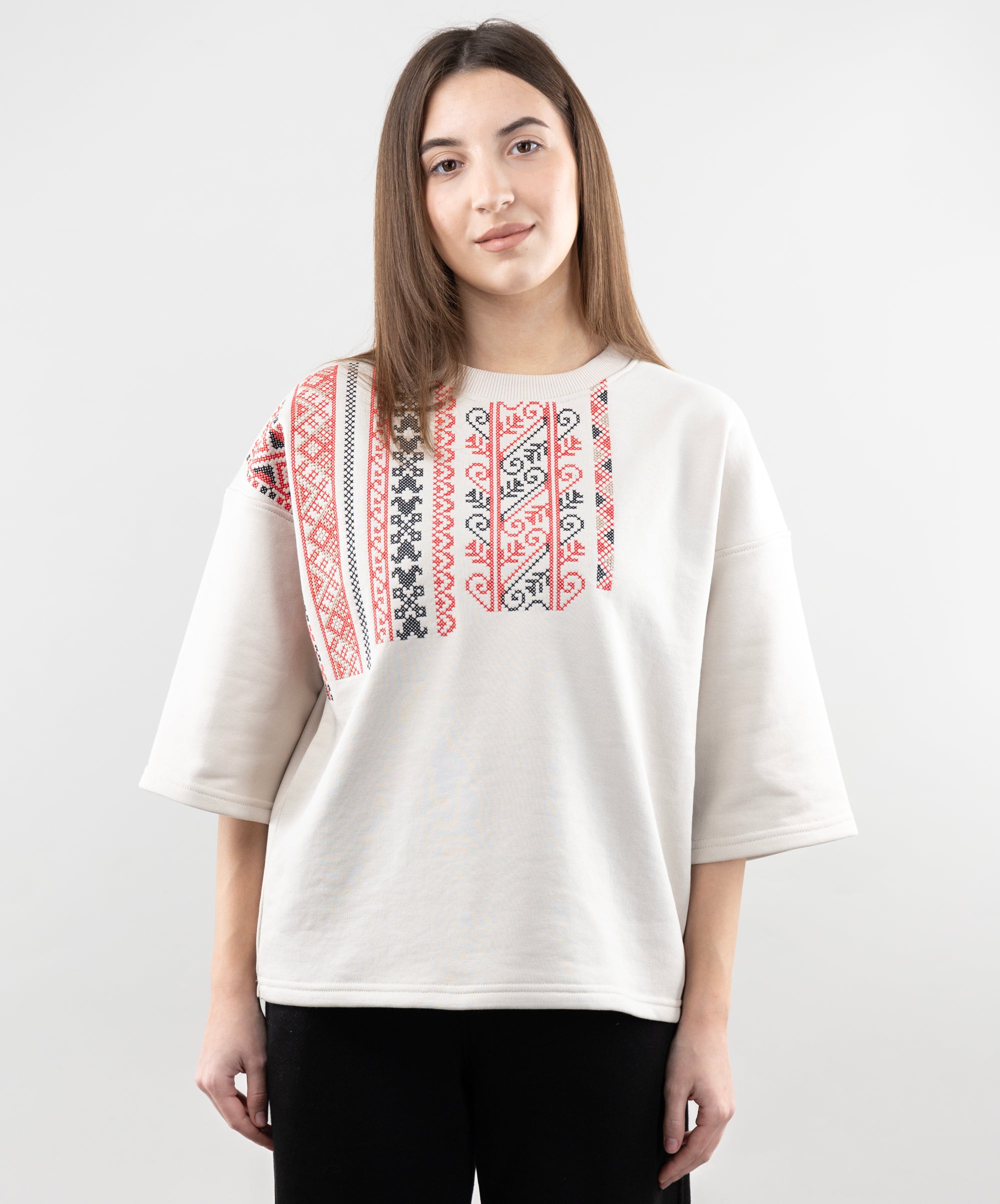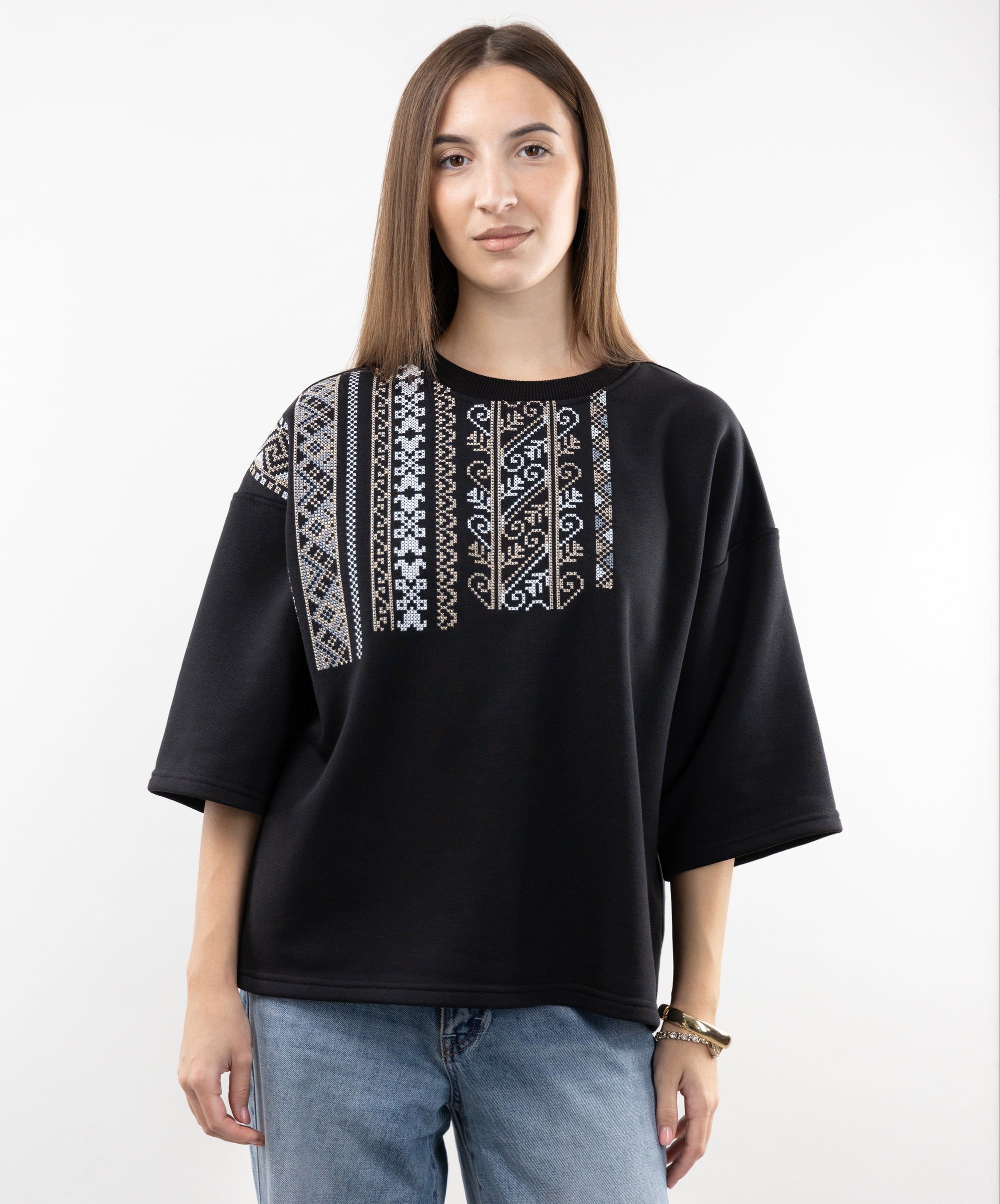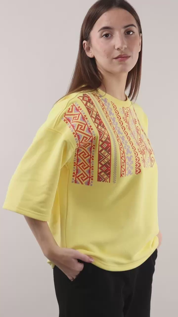 Meet the T-shirt that energizes you with the energy of a bright summer! Its lemon color shines like the sun, and ethnic embroidery adds personality to the look. The 3/4 sleeves are perfect for cool mornings or evenings. This T-shirt will be a great addition to pleated shorts, creating a relaxed and stylish look.