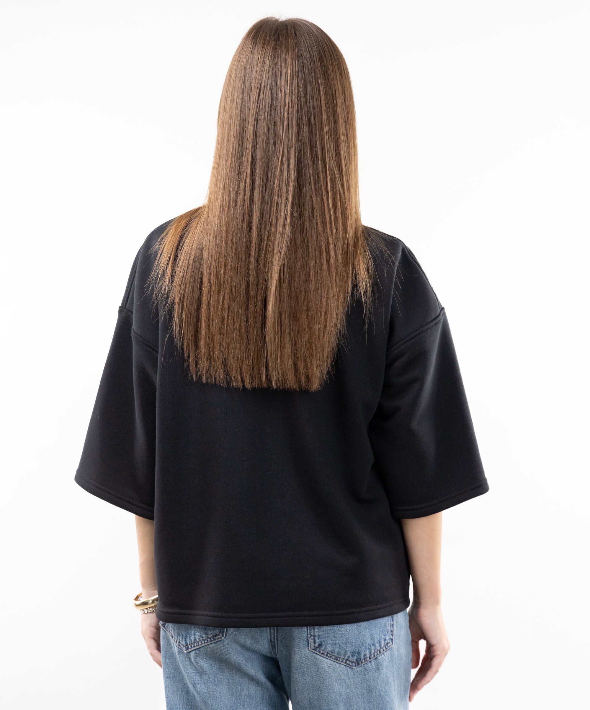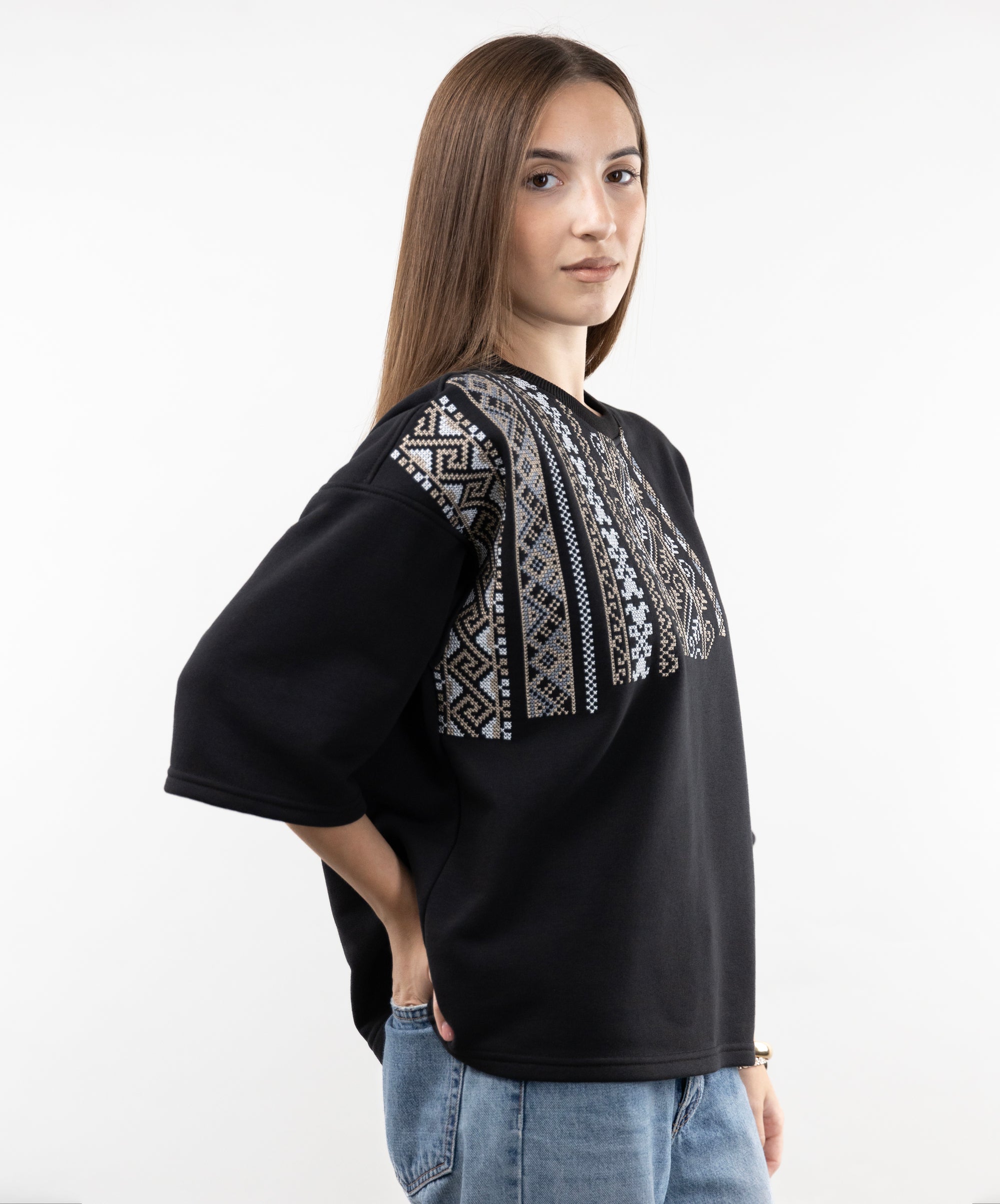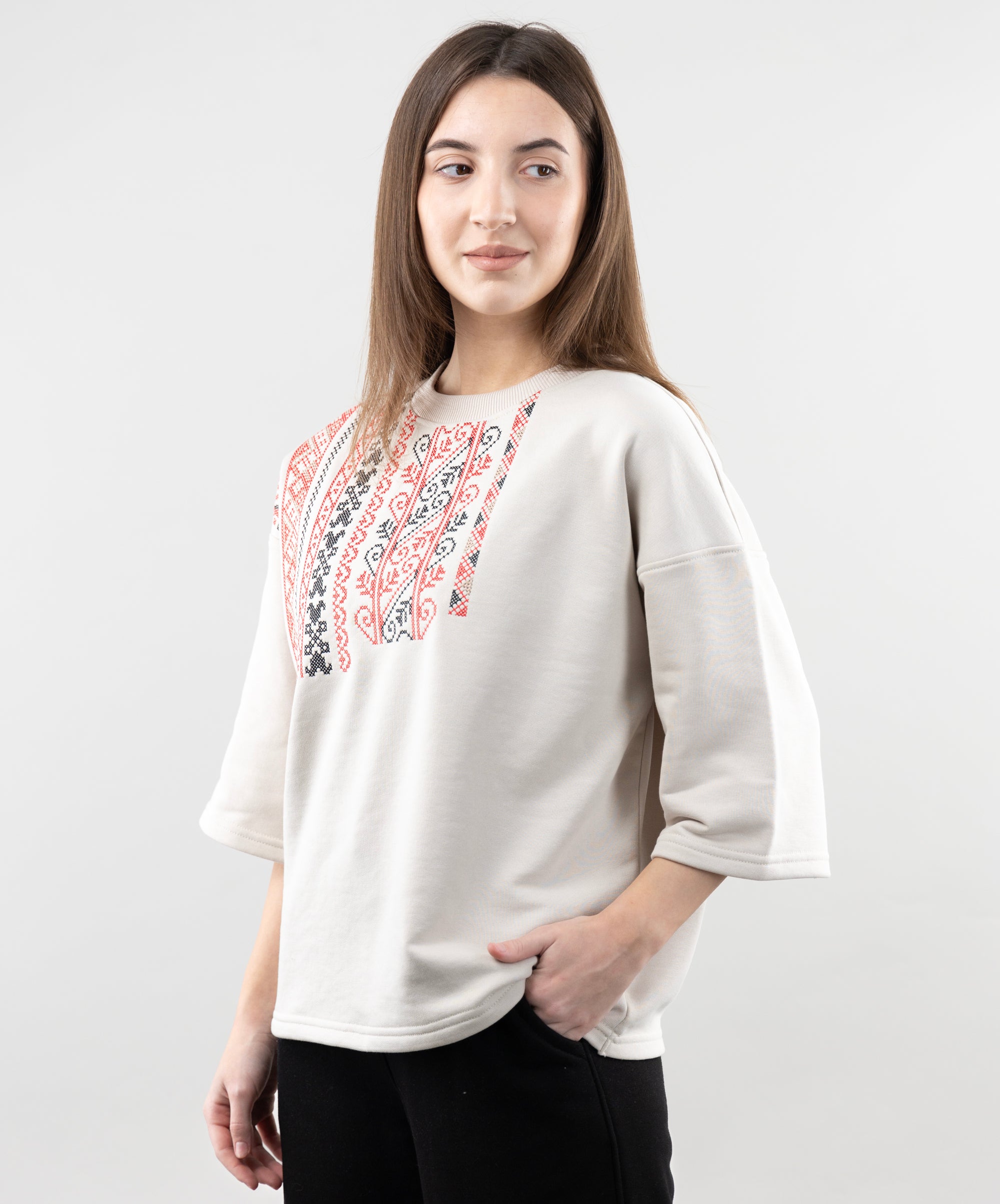 Meet the T-shirt that energizes you with the energy of a bright summer! Its lemon color shines like the sun, and ethnic embroidery adds personality to the look. The 3/4 sleeves are perfect for cool mornings or evenings. This T-shirt will be a great addition to pleated shorts, creating a relaxed and stylish look.