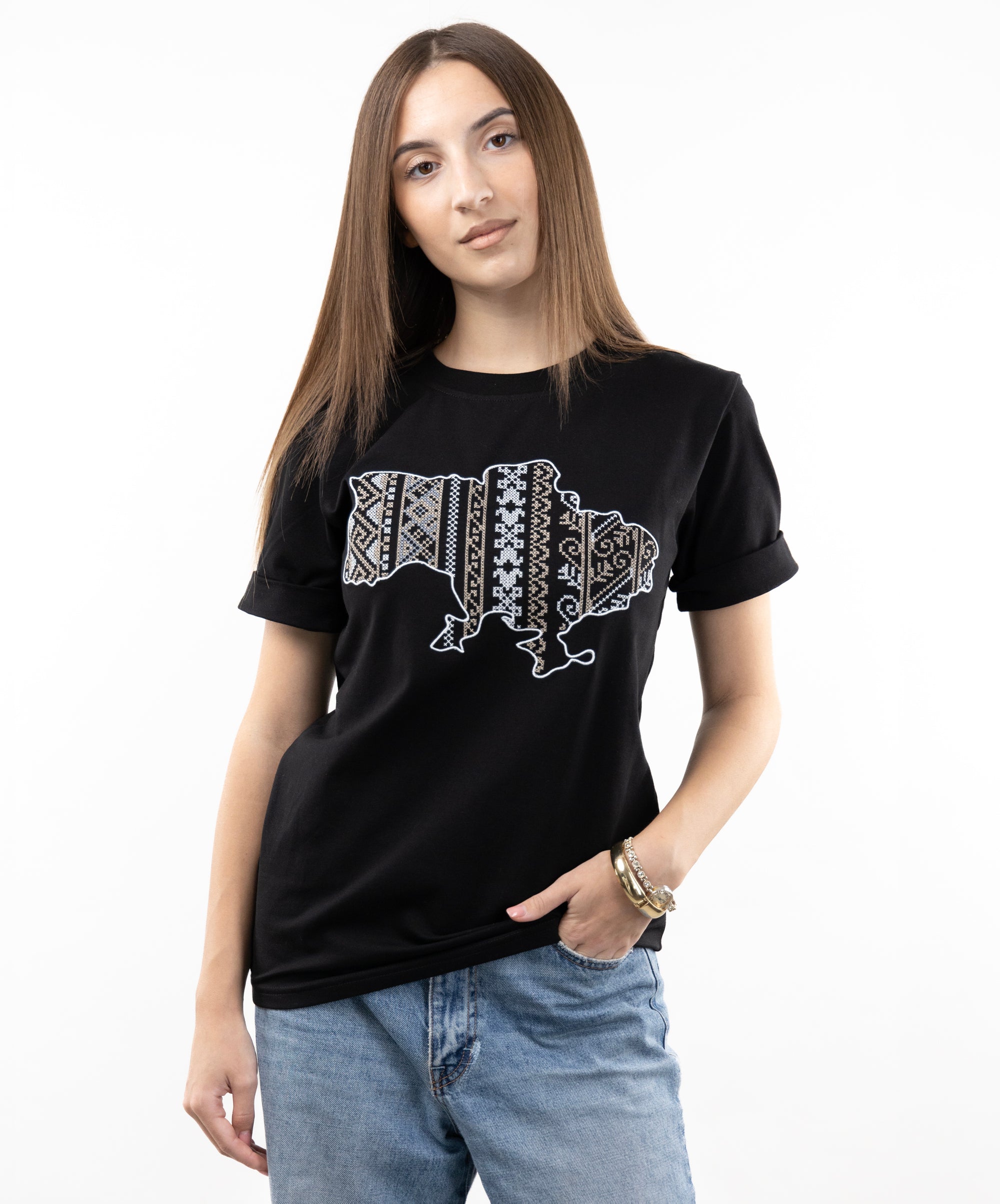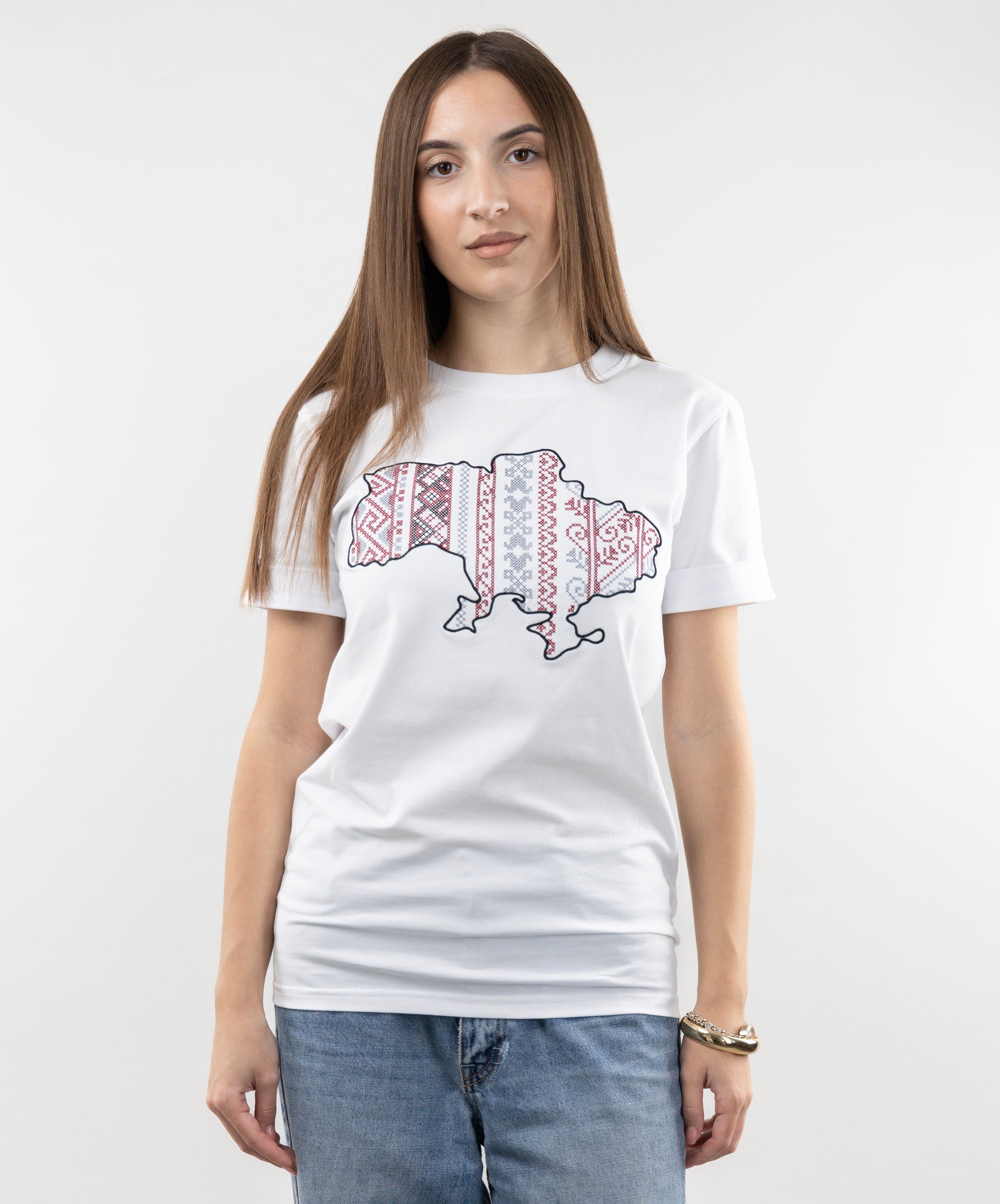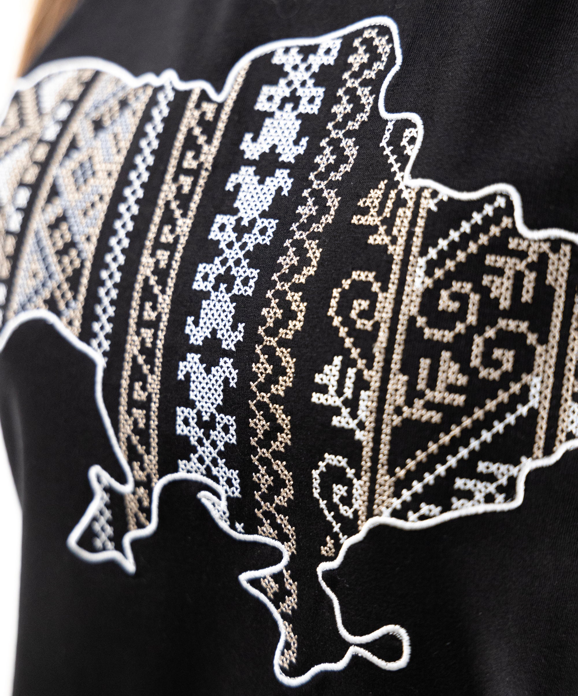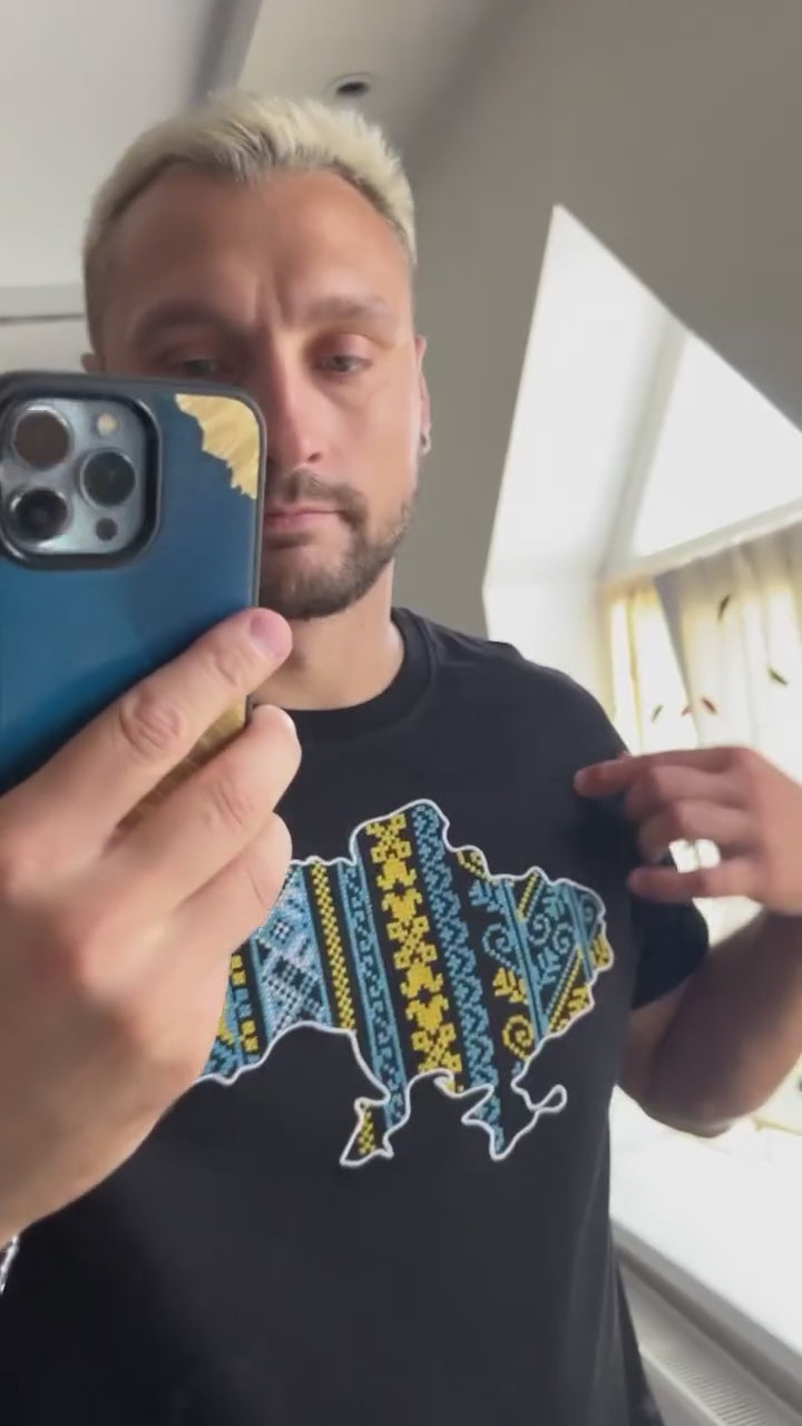 Patriotic T-shirt with an embroidered map of Ukraine. Everything in this model is very restrained and clear: a strict and classic style, impeccable tailoring, high-quality and durable fabric. The embroidery is made in the colours of the Ukrainian national symbols.
