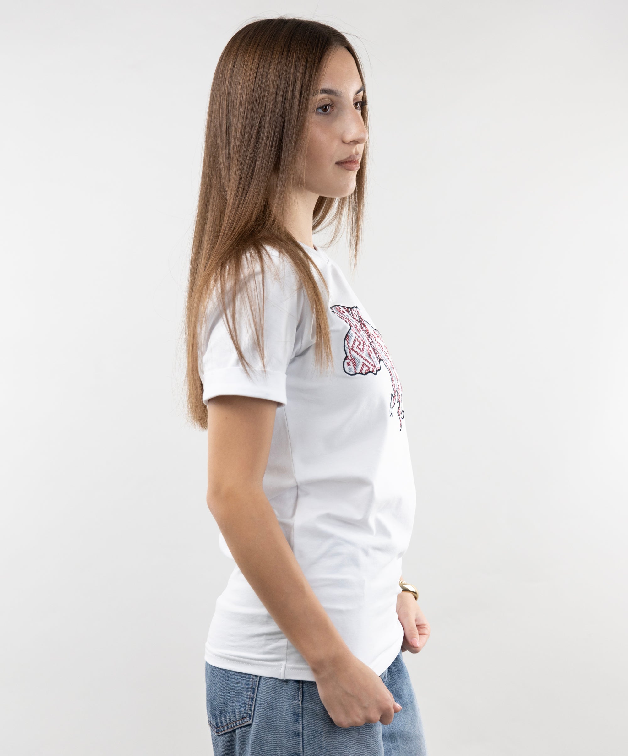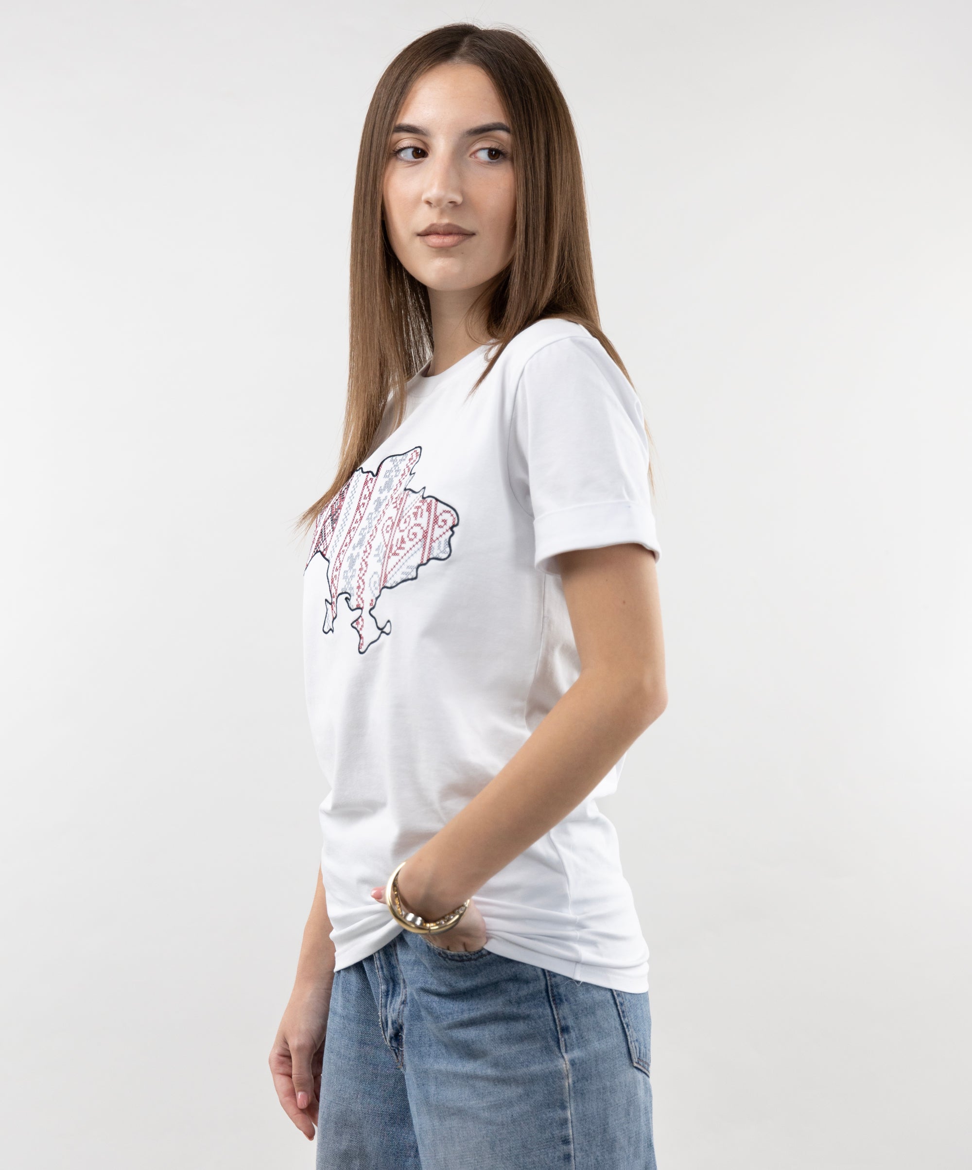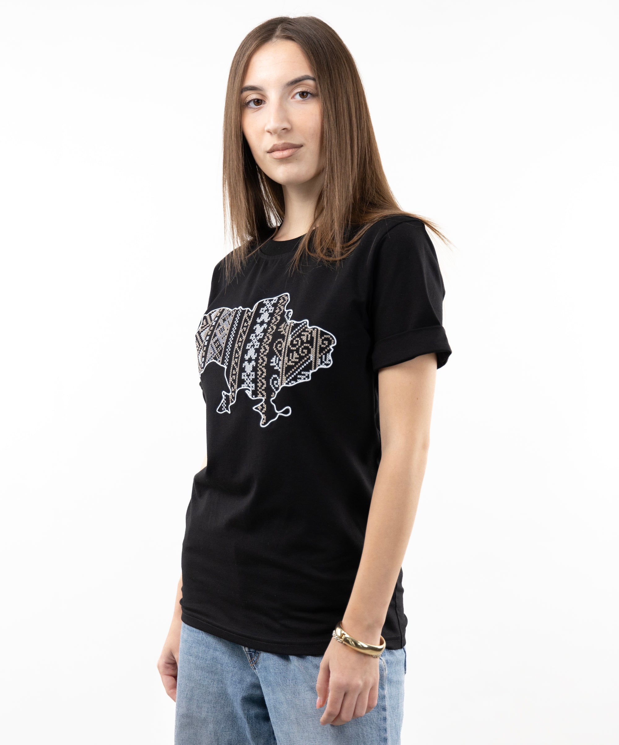 Patriotic T-shirt with an embroidered map of Ukraine. Everything in this model is very restrained and clear: a strict and classic style, impeccable tailoring, high-quality and durable fabric. The embroidery is made in the colours of the Ukrainian national symbols.