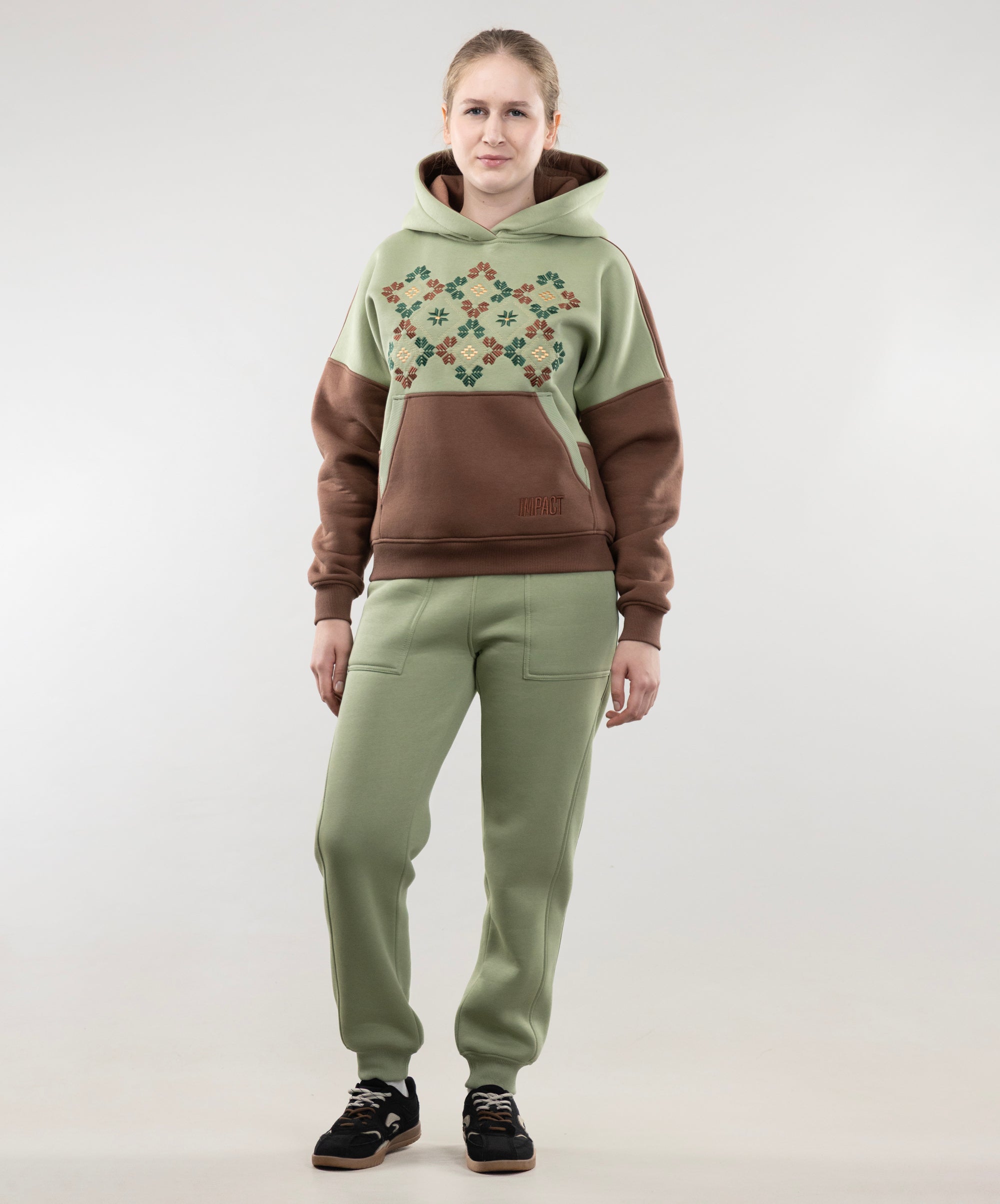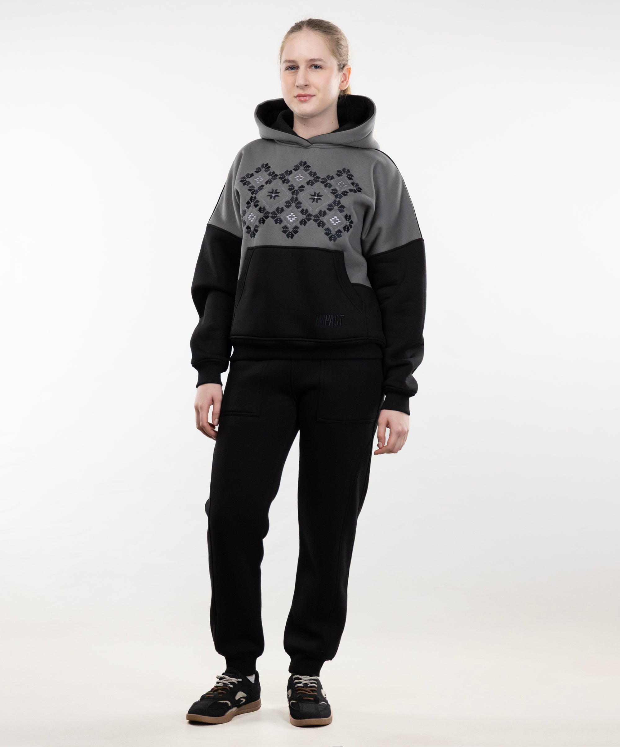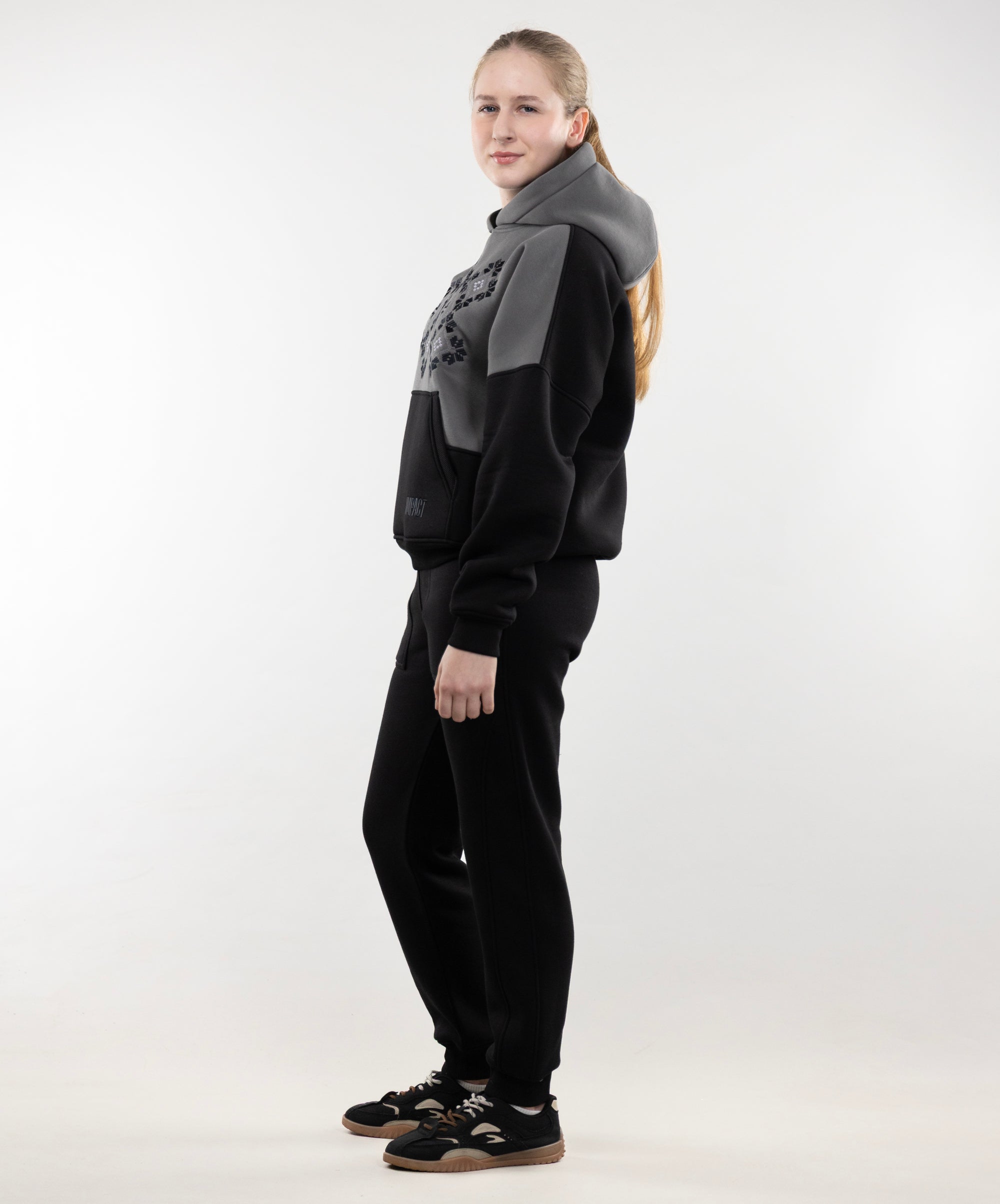This is unisex model, suitable for both women and men. Hoodie goes well with sports pants, cotton joggers, and cropped pants from "Impact".