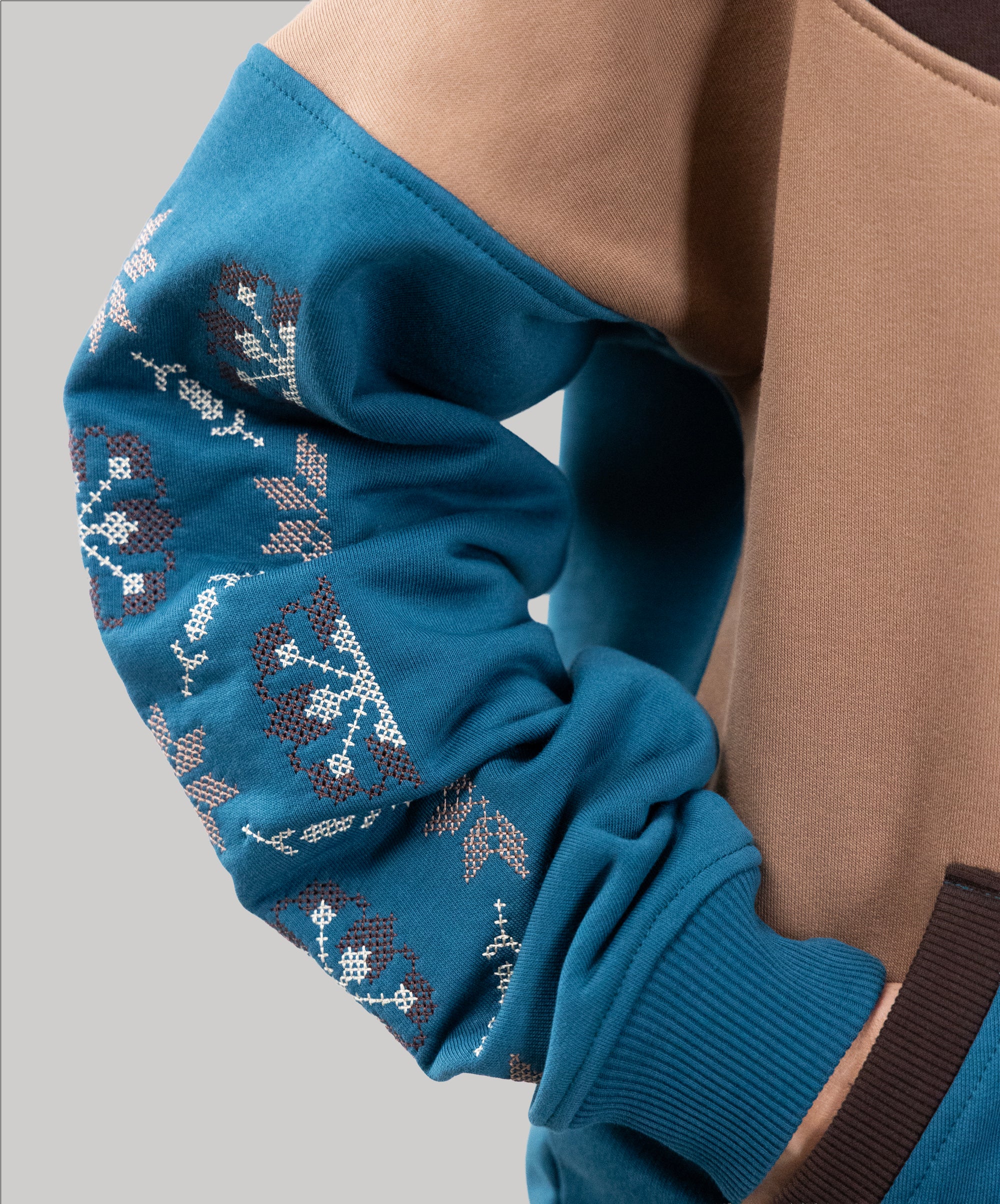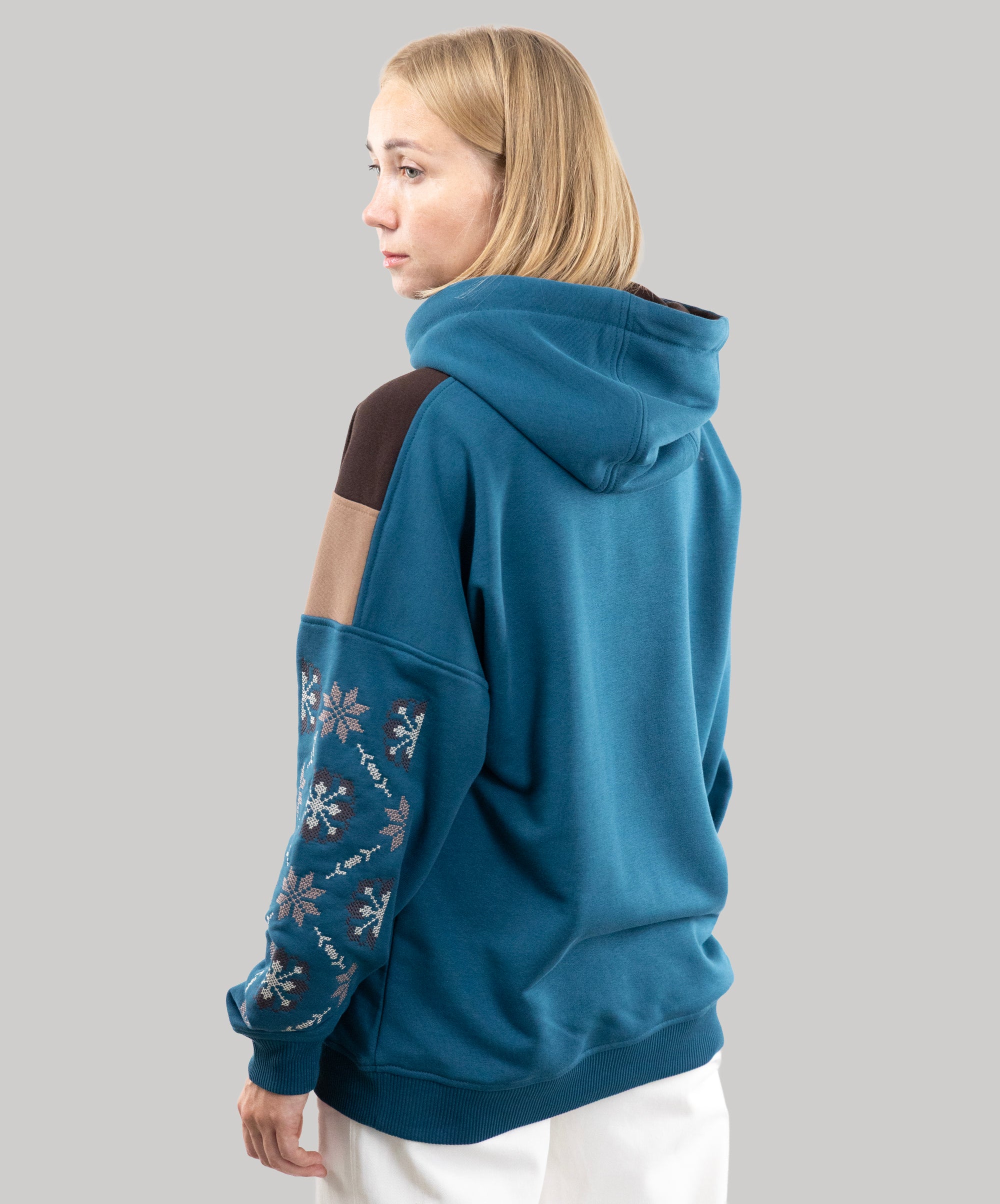 We have long dreamed of creating a hoodie with embroidery, so meet the “Dnipro” model. This unlined hoodie combines three colors, has large embroidery on the sleeves, and a kangaroo pocket.