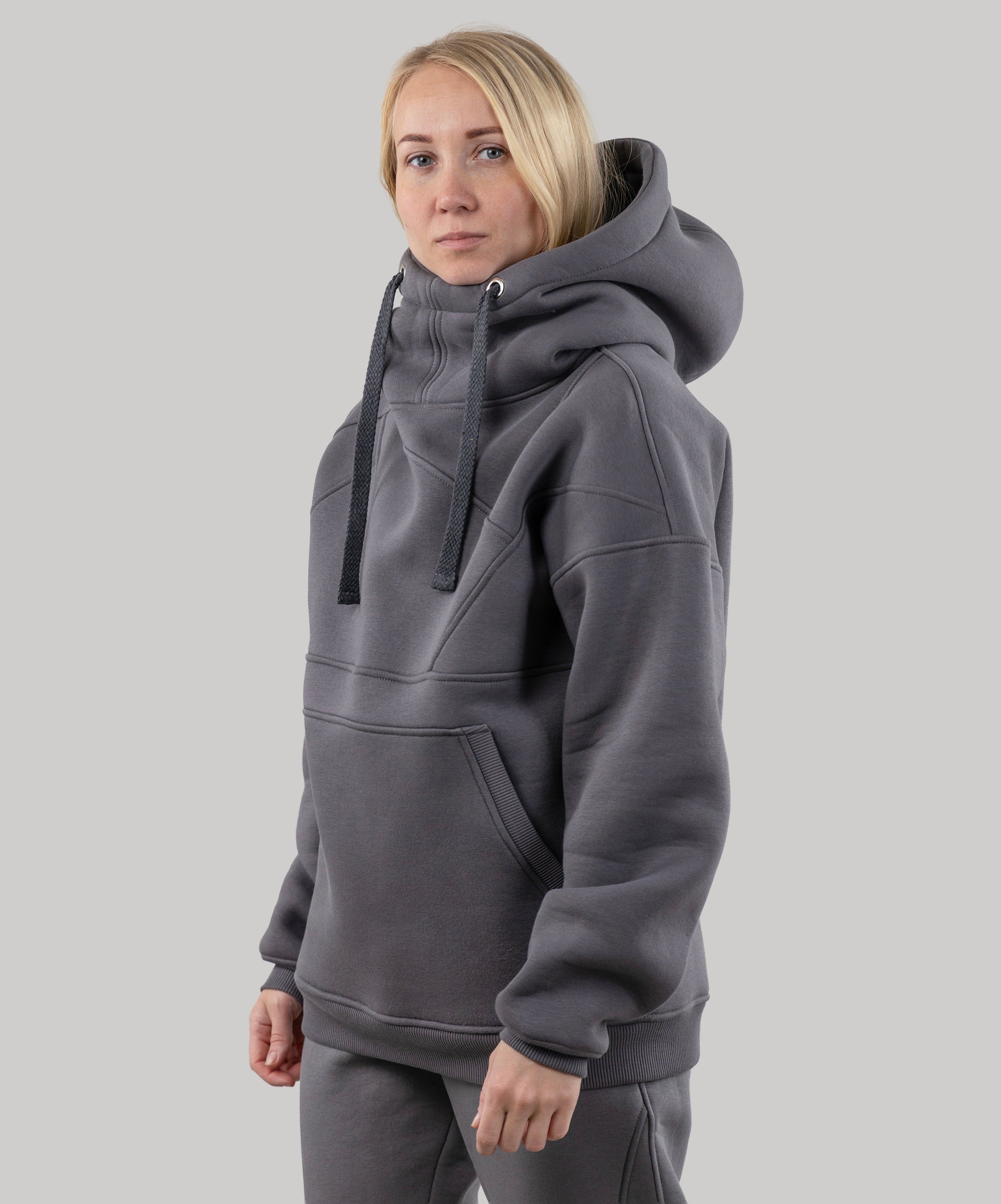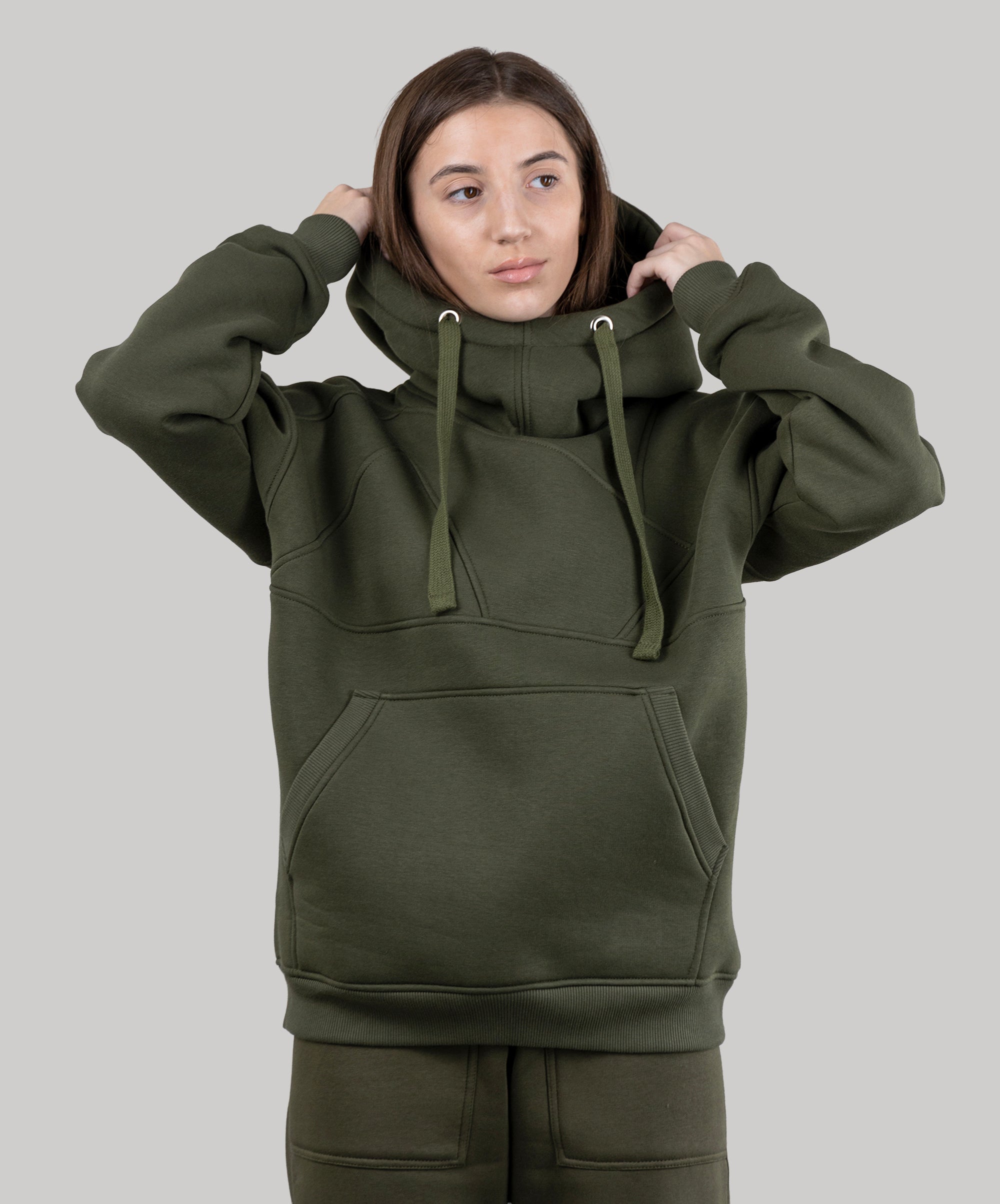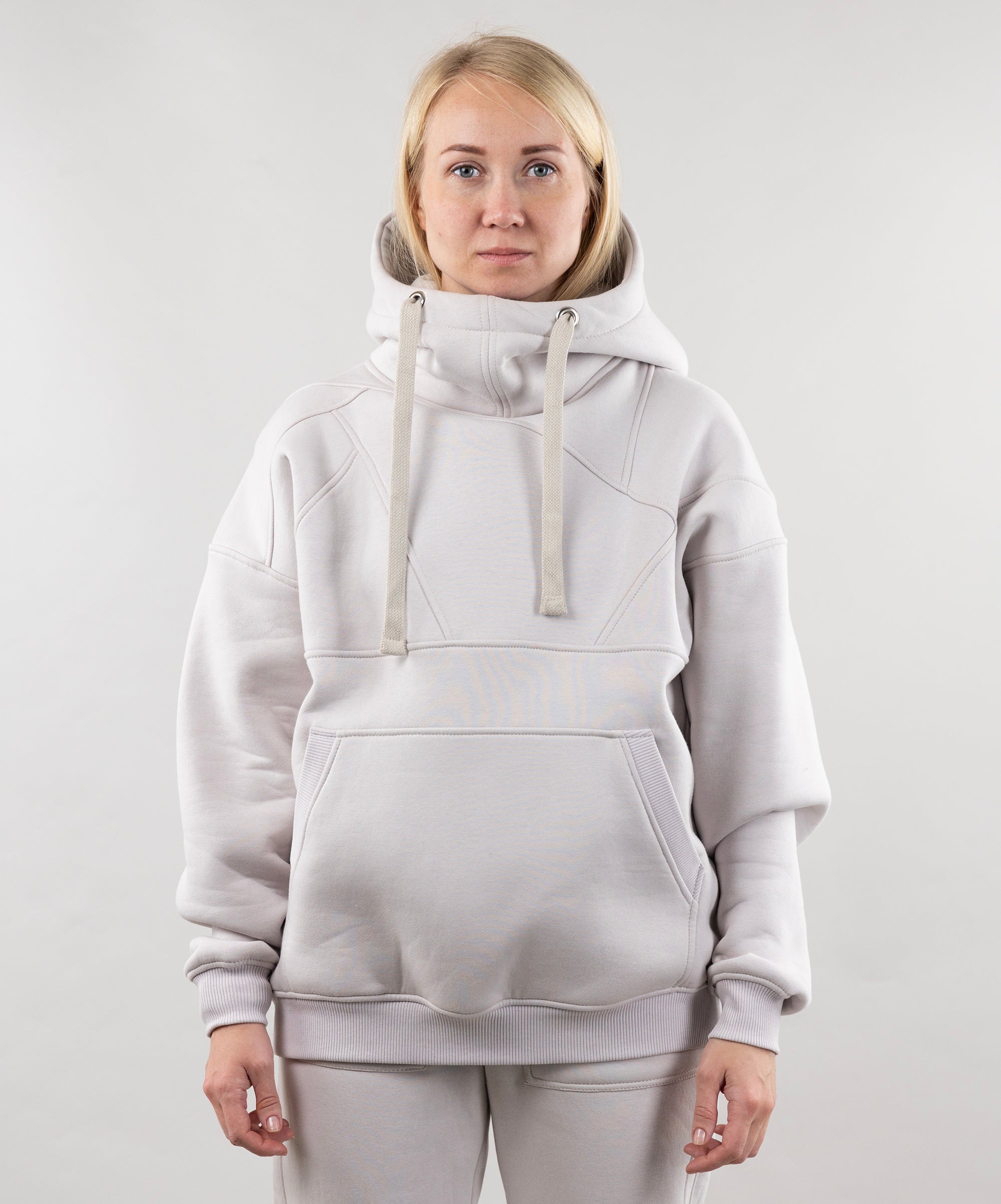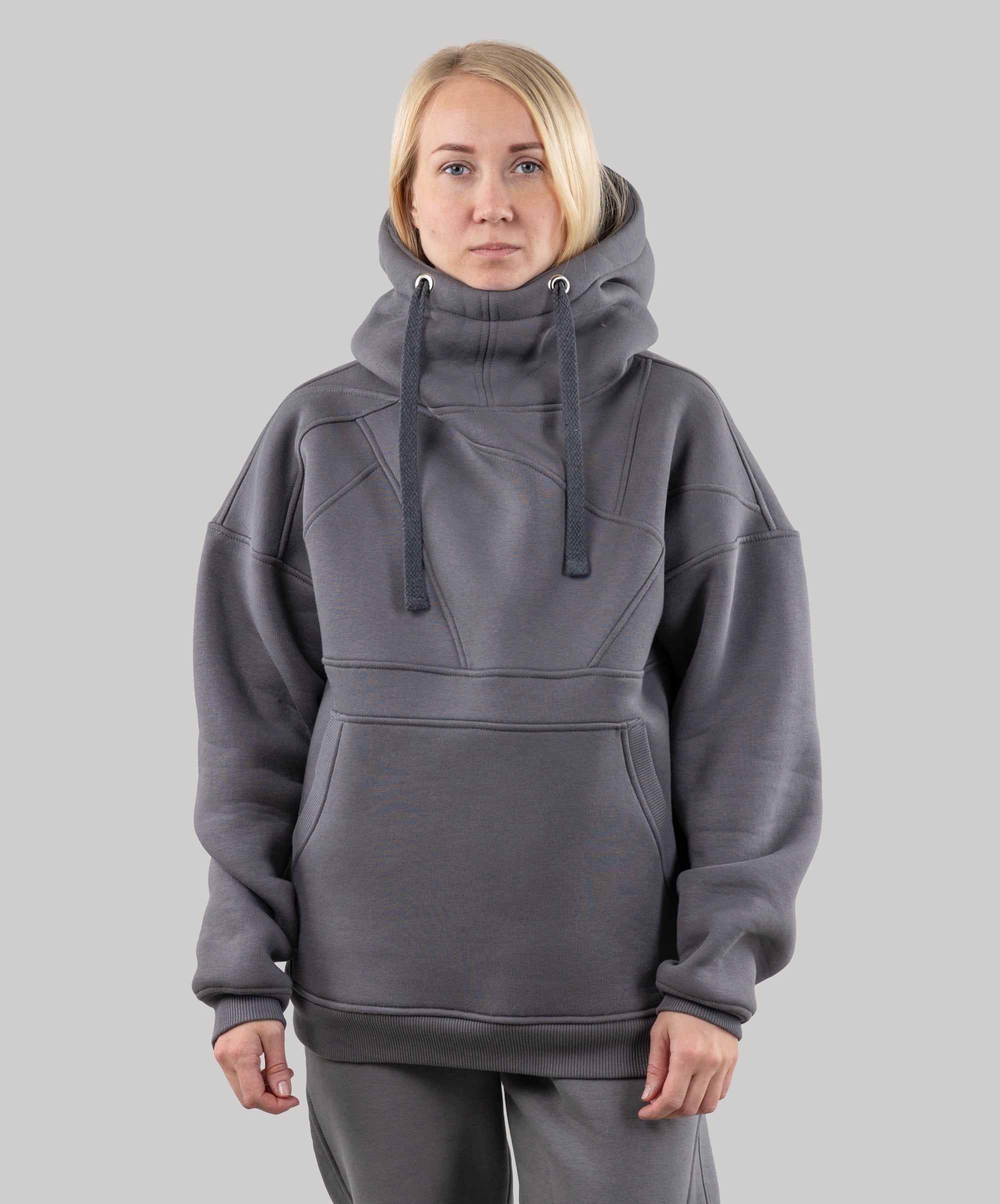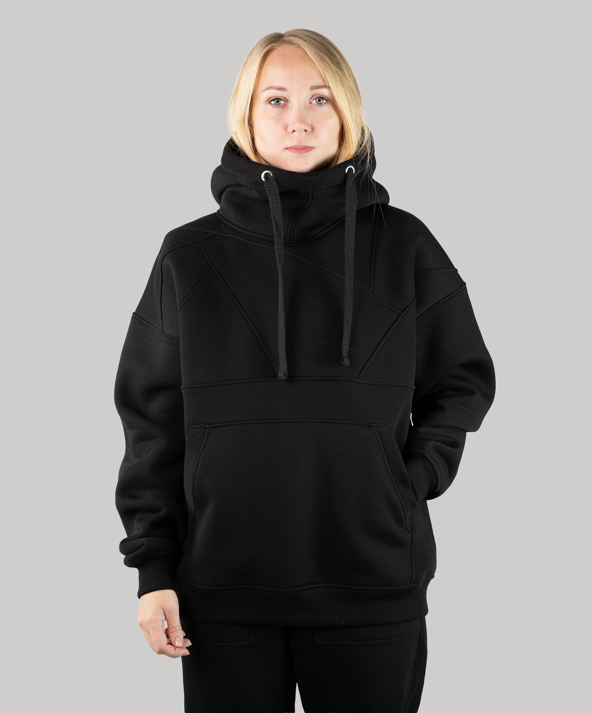 In addition to the high-neck hood, we have incorporated a complex polygonal design. The upper part of the hoodie is assembled from small quadrilaterals of various sizes, creating a pattern of seams. The elongated oversized fit ensures maximum comfort, while the fabric with a dense inner pile will keep you warm.