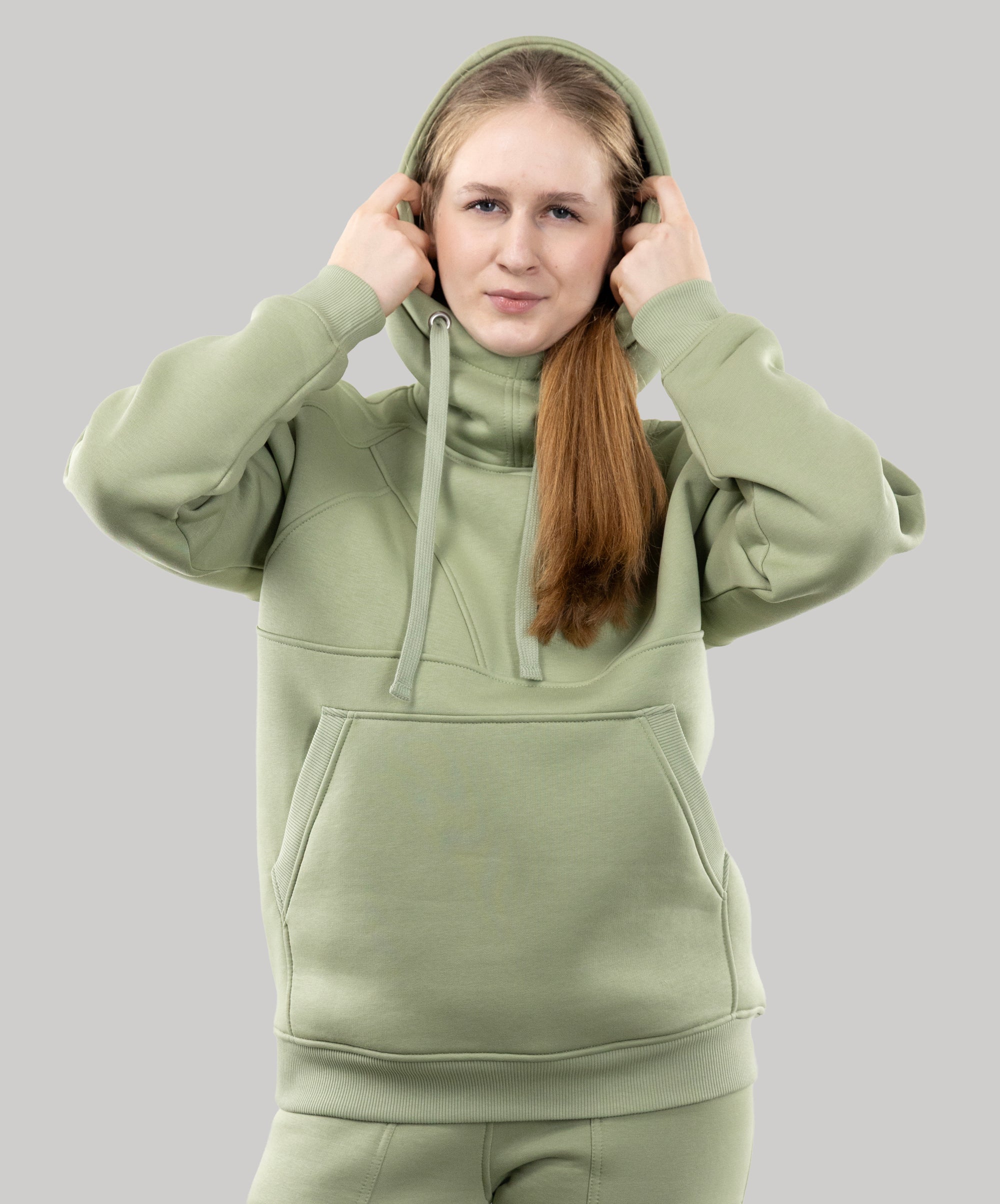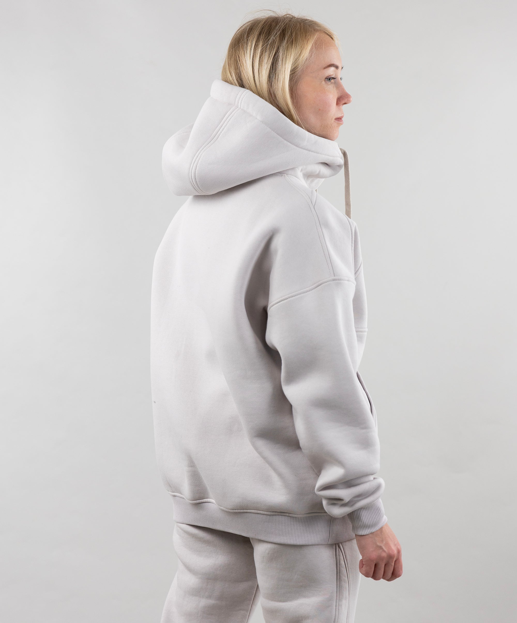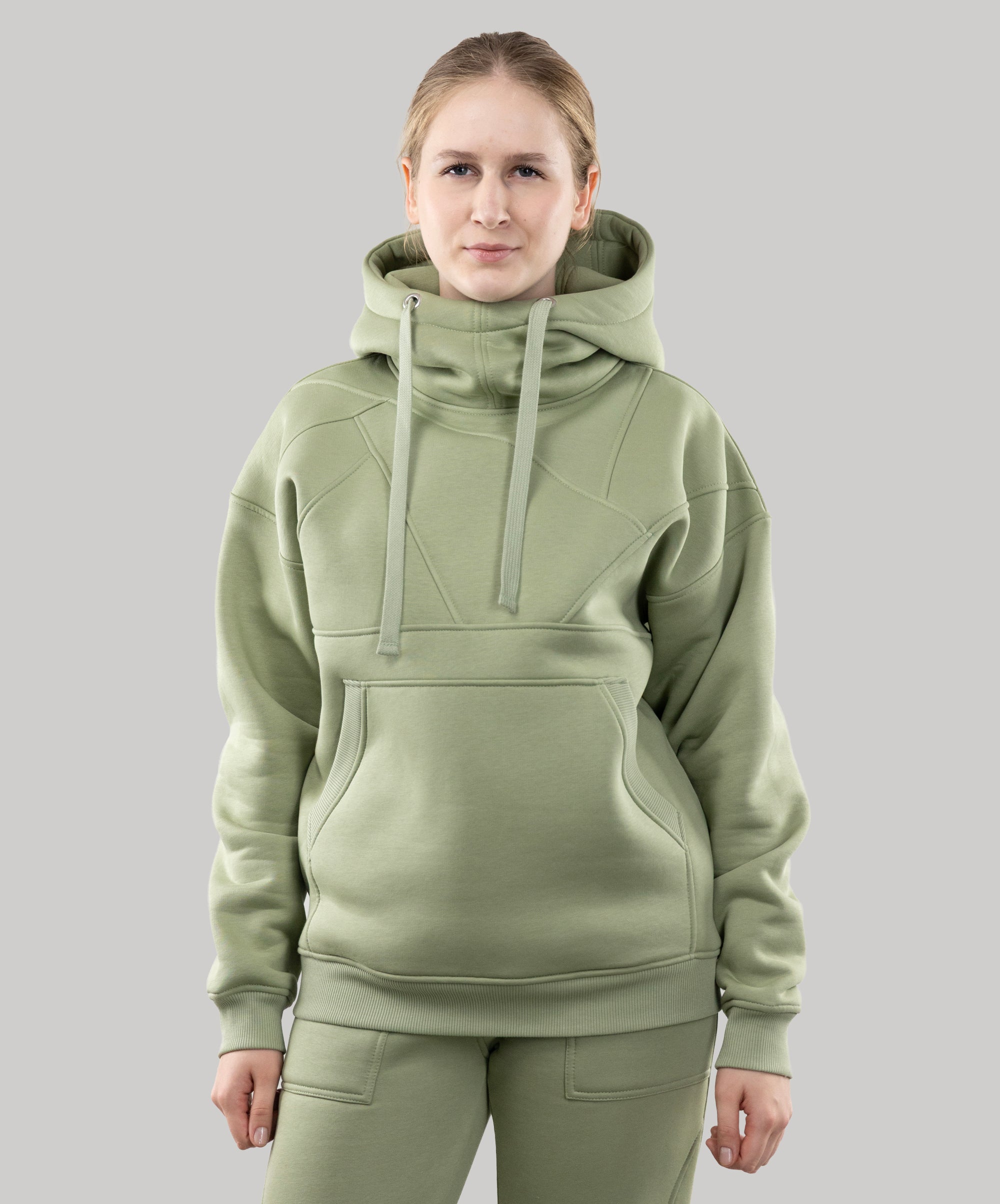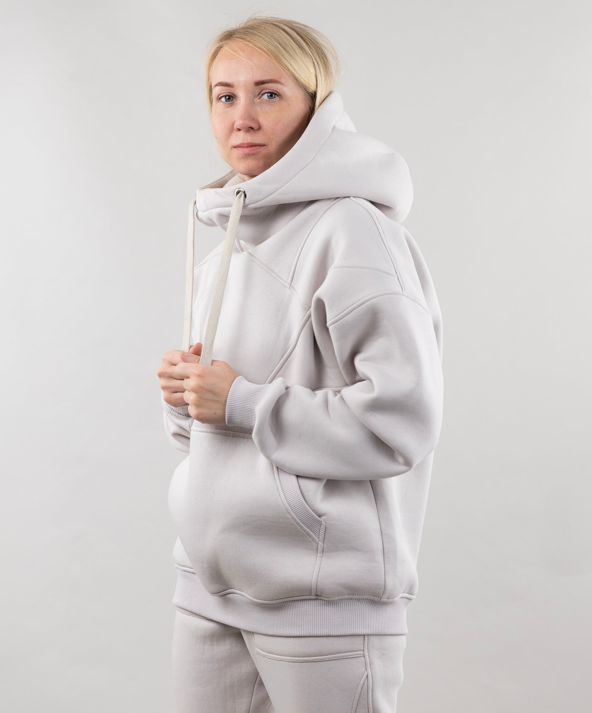 In addition to the high-neck hood, we have incorporated a complex polygonal design. The upper part of the hoodie is assembled from small quadrilaterals of various sizes, creating a pattern of seams. The elongated oversized fit ensures maximum comfort, while the fabric with a dense inner pile will keep you warm.