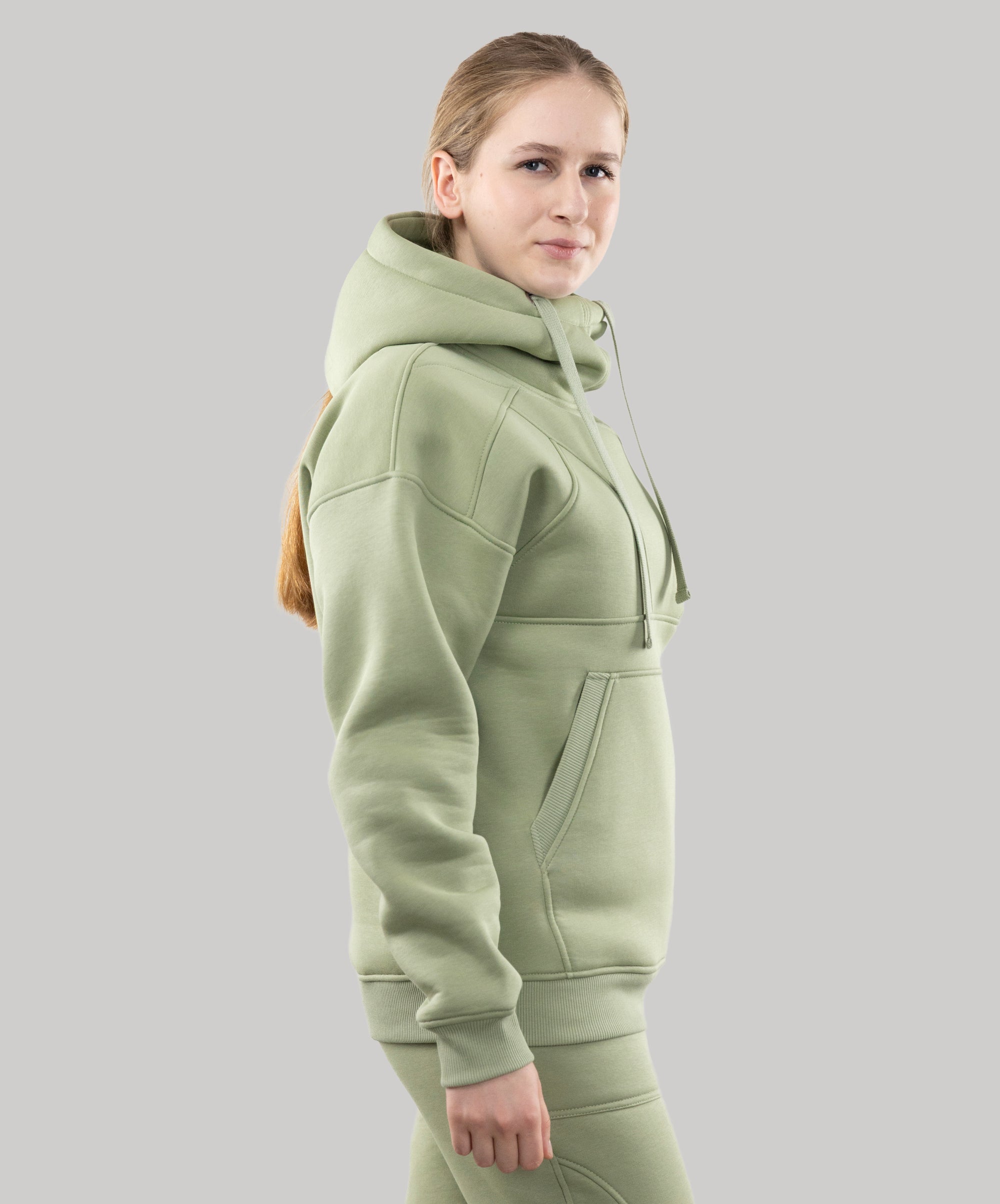 Brushed knitted fabric, with warm fleece on the backside. Three-thread fleece shows excellent performance in use, retains its shape and color after washing, and does not form pills.