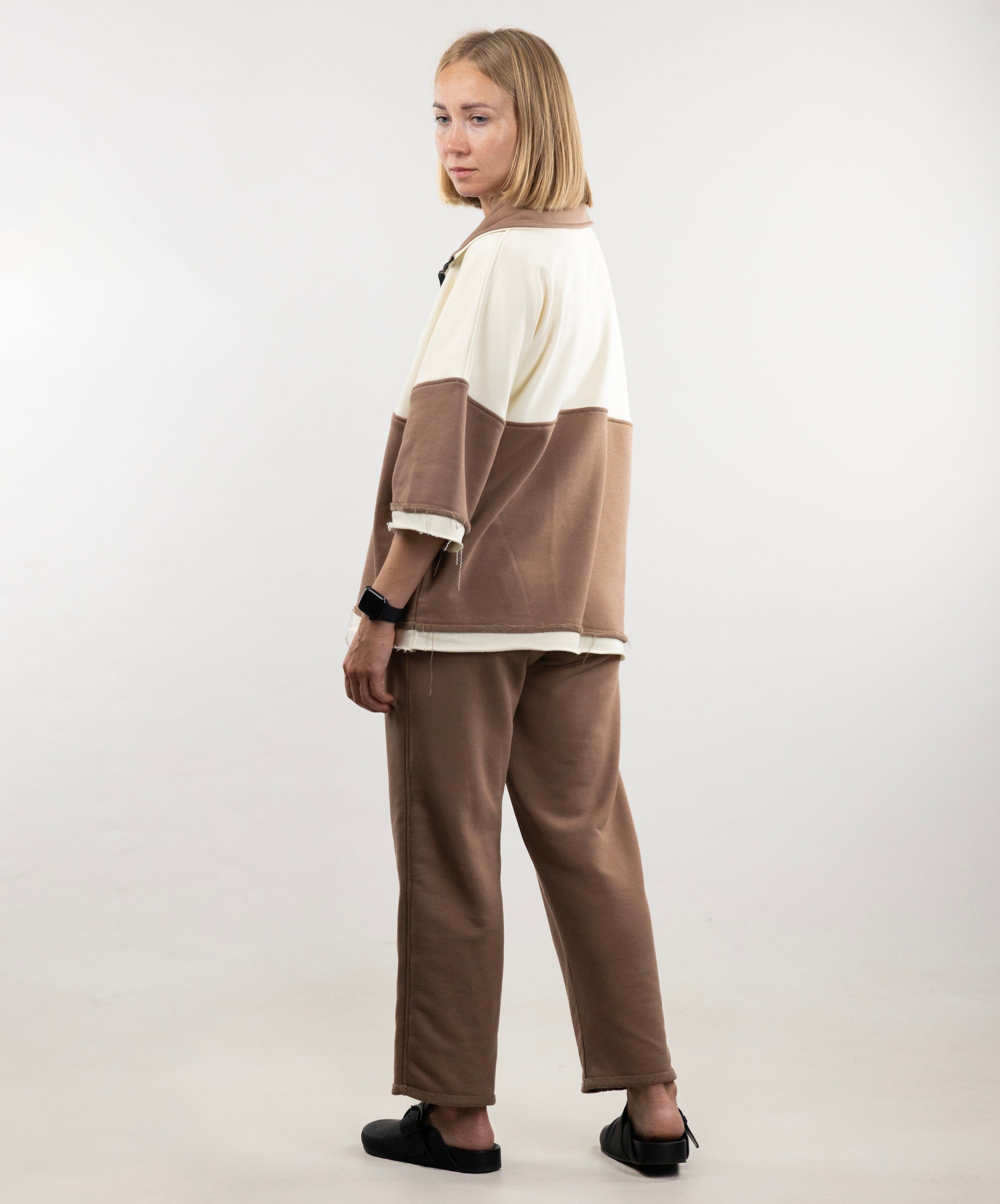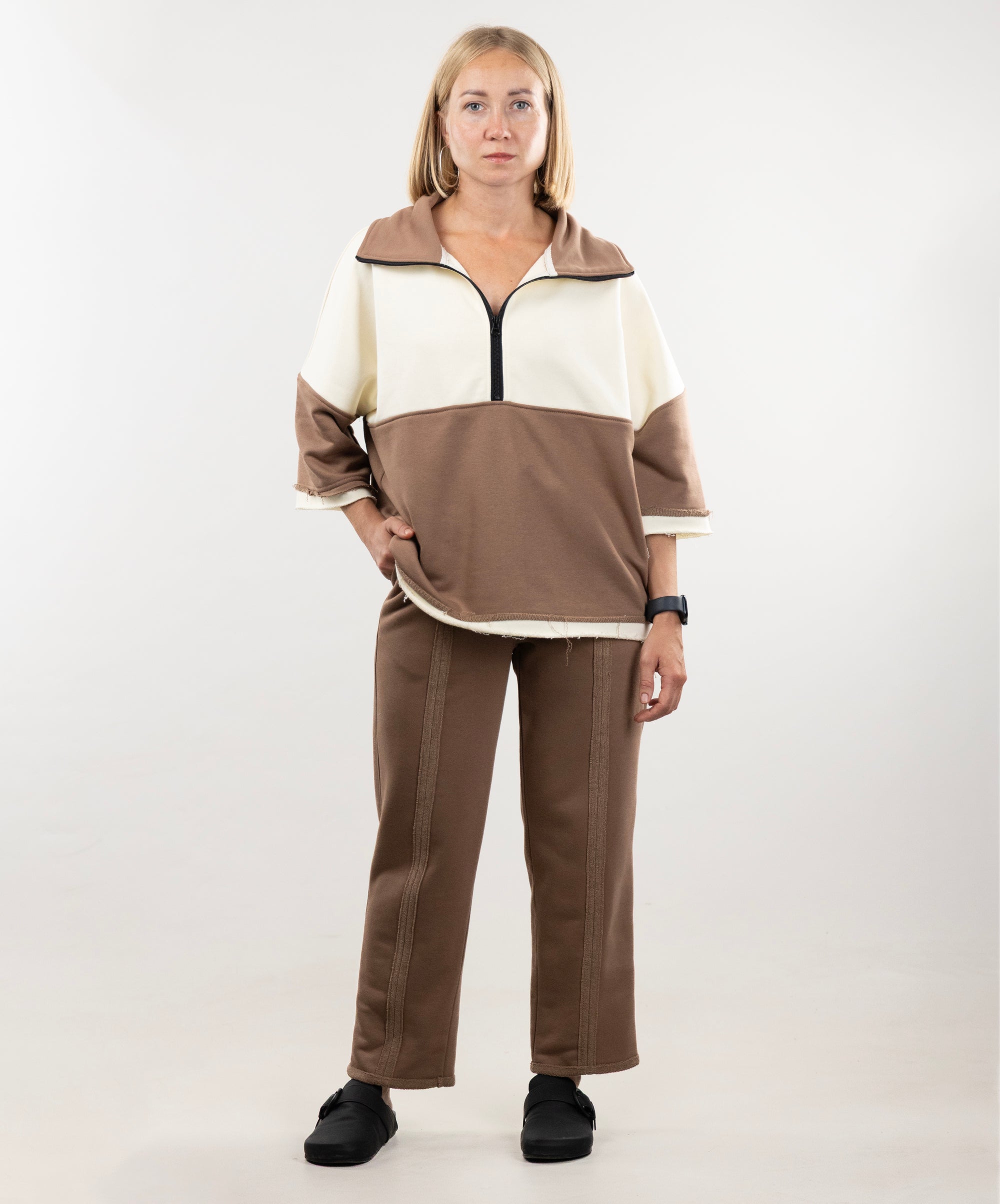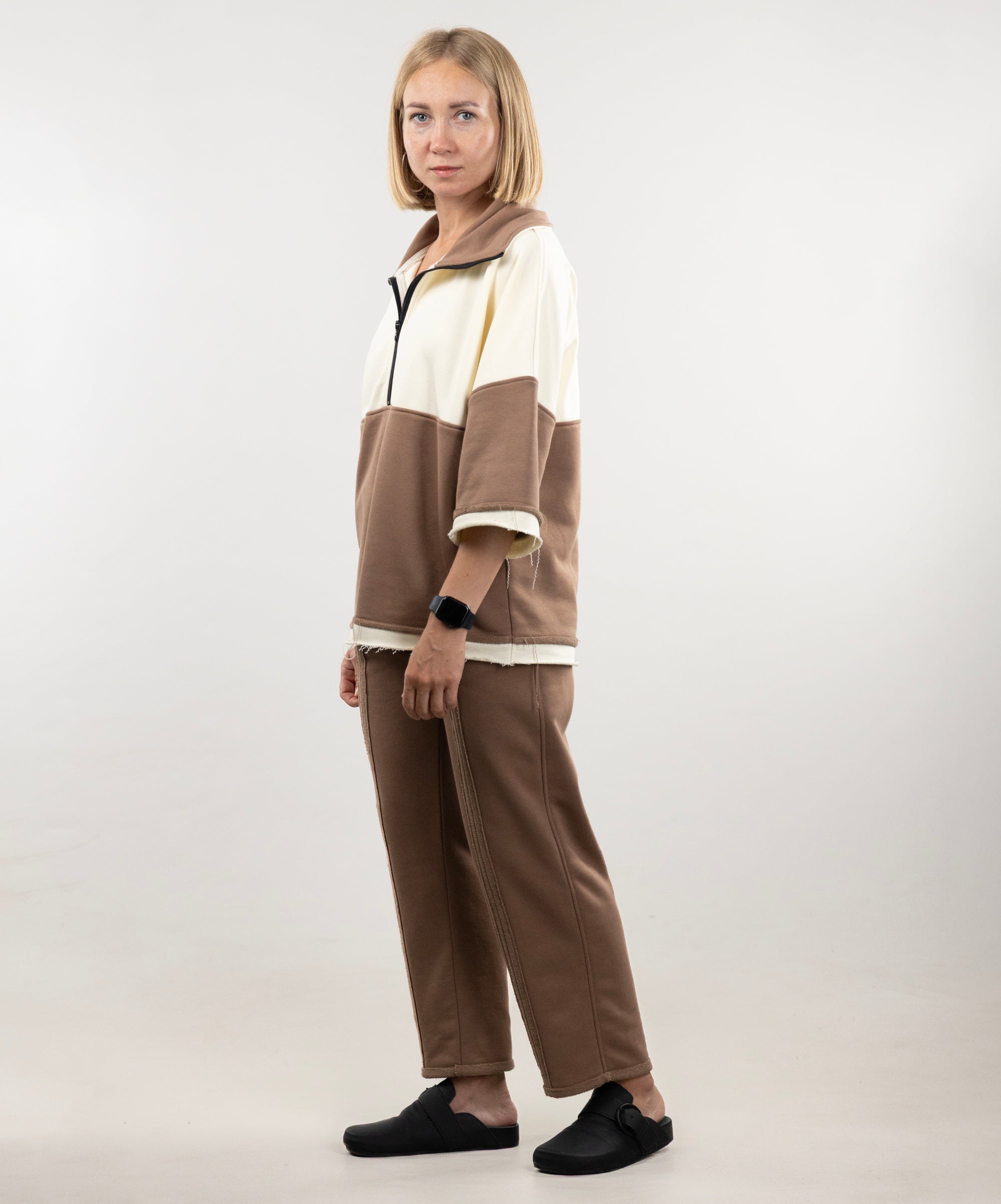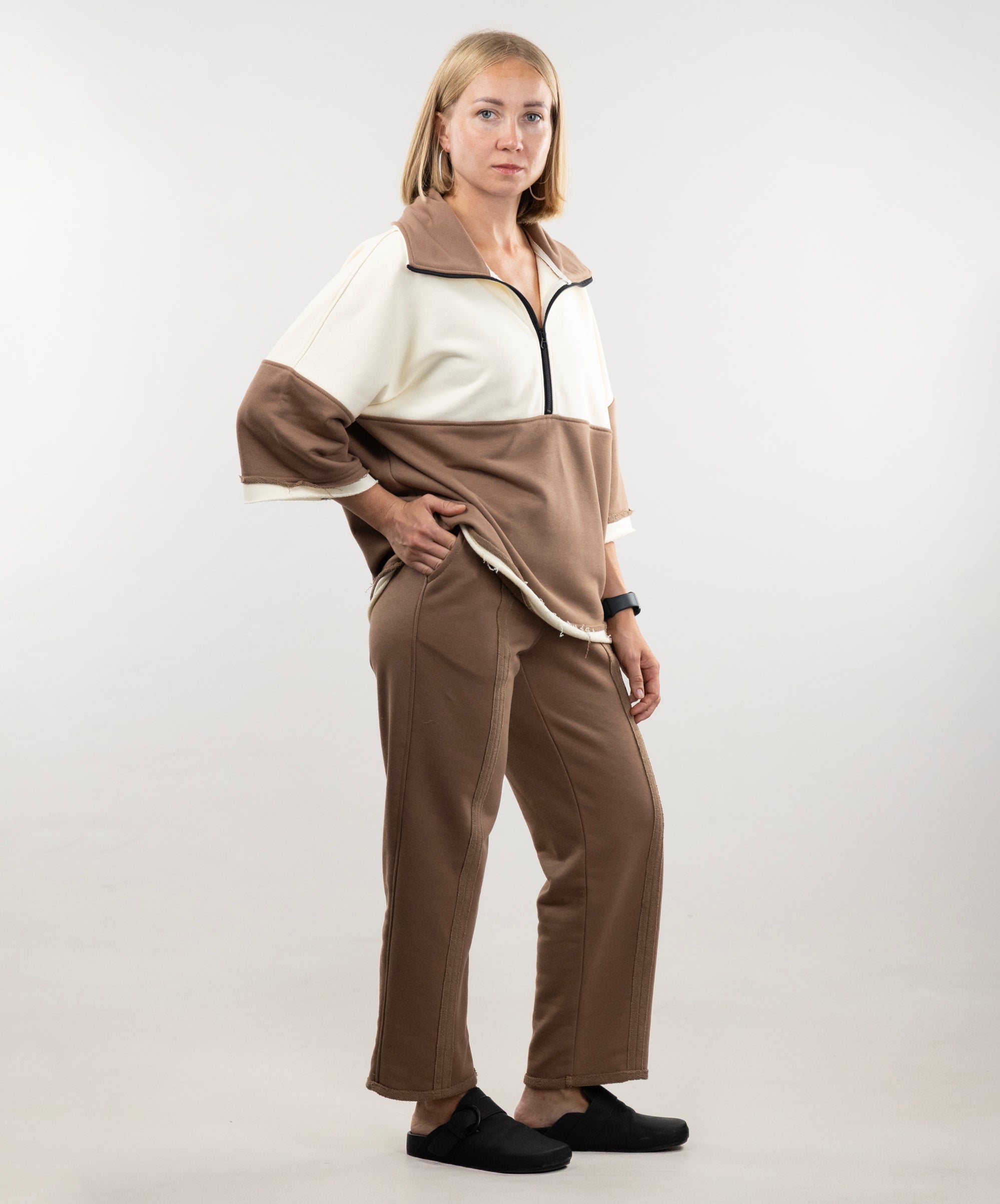 The pants have stitched darts in the front, so they look more like stylish casual pants than sportswear. We recommend pairing them with our Johnny T-shirt. This set is versatile: it's perfect for walks, work, and meetings in the city. Lightweight and comfortable, it's just right for the current weather 🍂